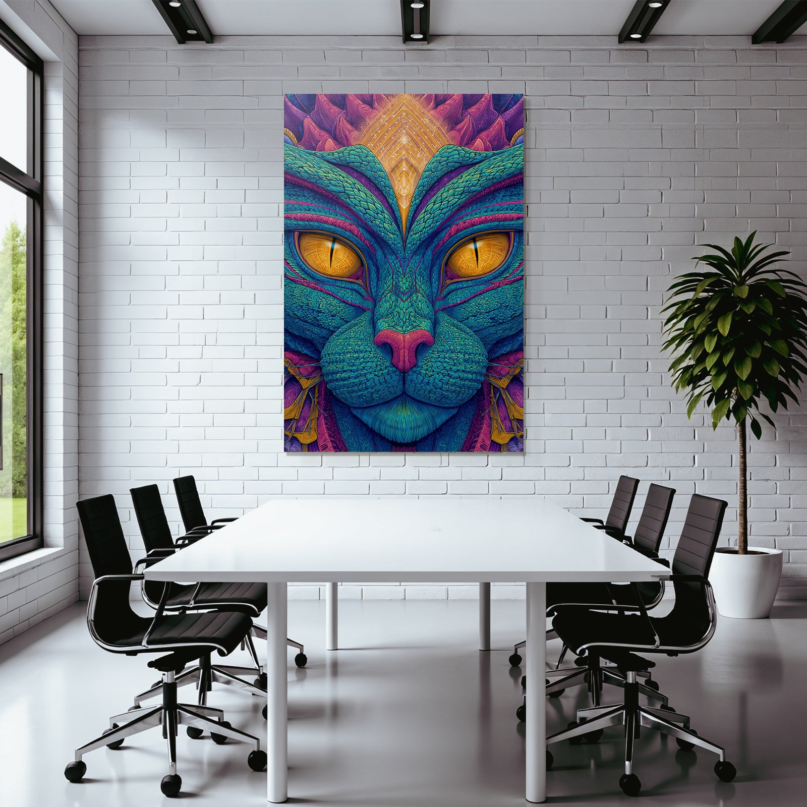 Modern, stilvoll, individüll: „Stilisierte Katze Mit Surrealen Farbmustern“ im Stil Psychedelische Kunst überzeugt im hochwertigen FameFrame™ durch klare Formen und starke Farben.