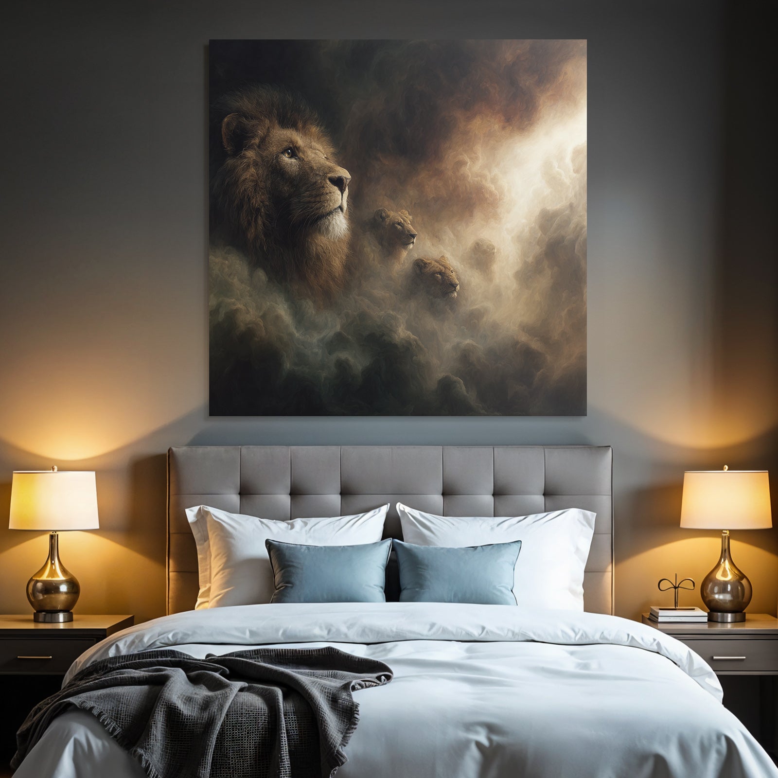 Setze Akzente im Esszimmer, Salon oder Praxisraum mit dem Kunstwerk „„Stilisierte Loewen Mit Dramatischem Hintergrund““ im Stil Grandeur Chic – gespannt im edlen FameFrame.