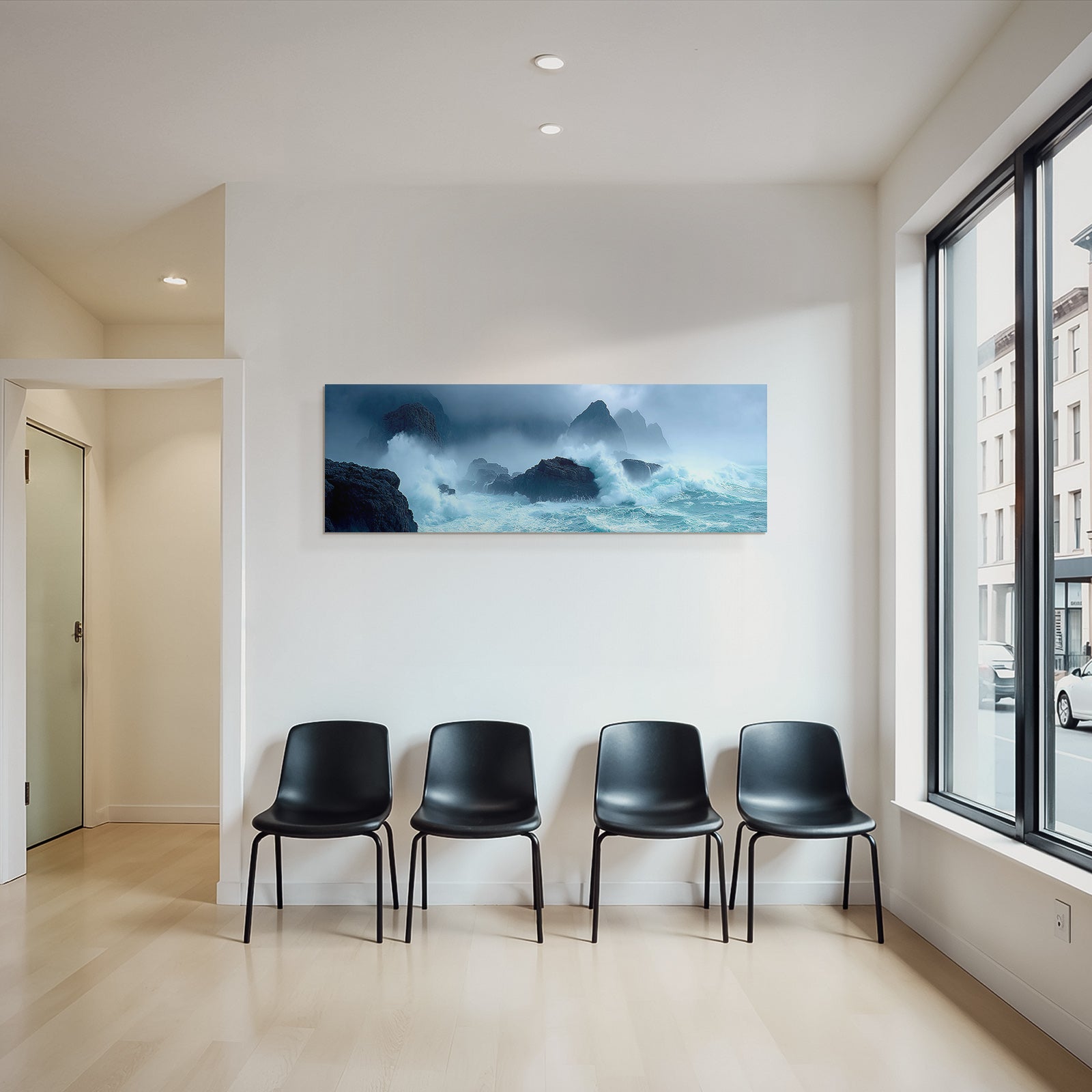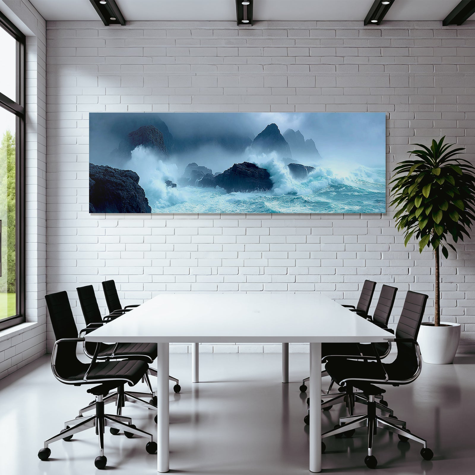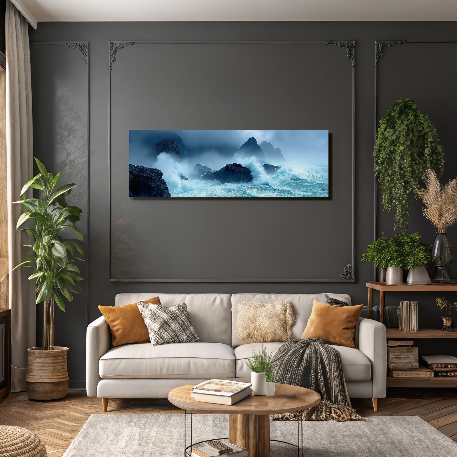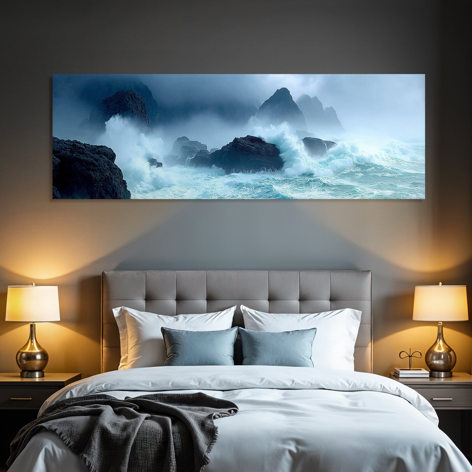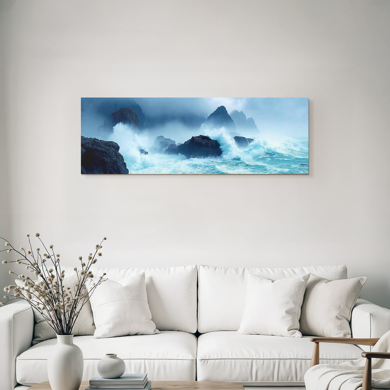 „Sturmsee Mit Gischt Felsen Und Nebel“ verbindet das Beste aus Nahaufnahmen mit modernem Textildruck – edel präsentiert im hochwertigen FameFrame.
