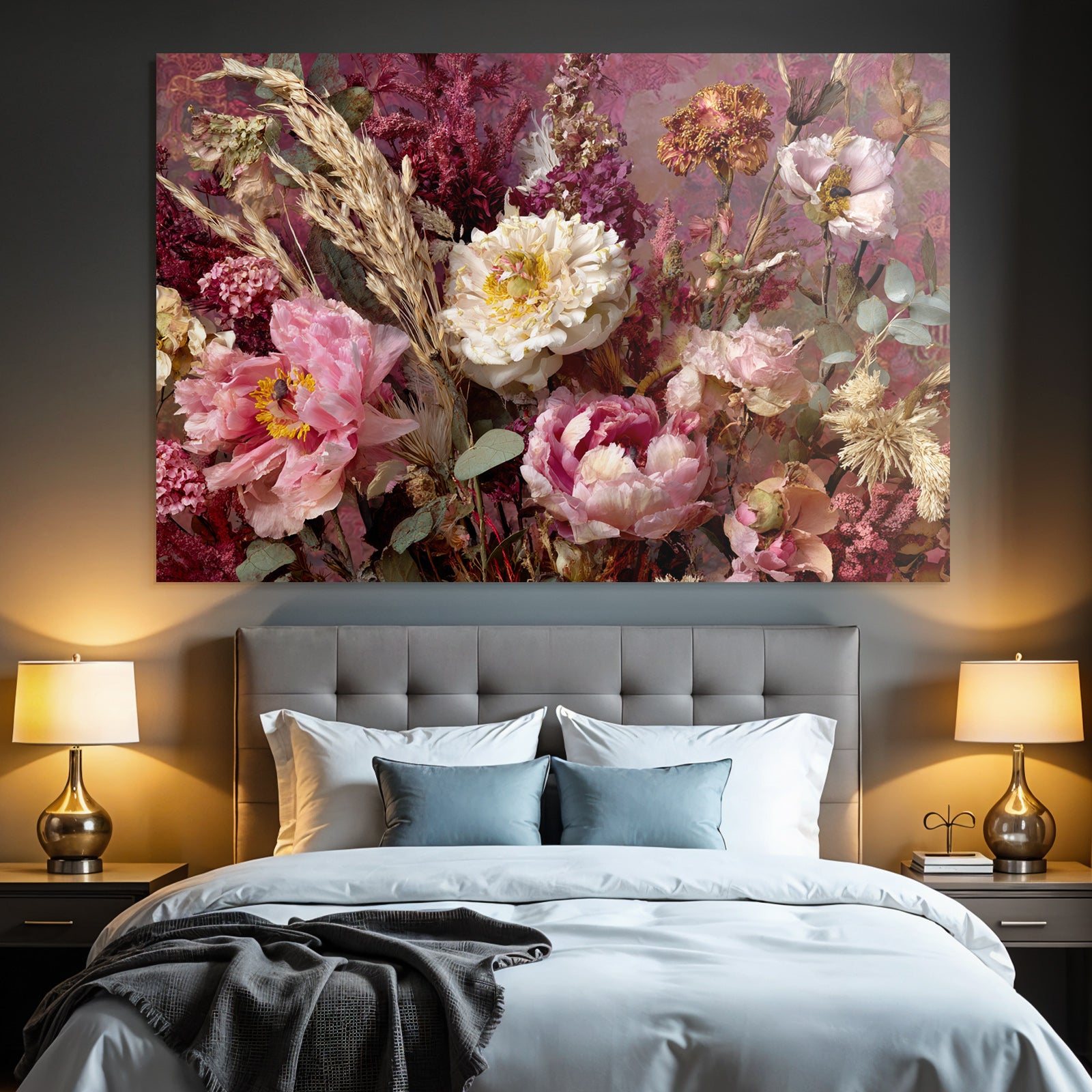 Eine Symbiose aus Kunst und Technik: Das Motiv „Trocken Retro Flowers Arrangement Blüten Getrocknete Pflanzen Wheat Eukalyptus“ im Stil Trockenblumen Retro Flowers entfaltet auf dem Hightech-Textil des FameFrame eine unvergleichliche Tiefenwirkung.