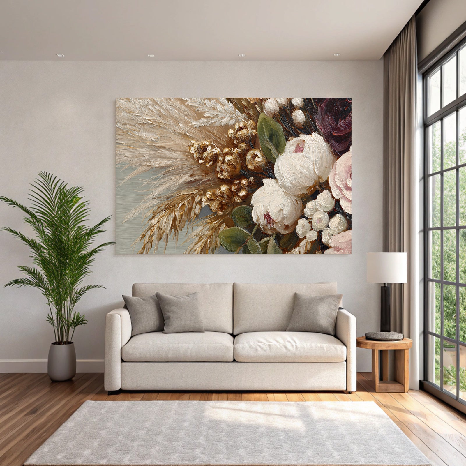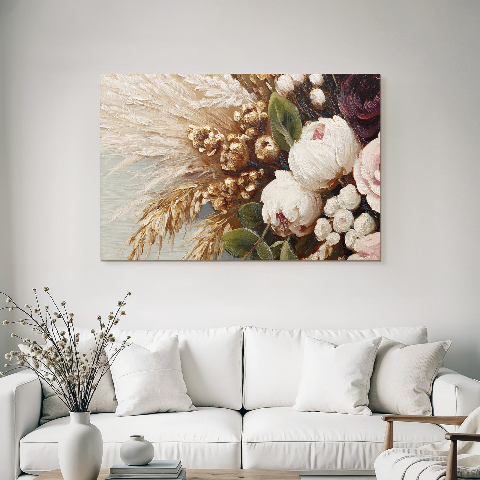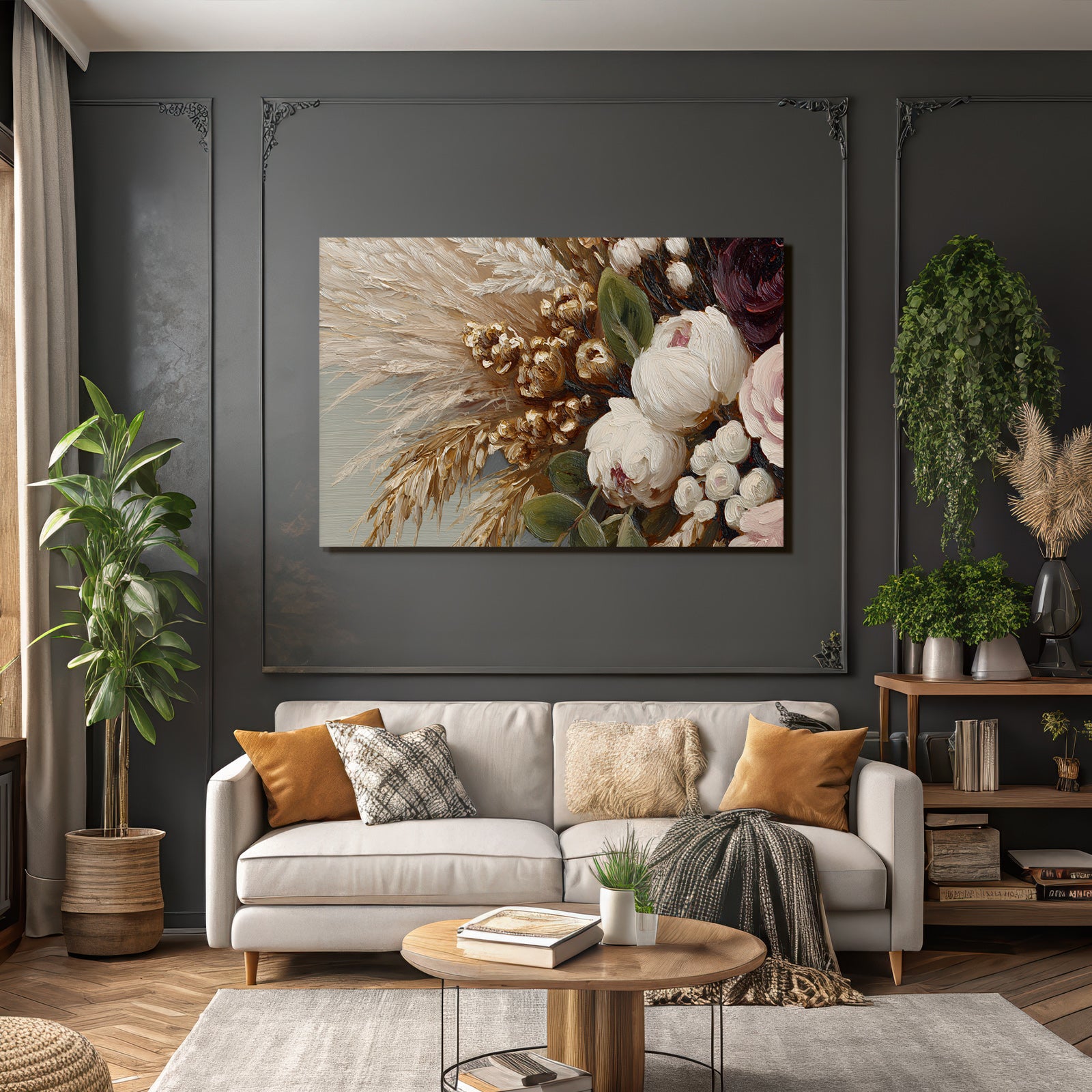 Ein Stück Trockenblumen Retro Flowers für Deine vier Wände: Das Werk „Trocken Retro Flowers Gesteck Detail Malerischer Stil“ im hochwertigen FameFrame bringt kreative Energie in jeden Raum.