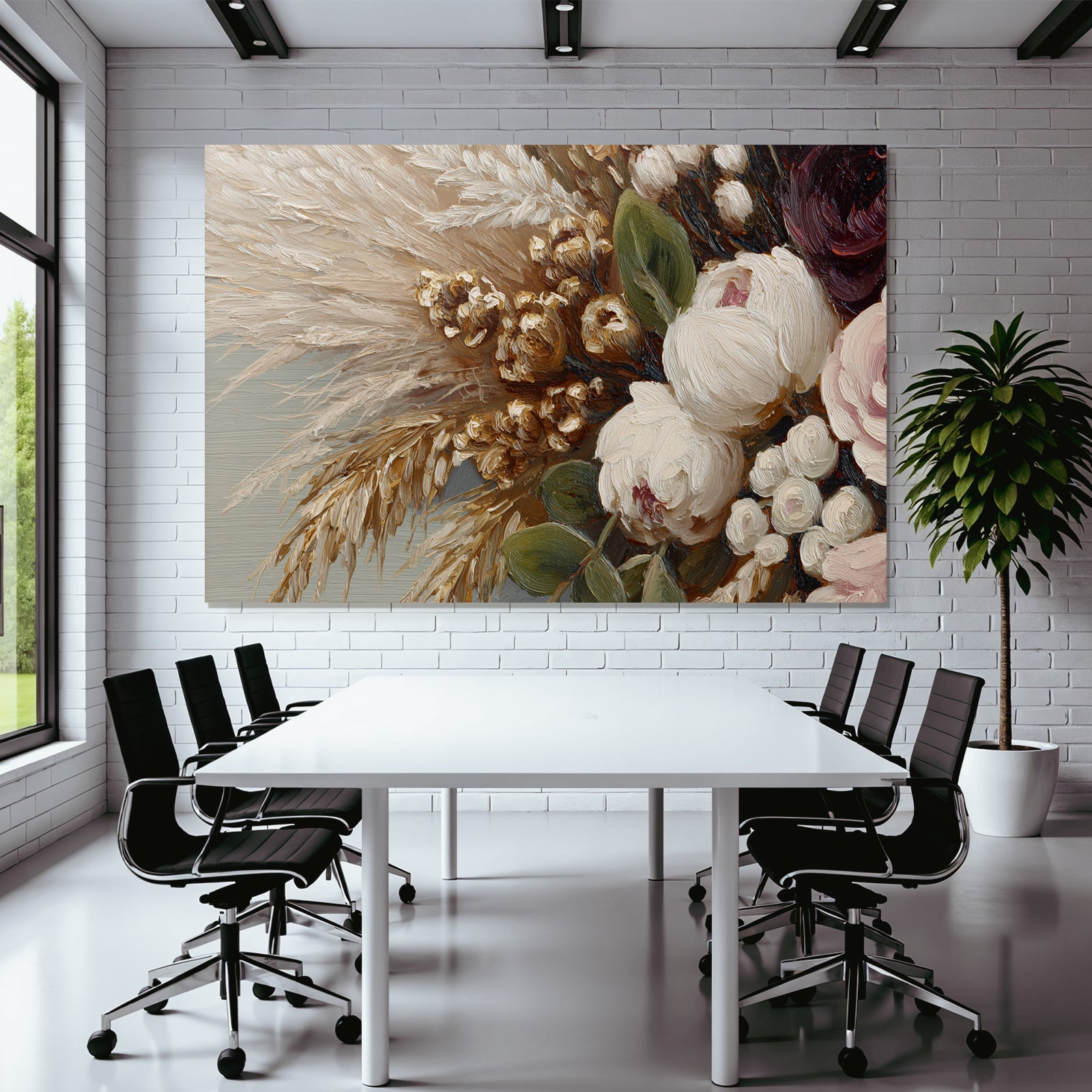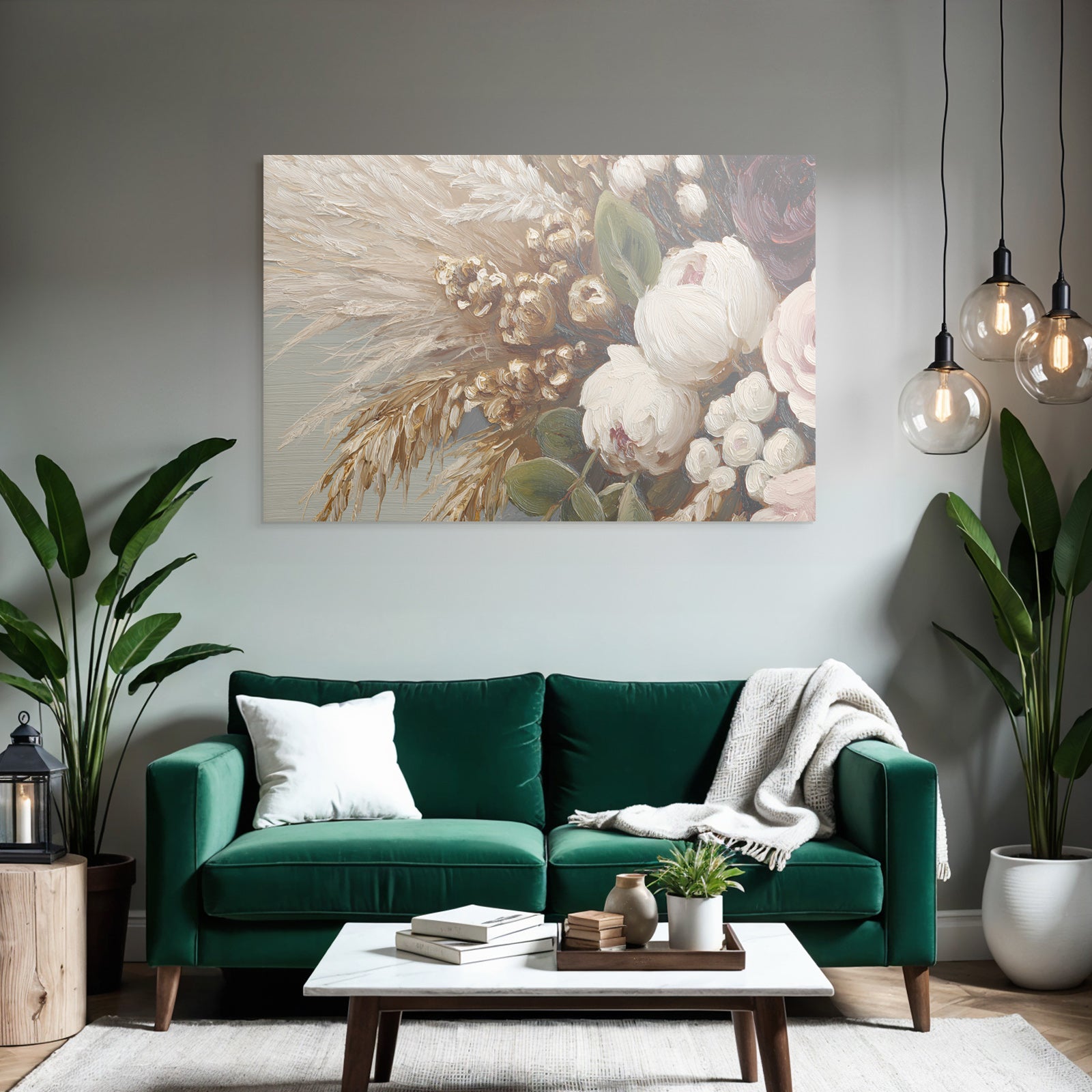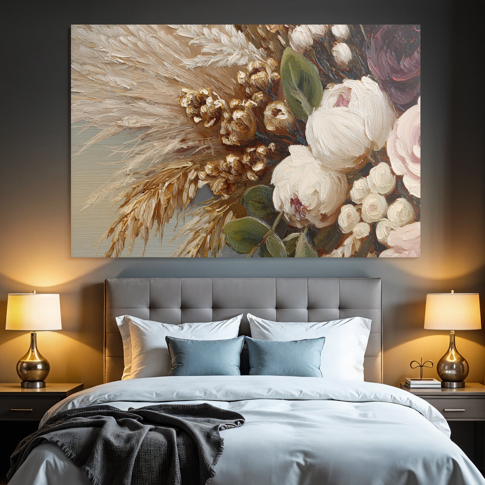Ein Stück Trockenblumen Retro Flowers für Deine vier Wände: Das Werk „Trocken Retro Flowers Gesteck Detail Malerischer Stil“ im hochwertigen FameFrame bringt kreative Energie in jeden Raum.