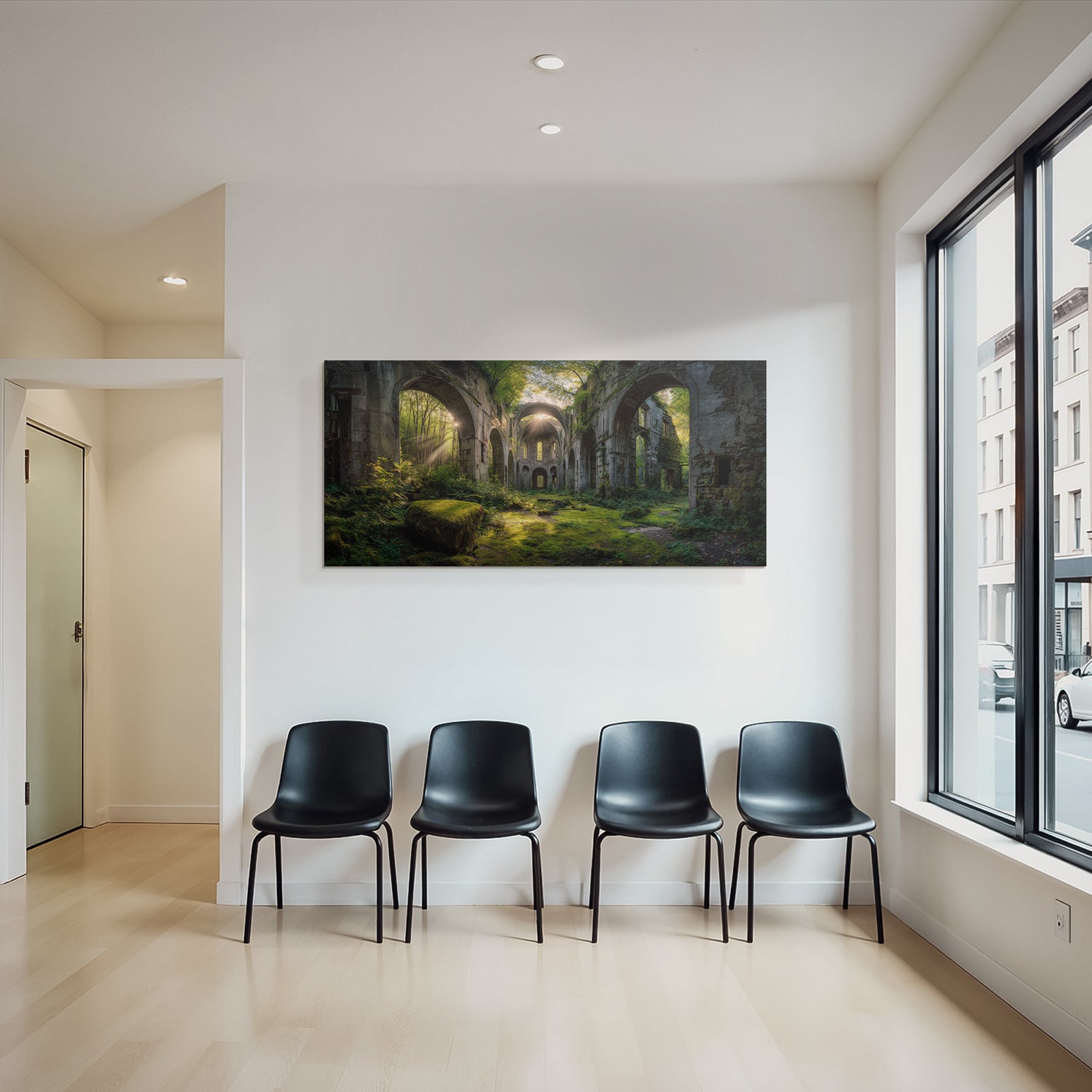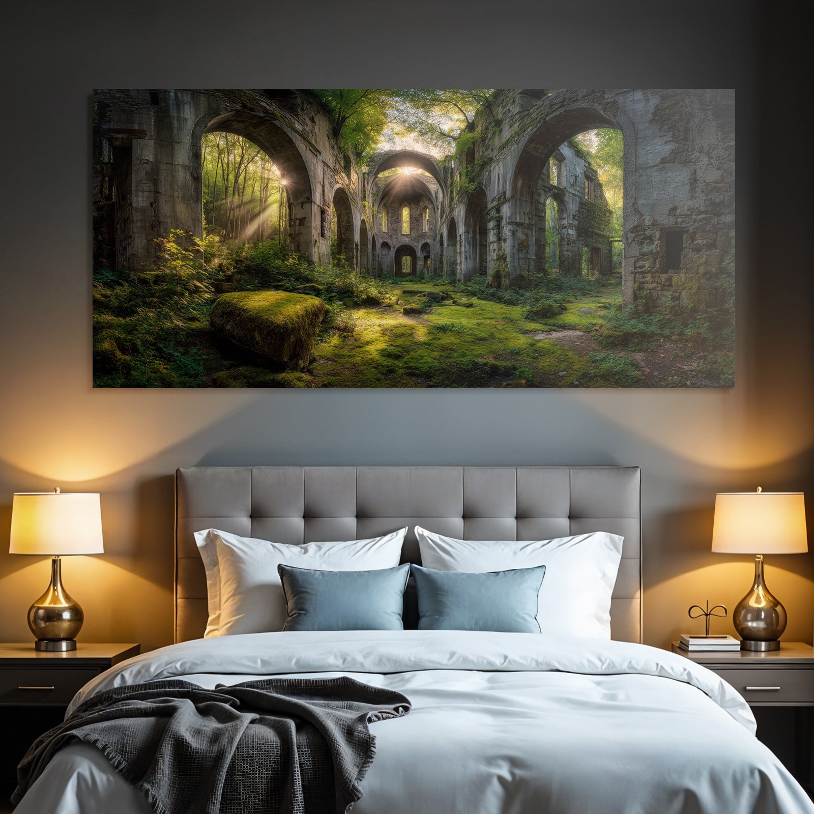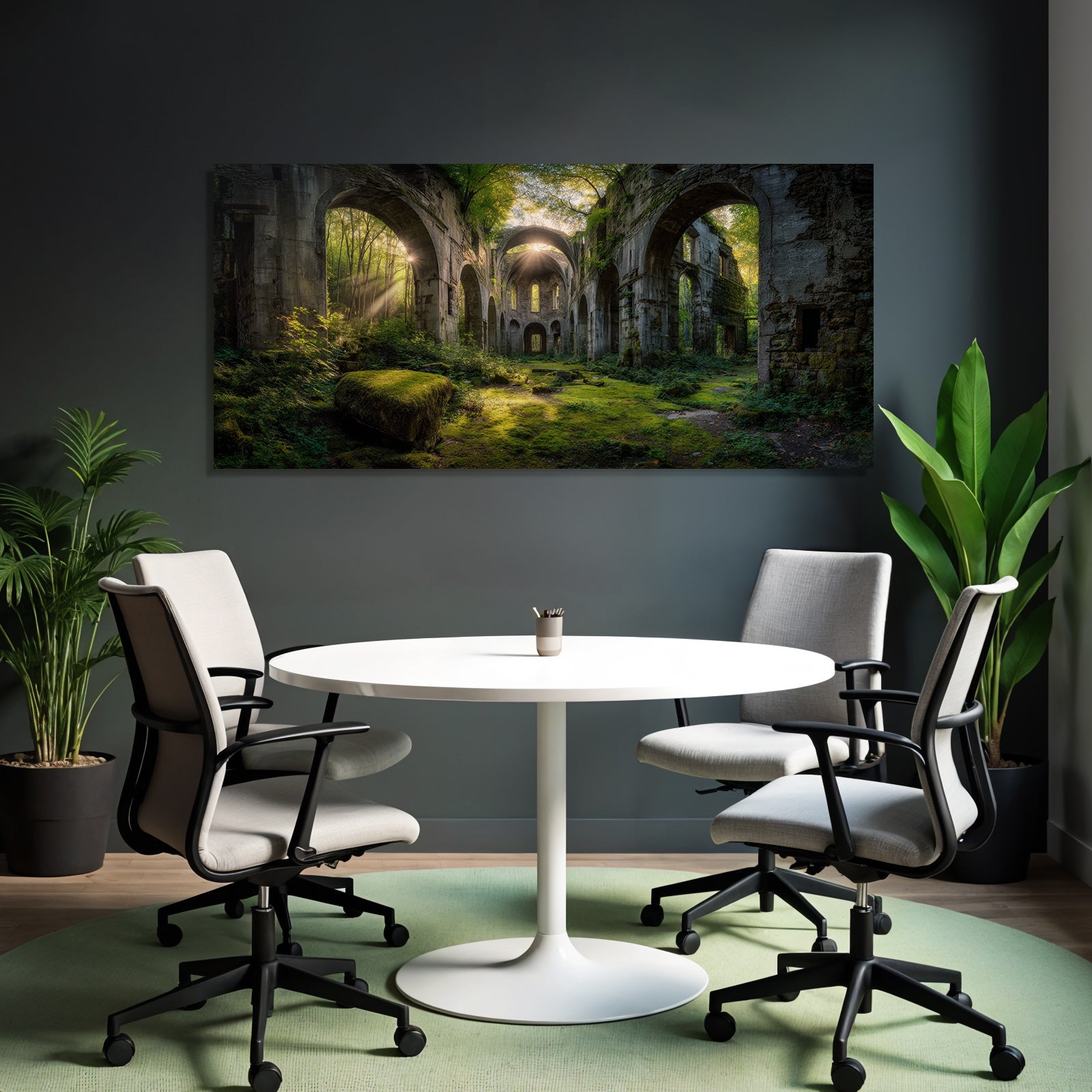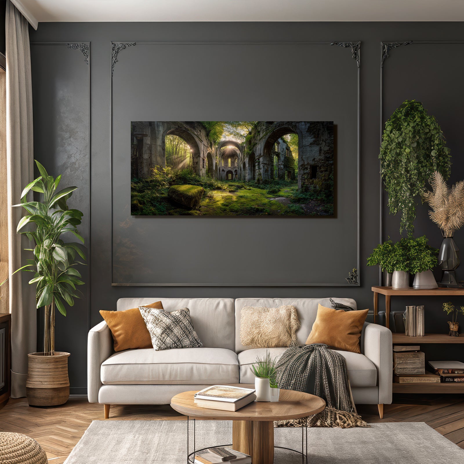 „Überwachsene Ruine Umgeben Von Grünem Lichtdurchflutete Atmosphäre“ bringt den Stil Lost Places an Deine Wand – perfekt für Schlafzimmer, Homeoffice oder Besprechungsräume, edel gerahmt im FameFrame™.