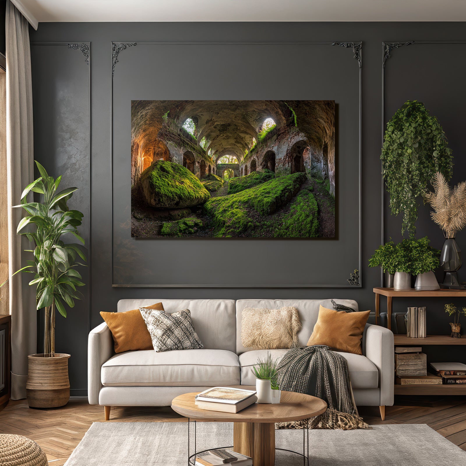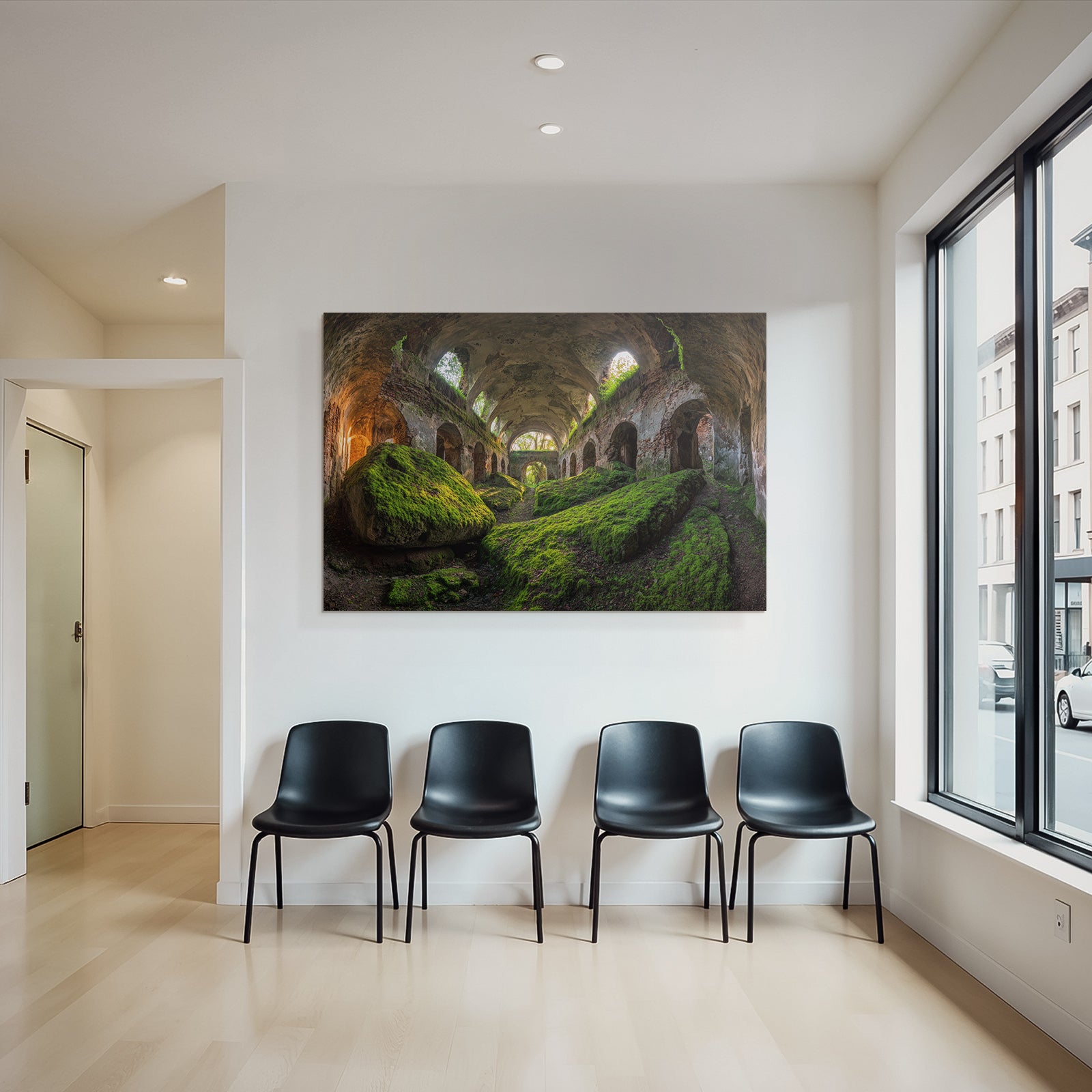 Mit dem Werk „Verfallenes Gebaeude Mit Vorwuchernder Vegetation“ im Stil Lost Places gestaltest Du Dein Wartezimmer oder Deine Hotel-Lobby eindrucksvoll und modern – auf Stoff im FameFrame™.