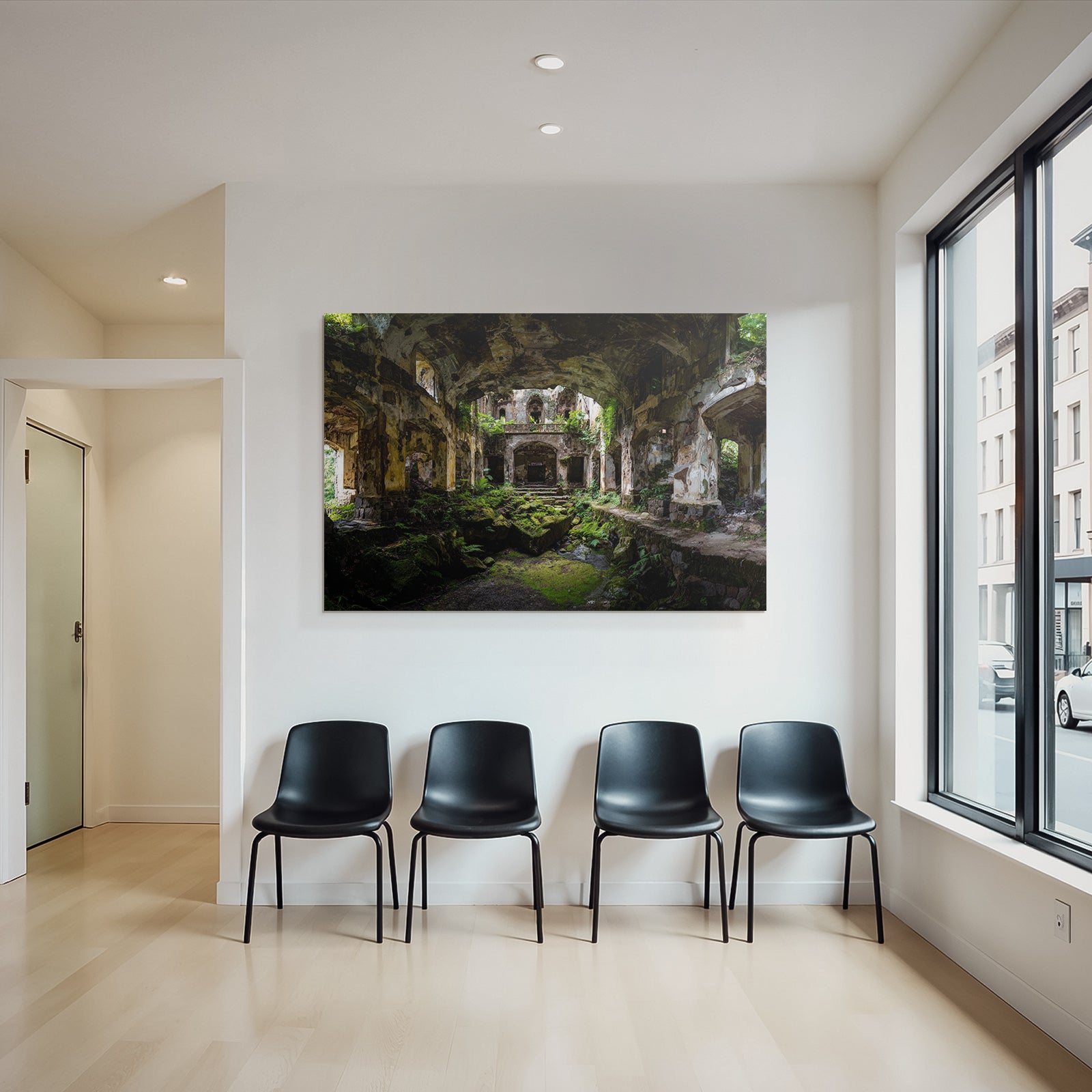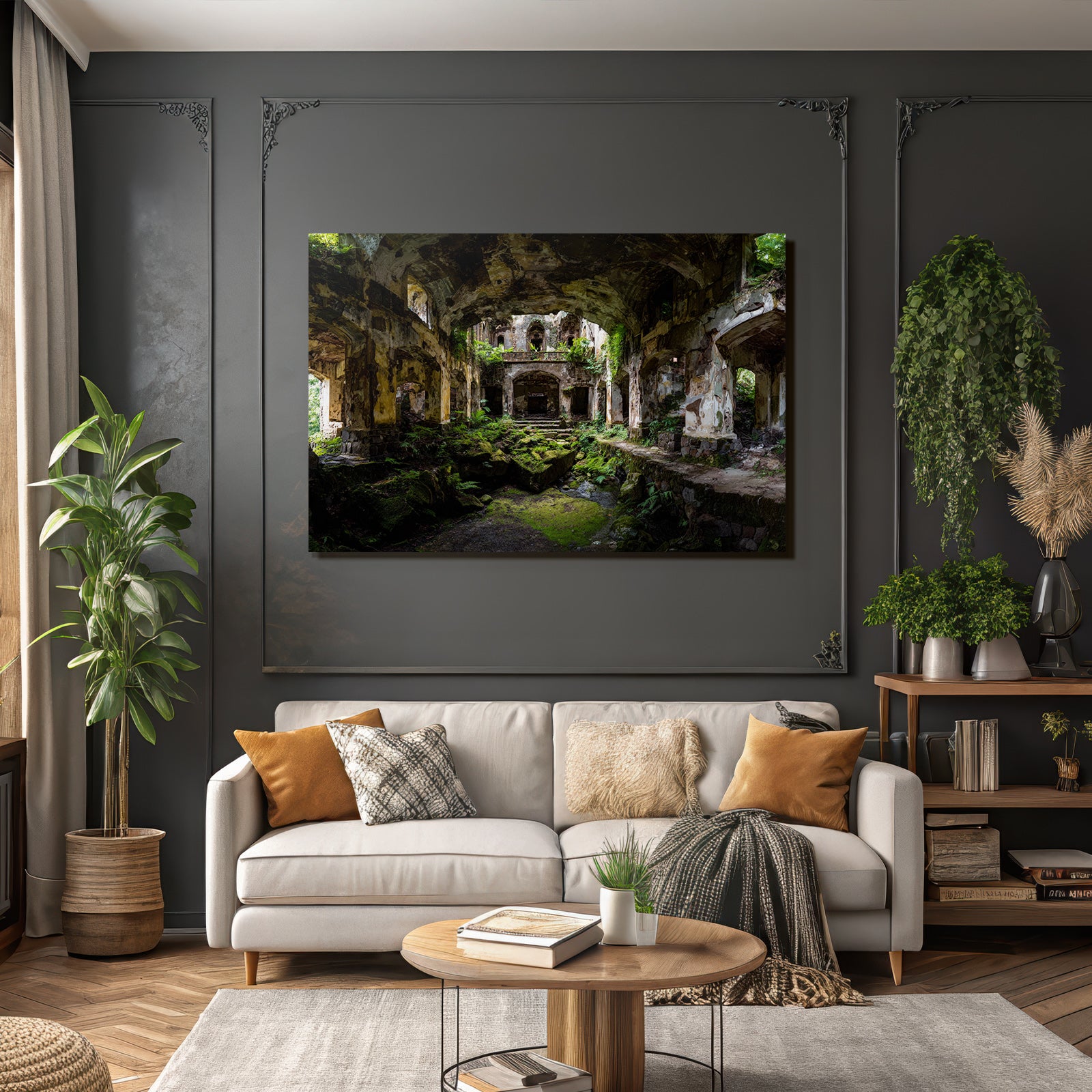 Setze stilvolle Akzente mit Kunst im Look von Lost Places. Das Werk „Verfallenes Gebaeude Von Natur Eingehüllt“ entfaltet im edlen FameFrame™ seine volle Wirkung.