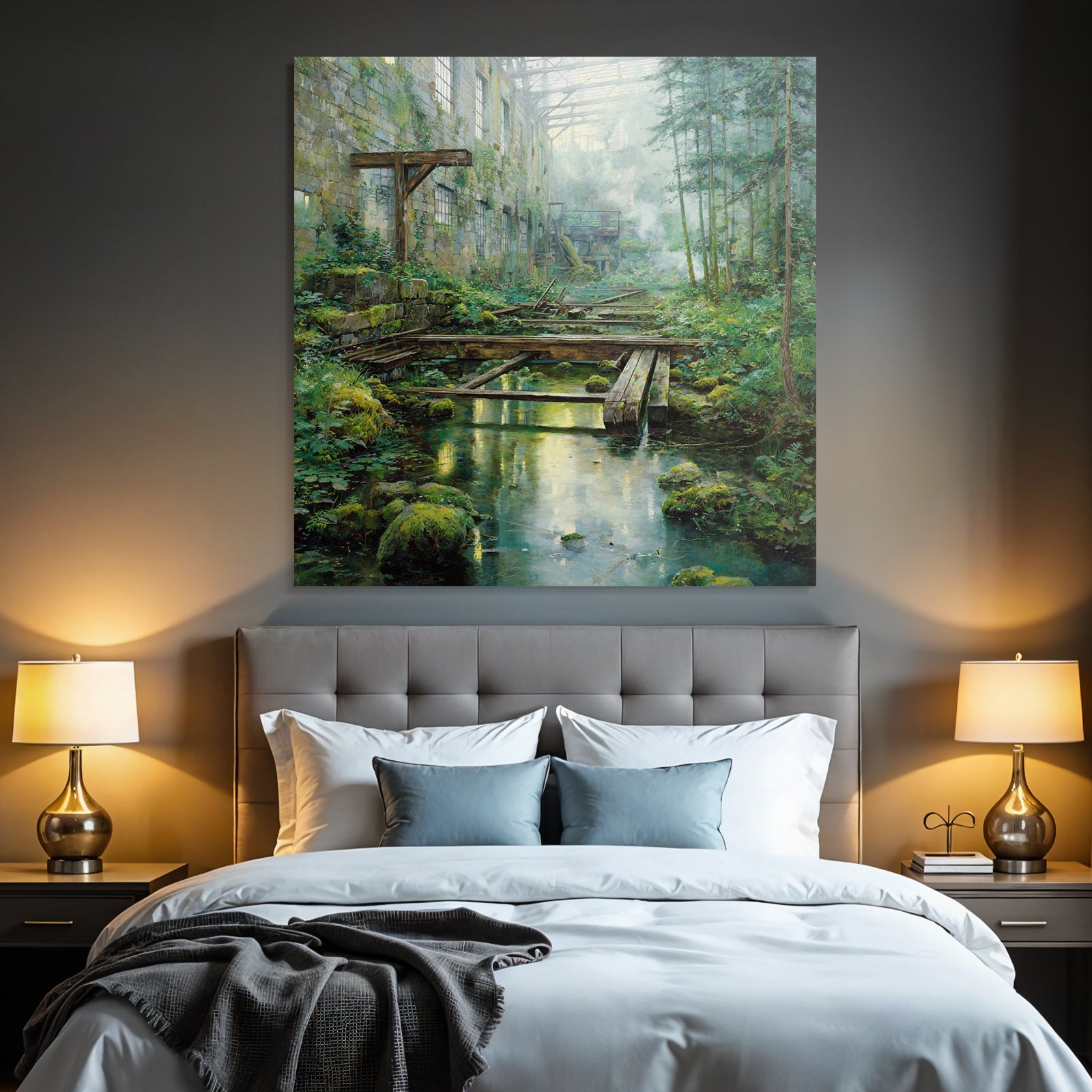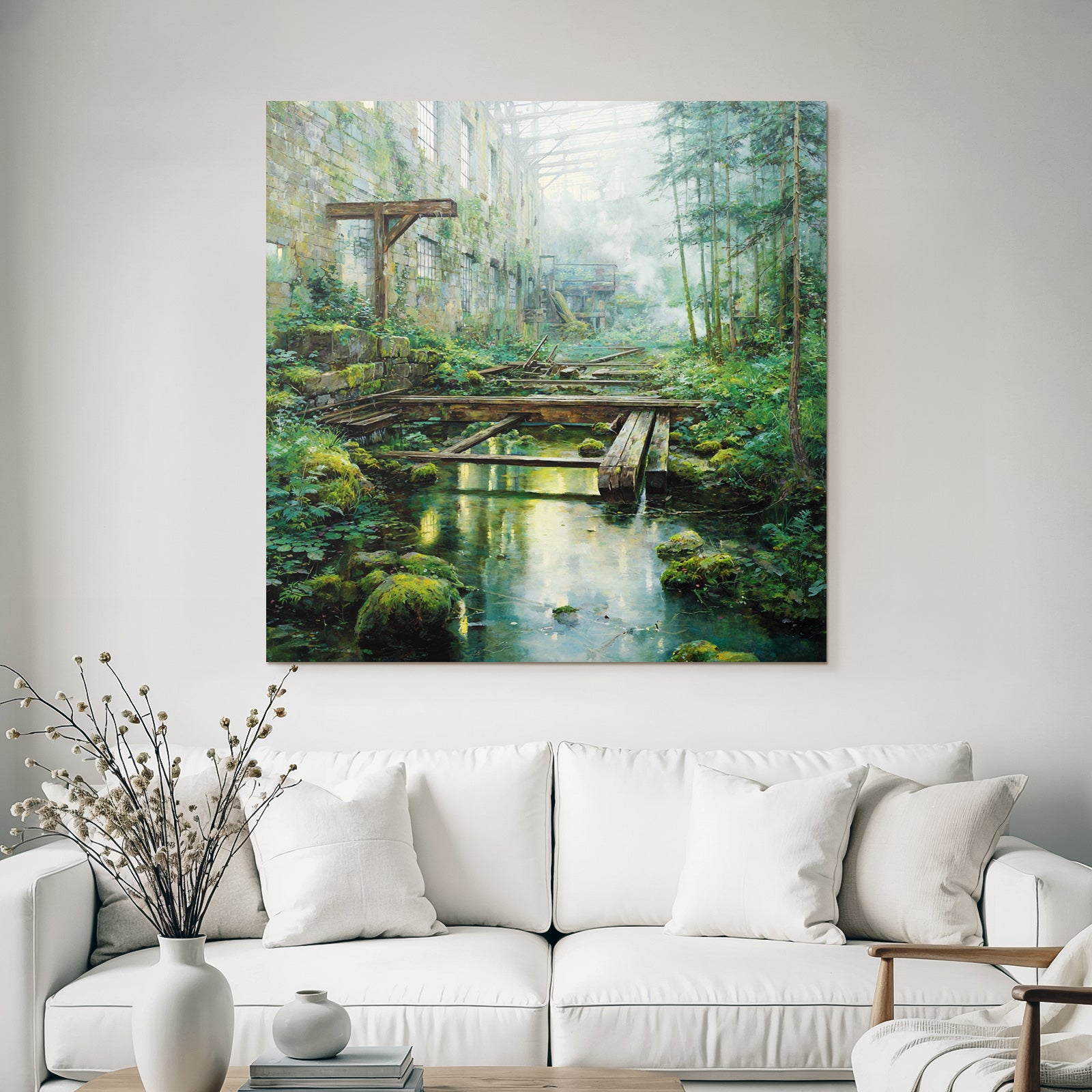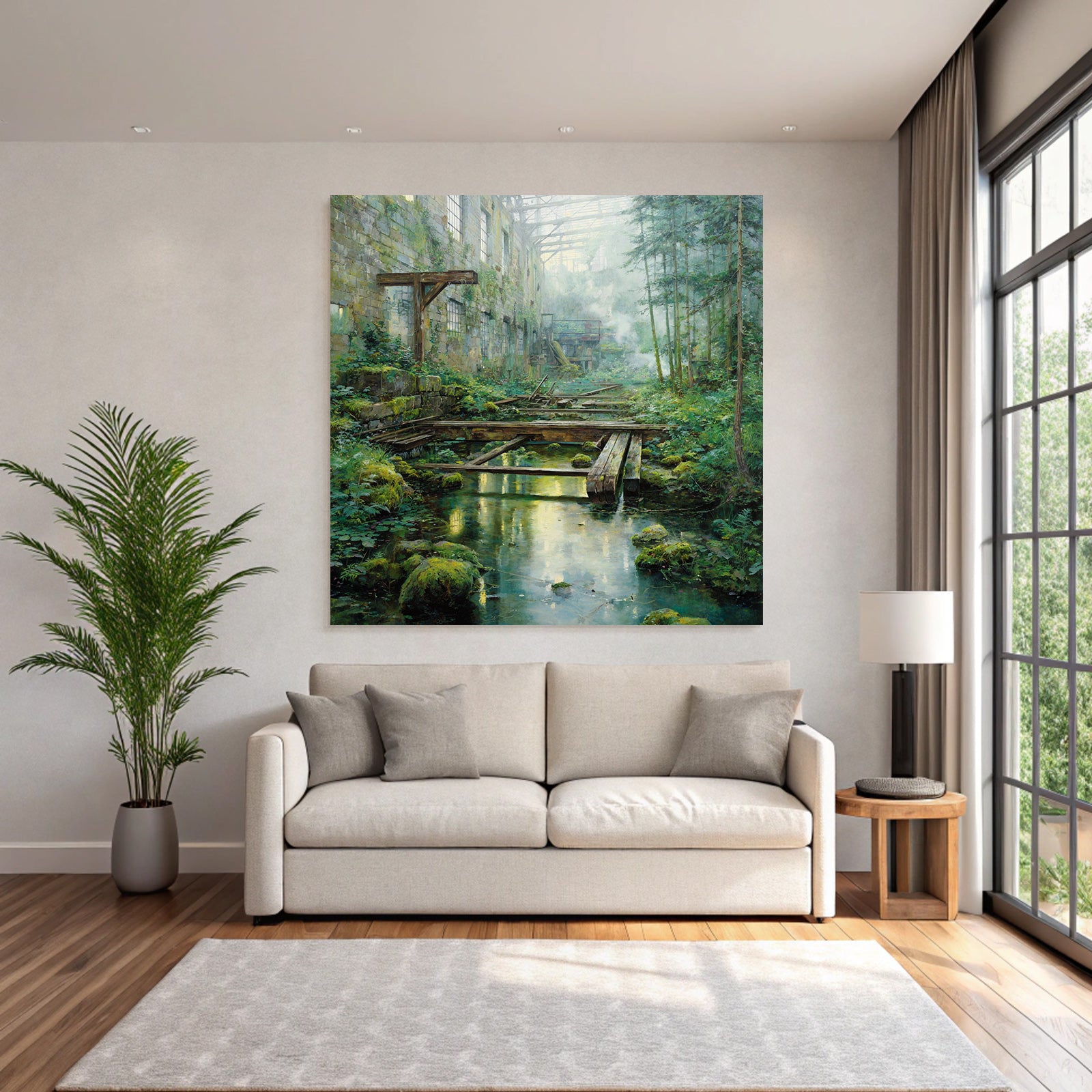 „Verlassene Industrie Überwuchert Durch Natur Mit Sonnenlicht Reflexionen“ im Stil Lost Places sorgt für stilvolle Ruhe im Schlafzimmer oder inspirierende Energie im Büro – perfekt im FameFrame™ inszeniert.