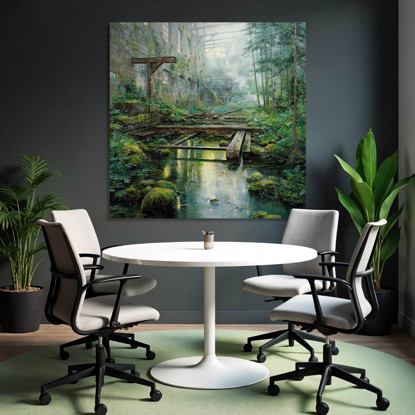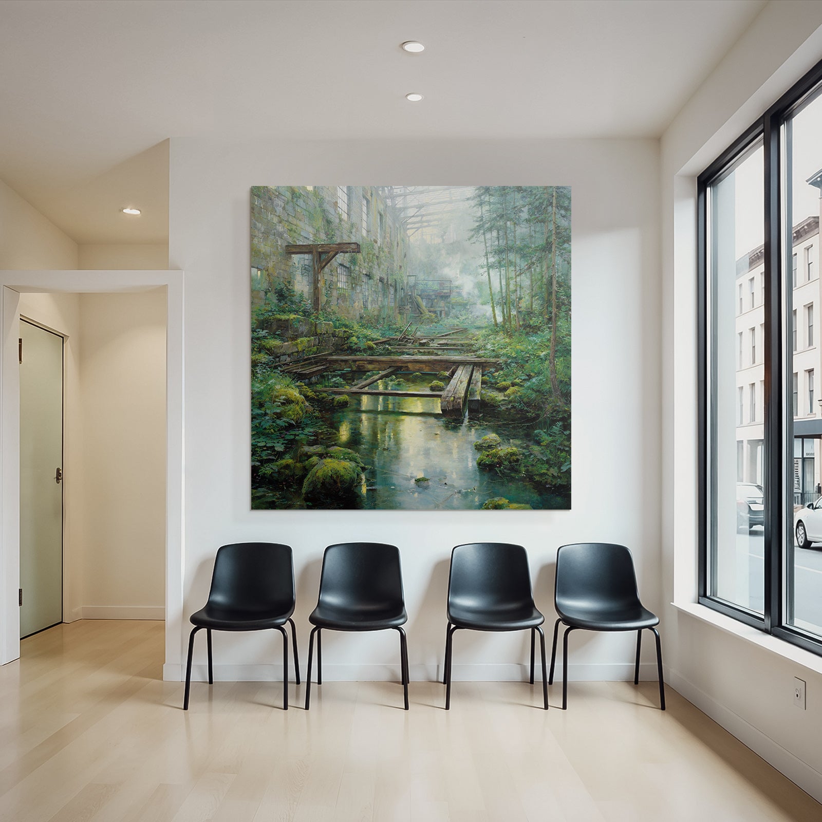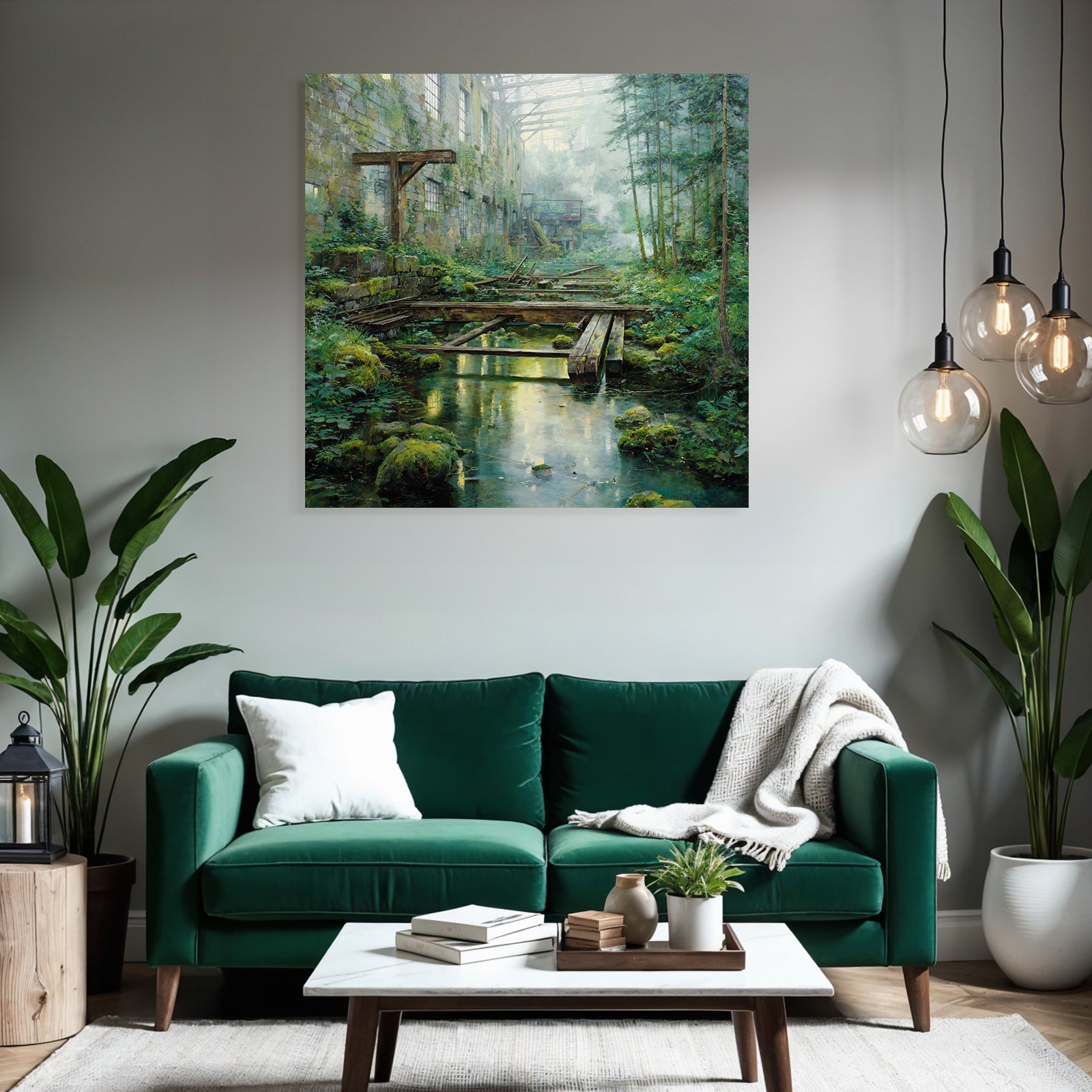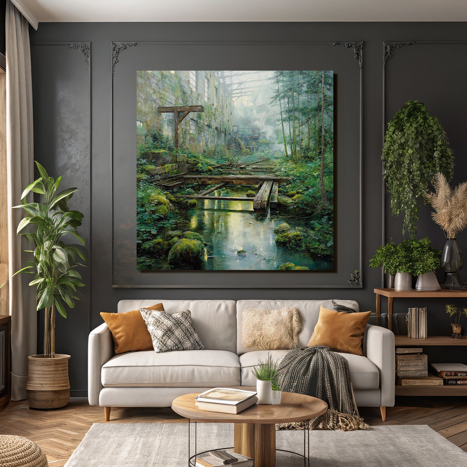 „Verlassene Industrie Überwuchert Durch Natur Mit Sonnenlicht Reflexionen“ im Stil Lost Places sorgt für stilvolle Ruhe im Schlafzimmer oder inspirierende Energie im Büro – perfekt im FameFrame™ inszeniert.