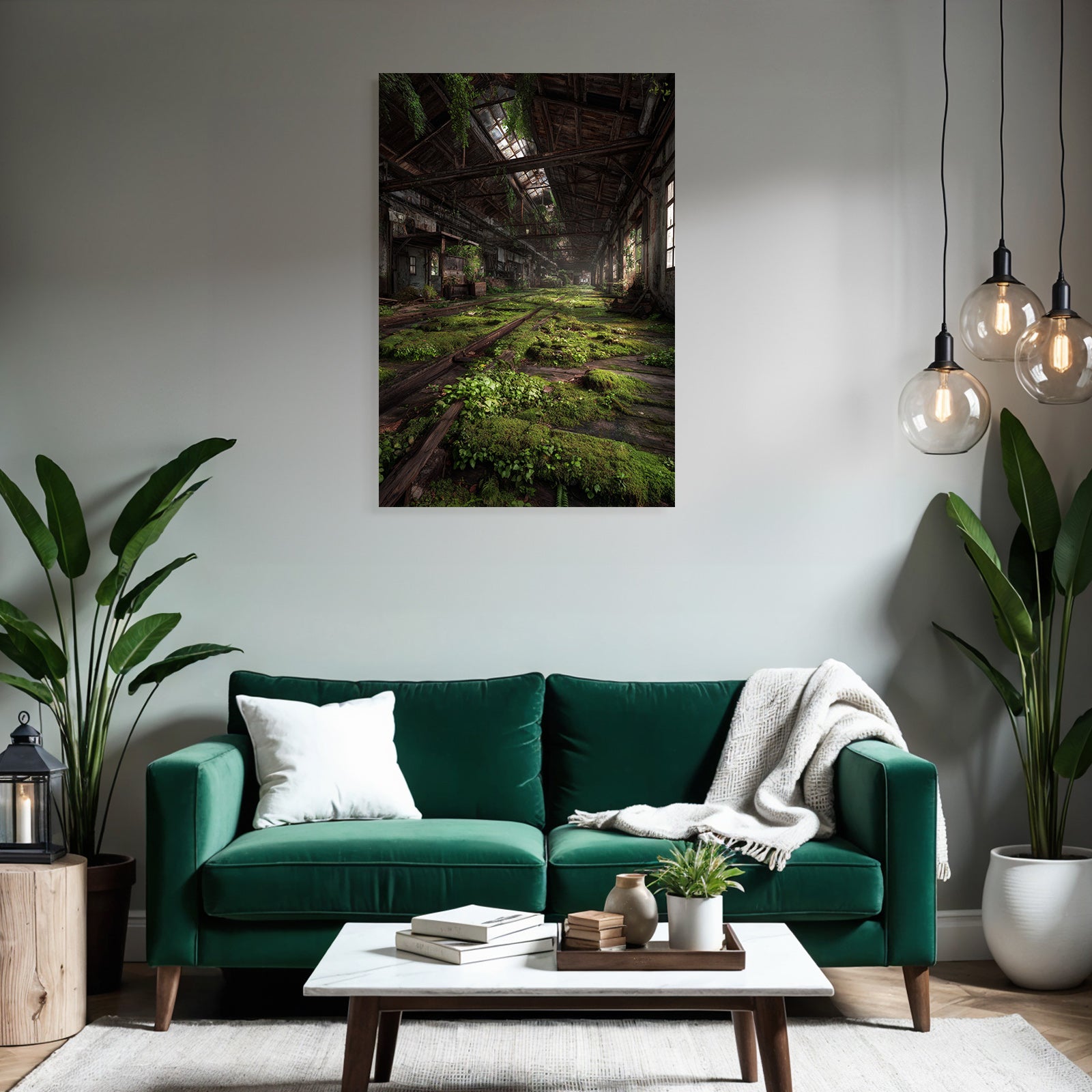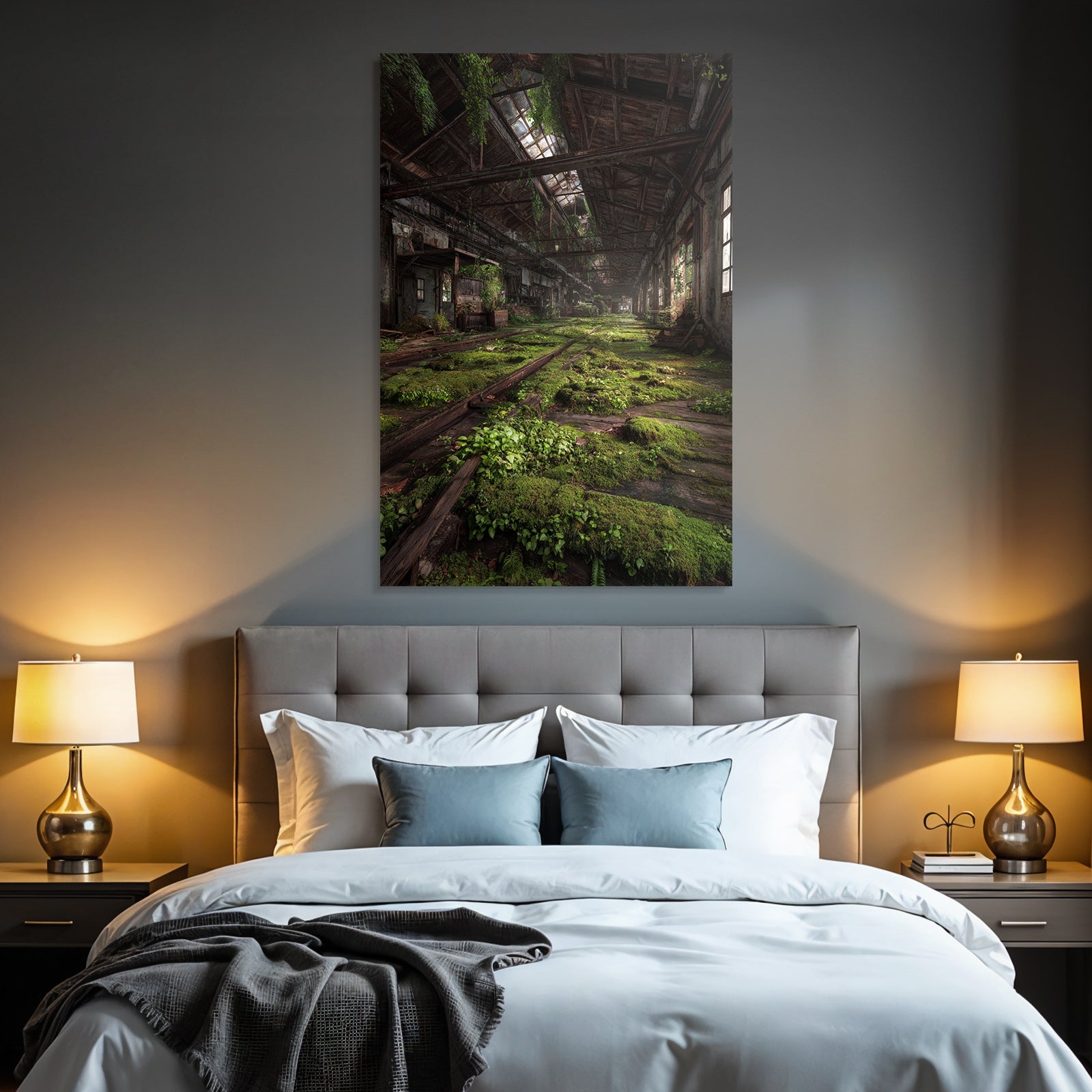 Mit dem Werk „Verlassene Industrielle Raum Natur Erobert Menschen Made Orte“ im Stil Lost Places gestaltest Du Dein Wartezimmer oder Deine Hotel-Lobby eindrucksvoll und modern – auf Stoff im FameFrame™.