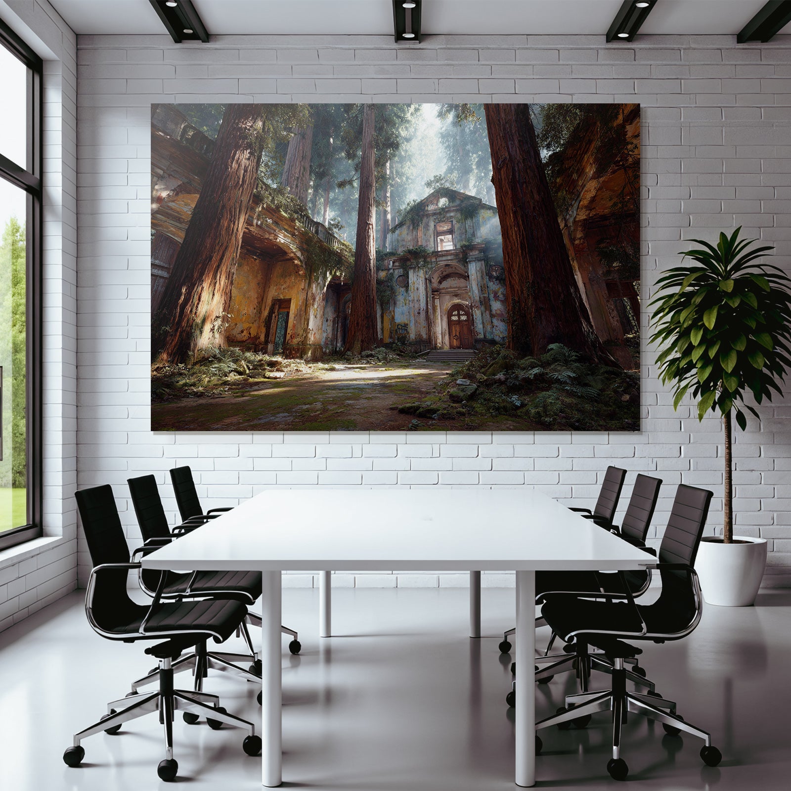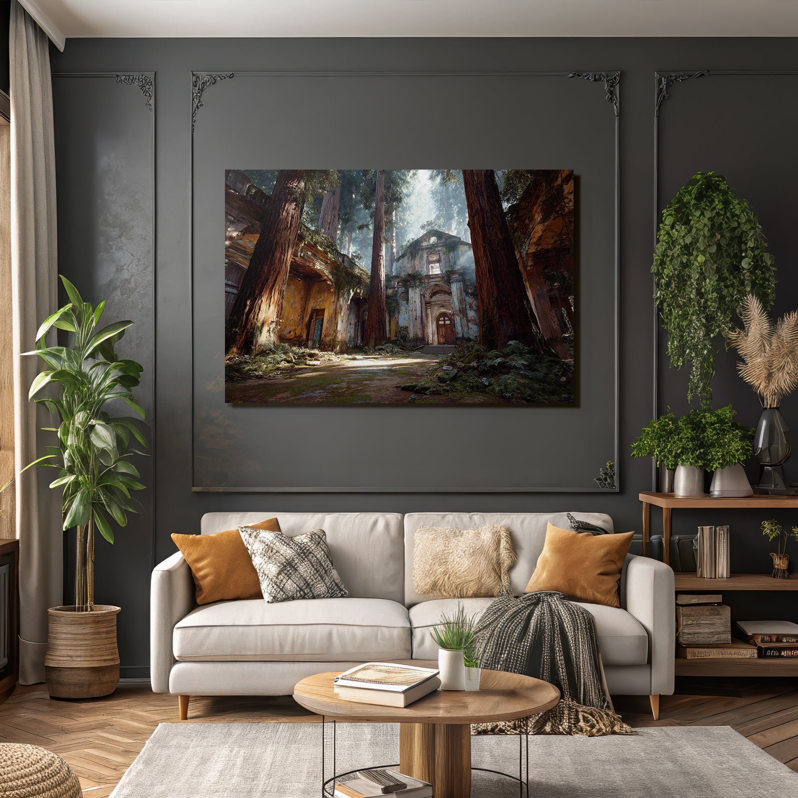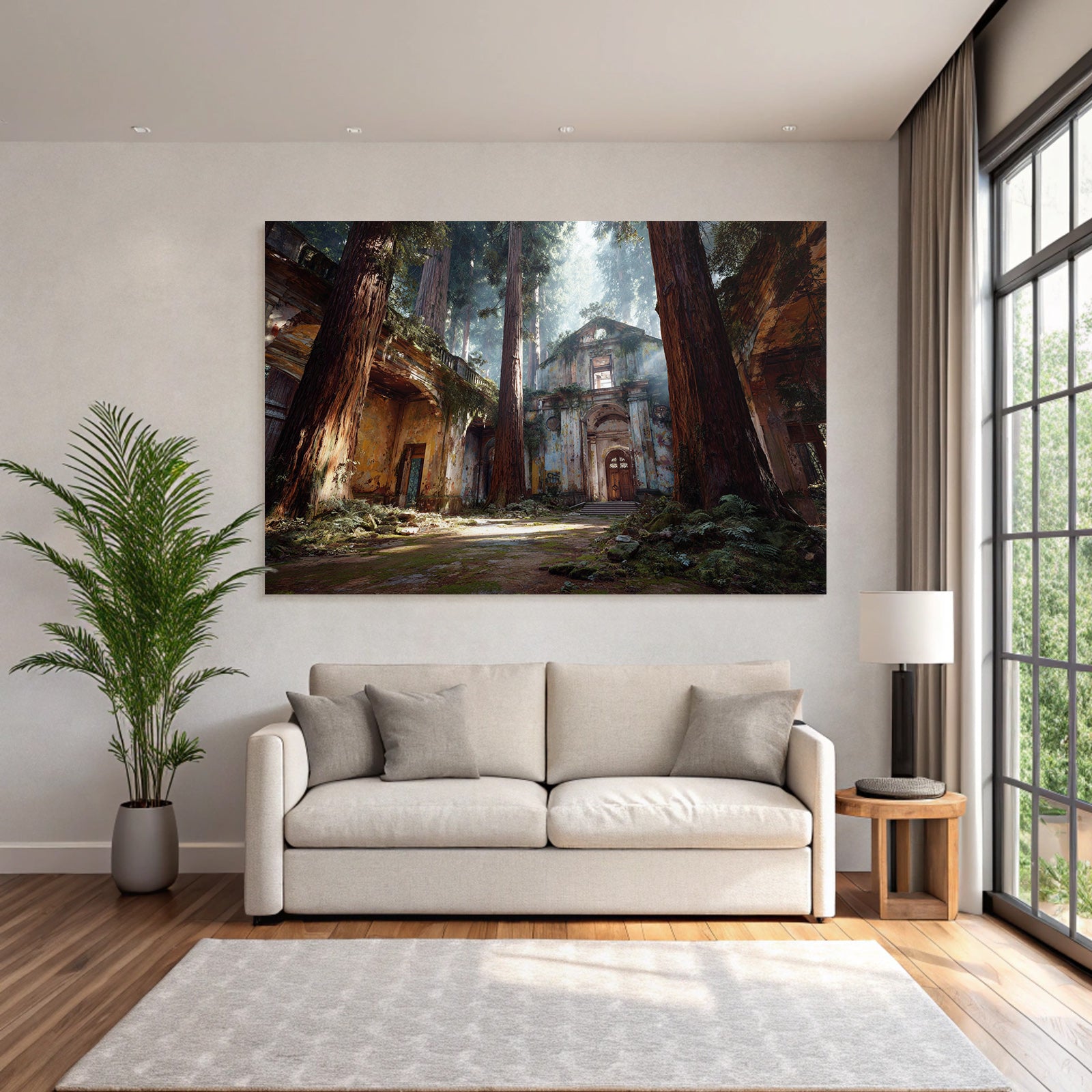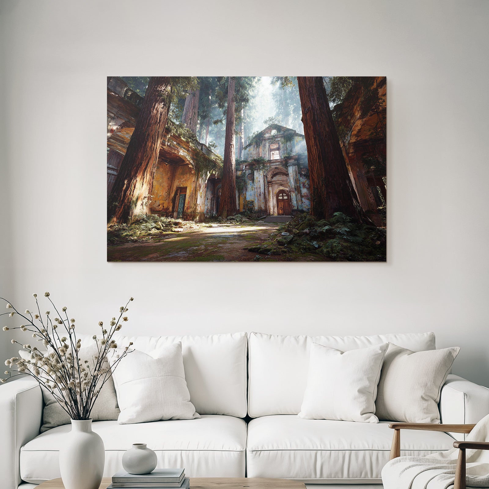 Das Motiv „Verlassene Struktur Umgeben Von Baeumen Im Licht Der Natur“ ist ein Highlight der Kollektion Lost Places und wird auf Deinem FameFrame™ brillant in Szene gesetzt.