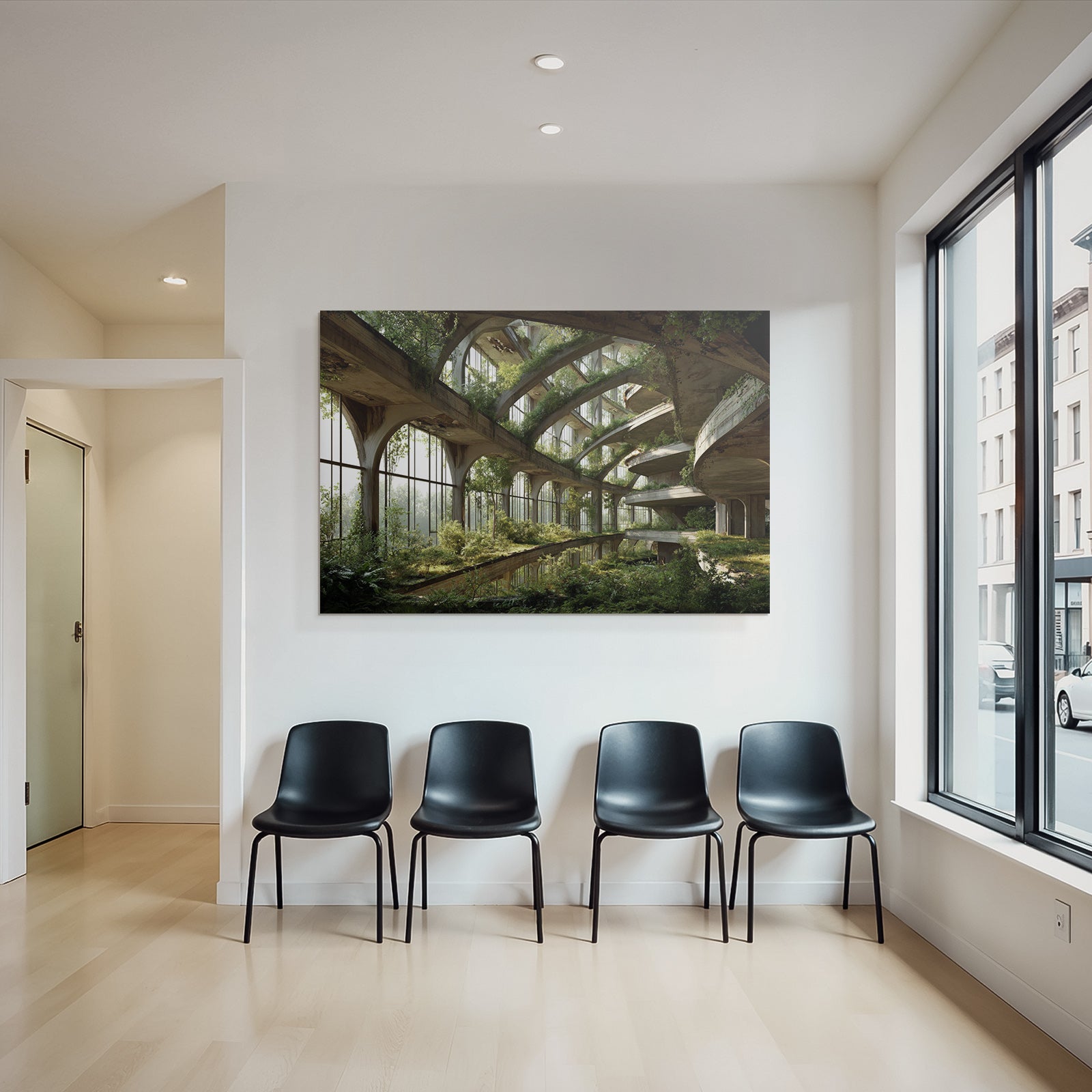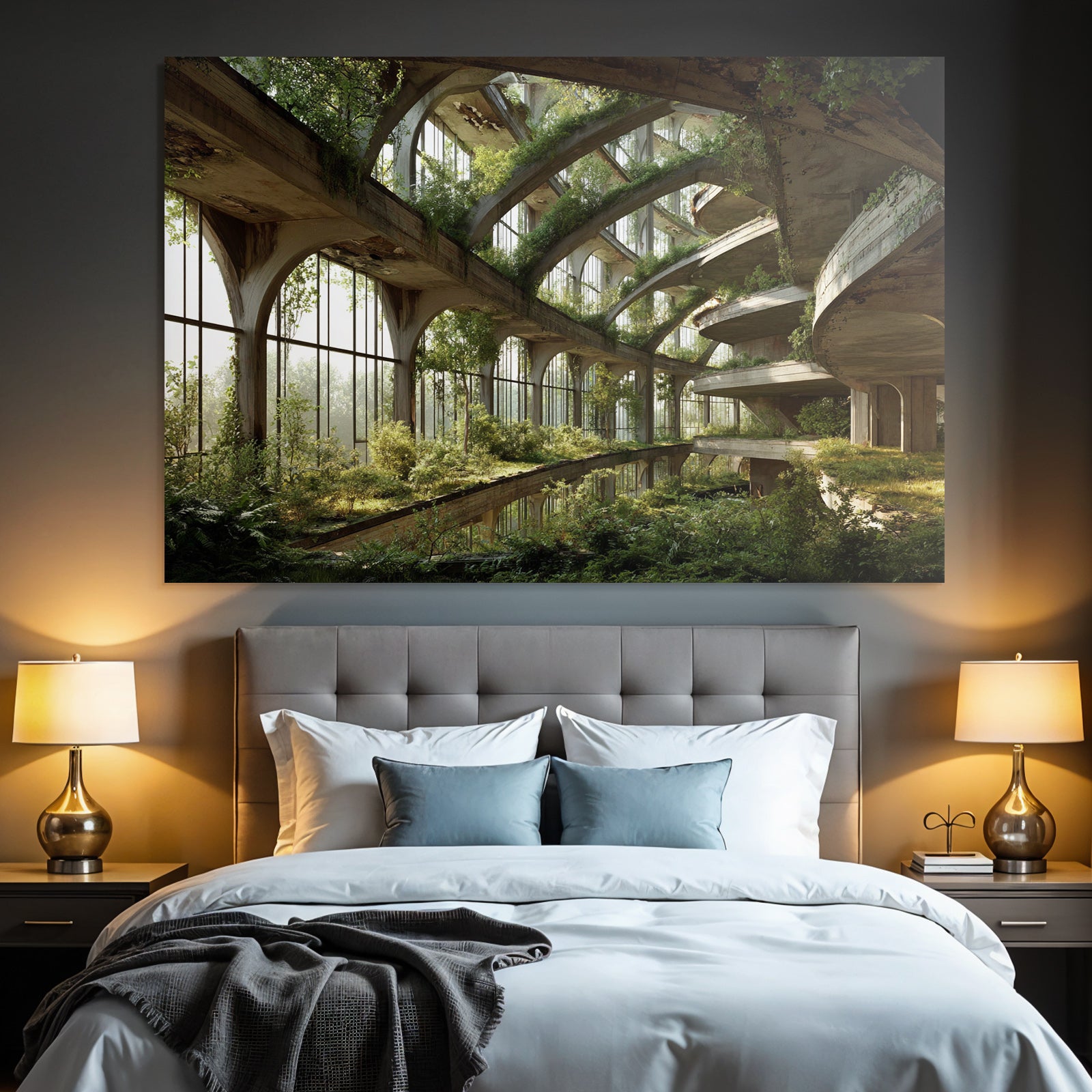 Ein Highlight für Wohnzimmer, Studio oder Empfangsbereich: „Verlassener Architektonischer Raum Natur Übernimmt Zerfall Und Neuordnung“ bringt den Stil Lost Places auf Stoff – gespannt im edlen FameFrame™.