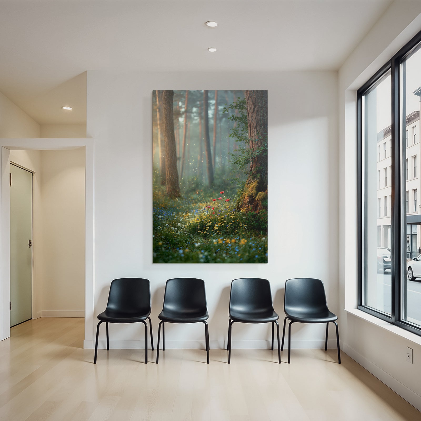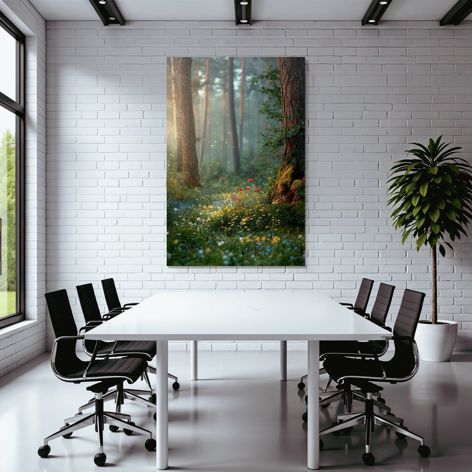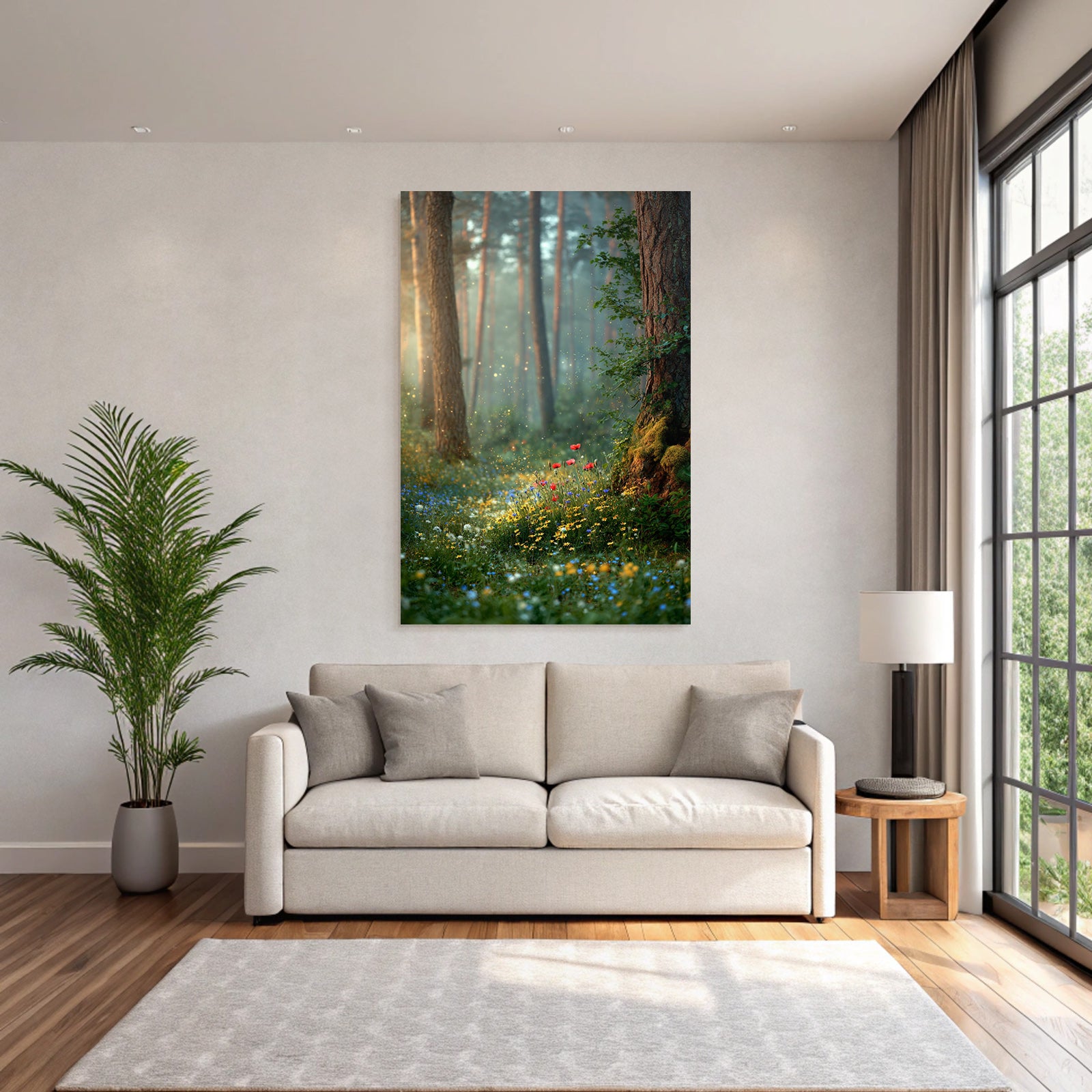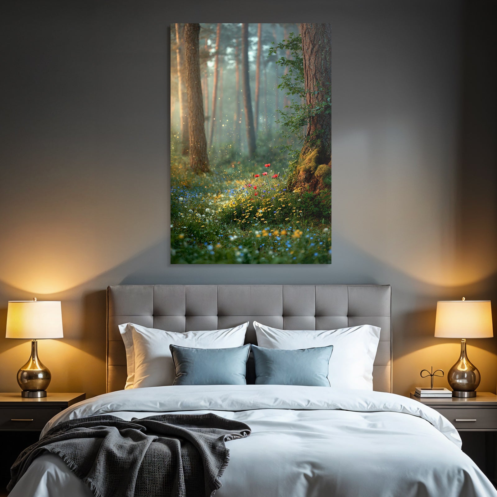 Mach mehr aus Deinem Wohnbereich oder Besprechungszimmer„Verzauberter Wald Mit Bunten Wild Und Magischen Lichtpartikeln“ im Stil Mohn Pusteblume Kornblume überzeugt als eleganter Textildruck im FameFrame.