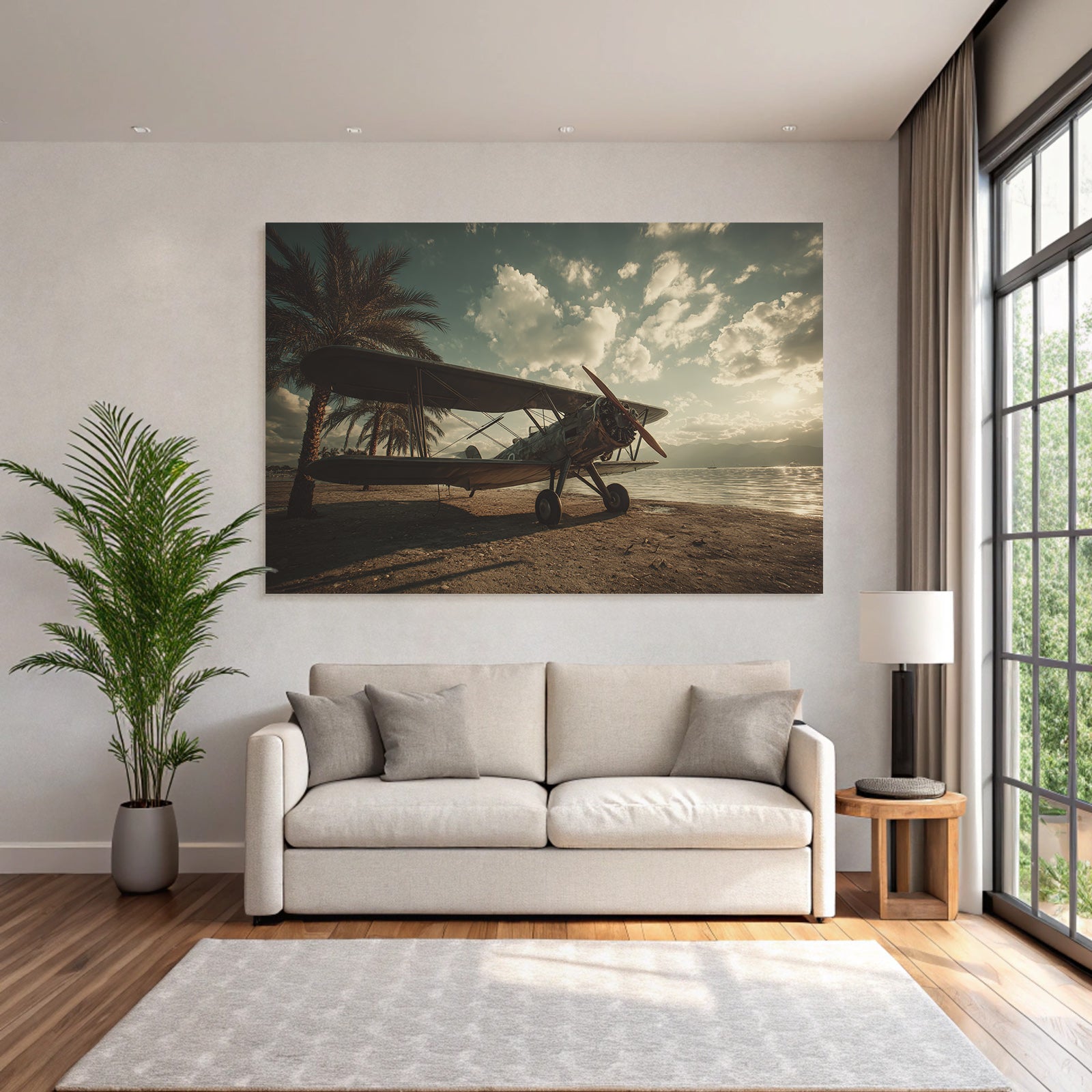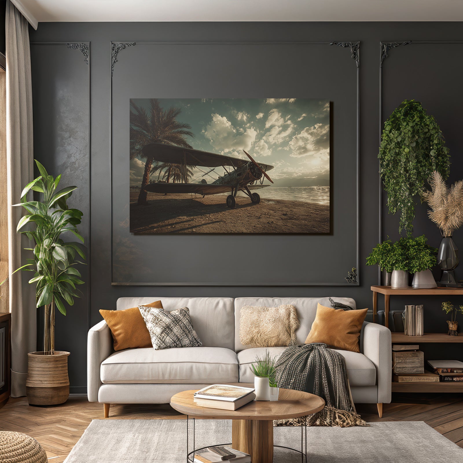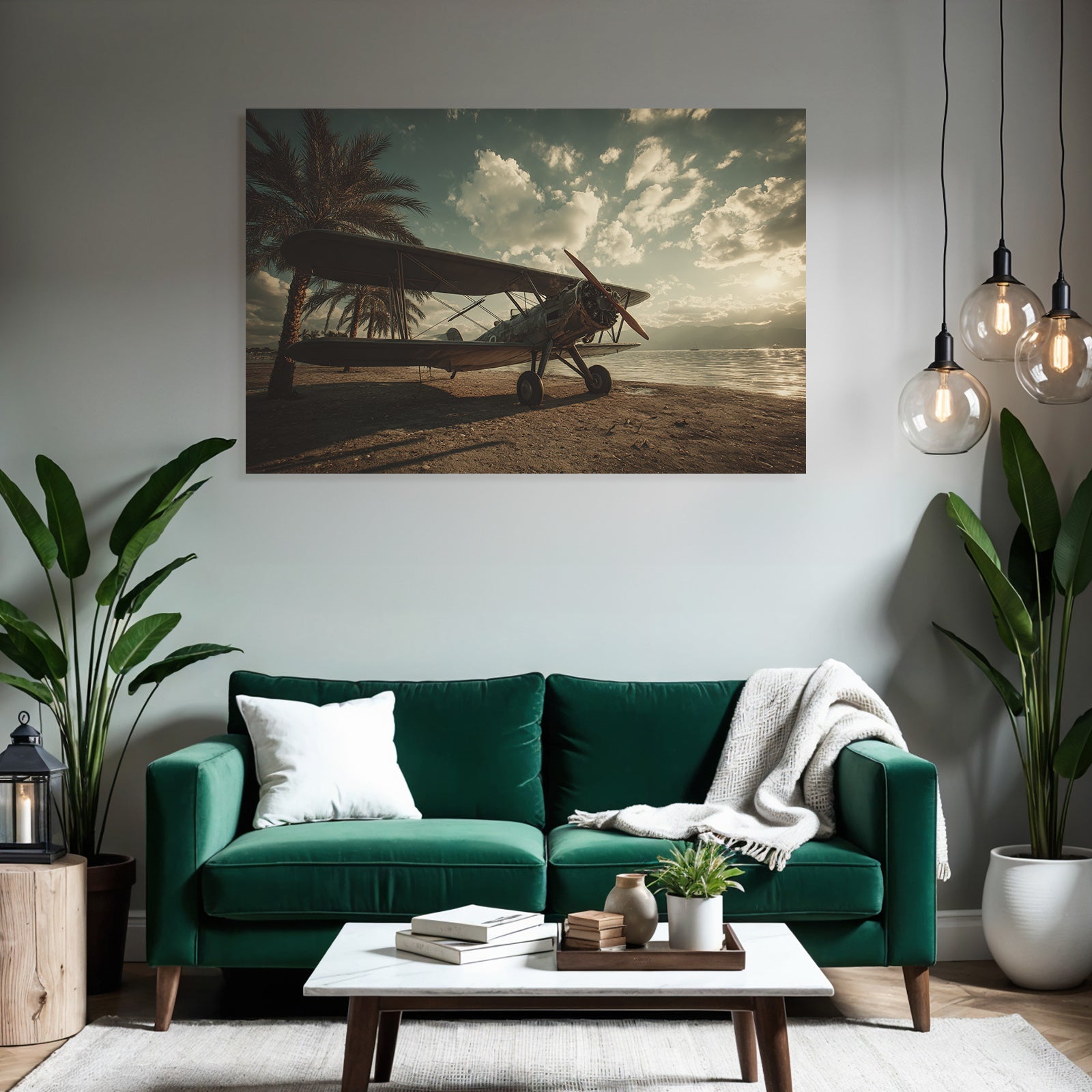 Der Stil Flugzeuge, neu interpretiert. Mit „Vintage Biplane Am Wasser Mit Palmen Im Hintergrund Beim Sonnenuntergang“ holen Sie sich ein Kunstwerk nach Hause, das im eleganten FameFrame™ seine volle ästhetische Kraft entfaltet.