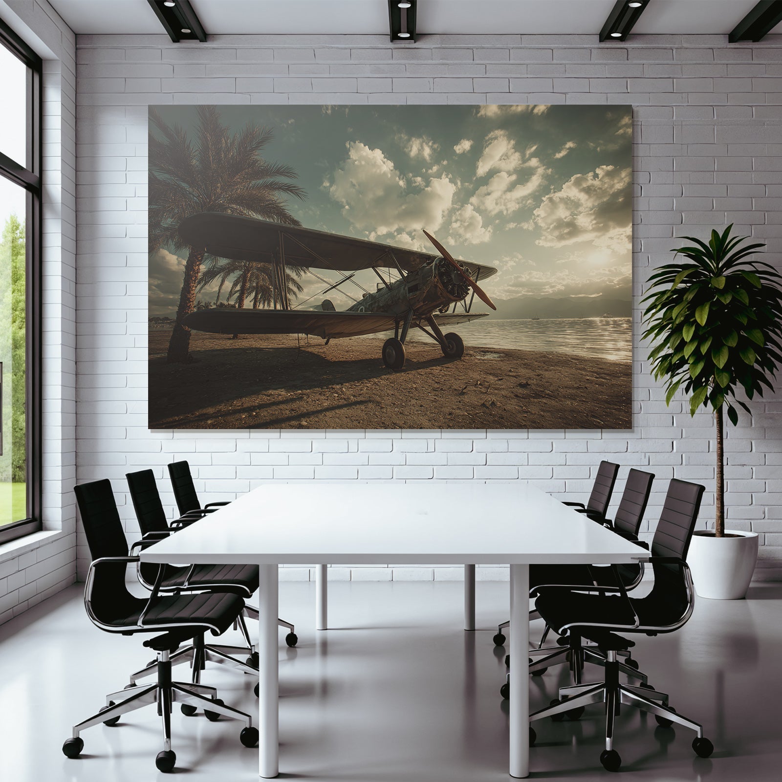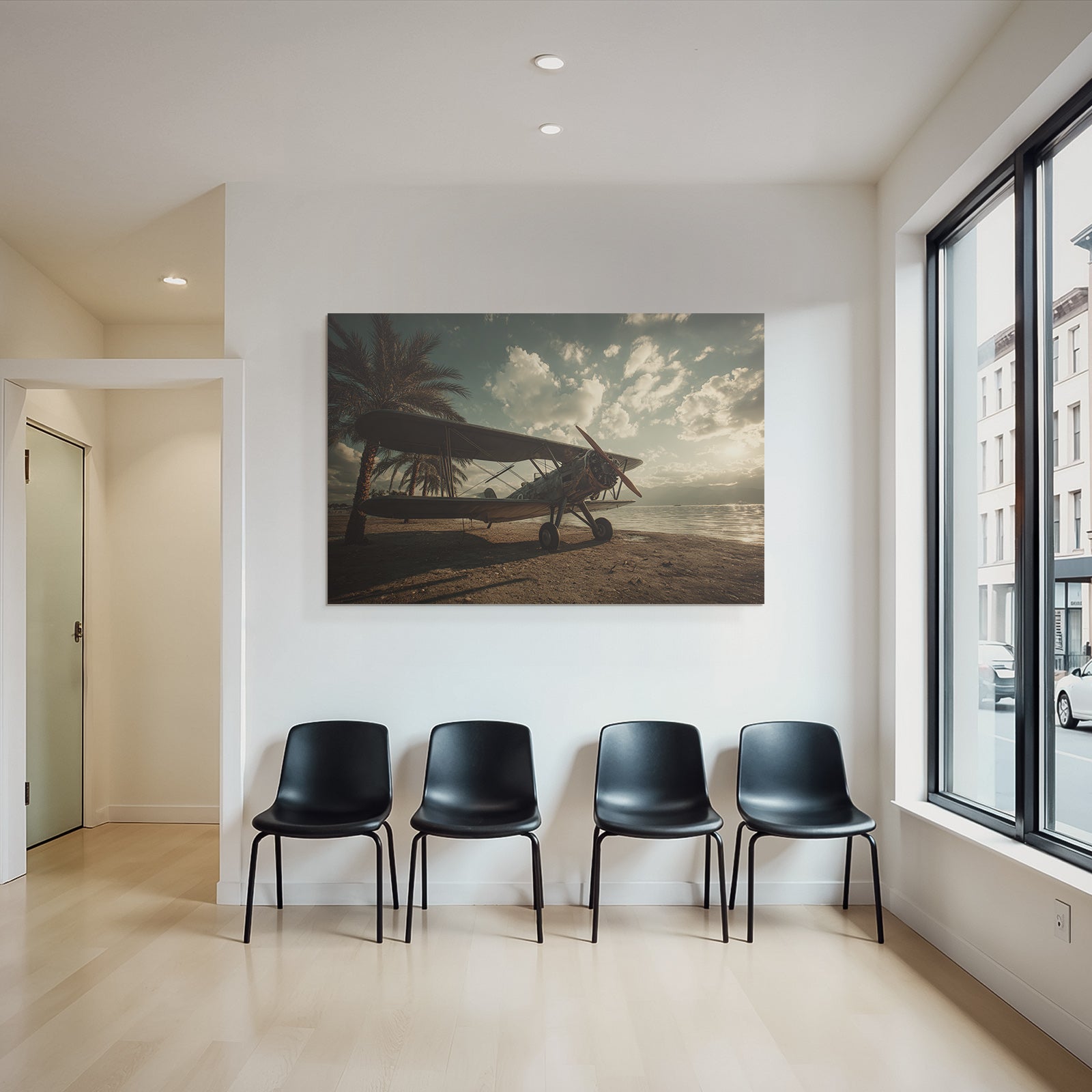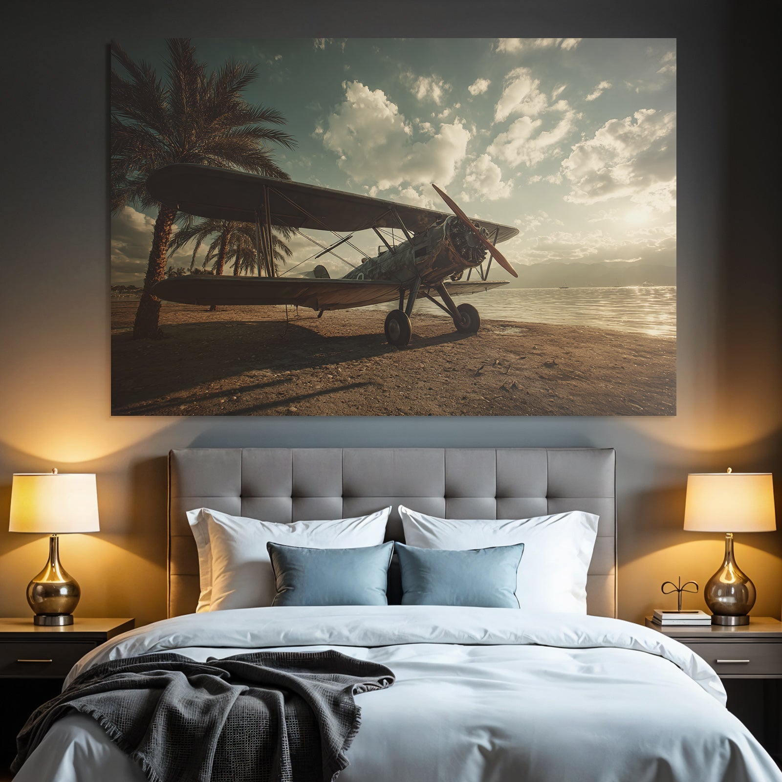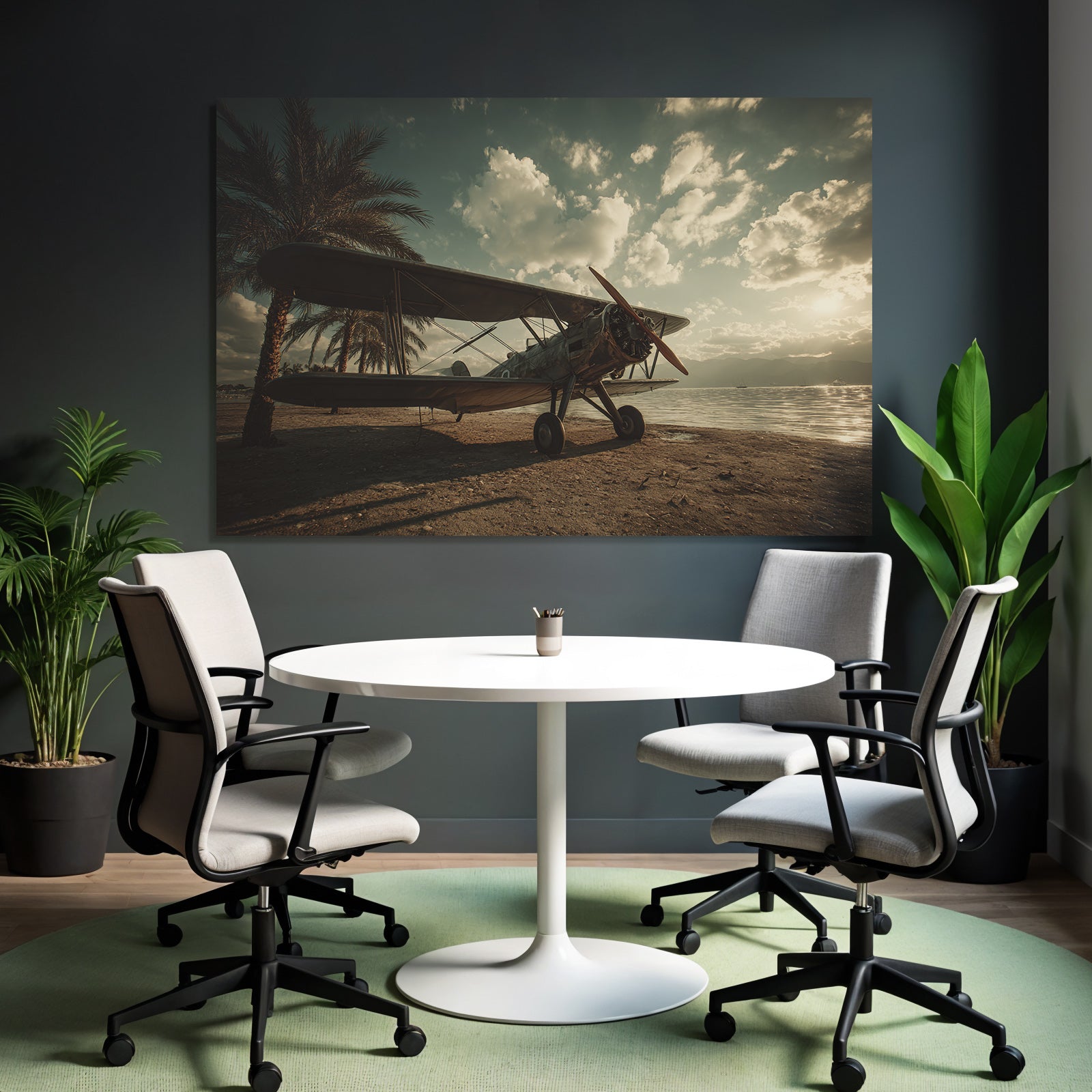 Der Stil Flugzeuge, neu interpretiert. Mit „Vintage Biplane Am Wasser Mit Palmen Im Hintergrund Beim Sonnenuntergang“ holen Sie sich ein Kunstwerk nach Hause, das im eleganten FameFrame™ seine volle ästhetische Kraft entfaltet.