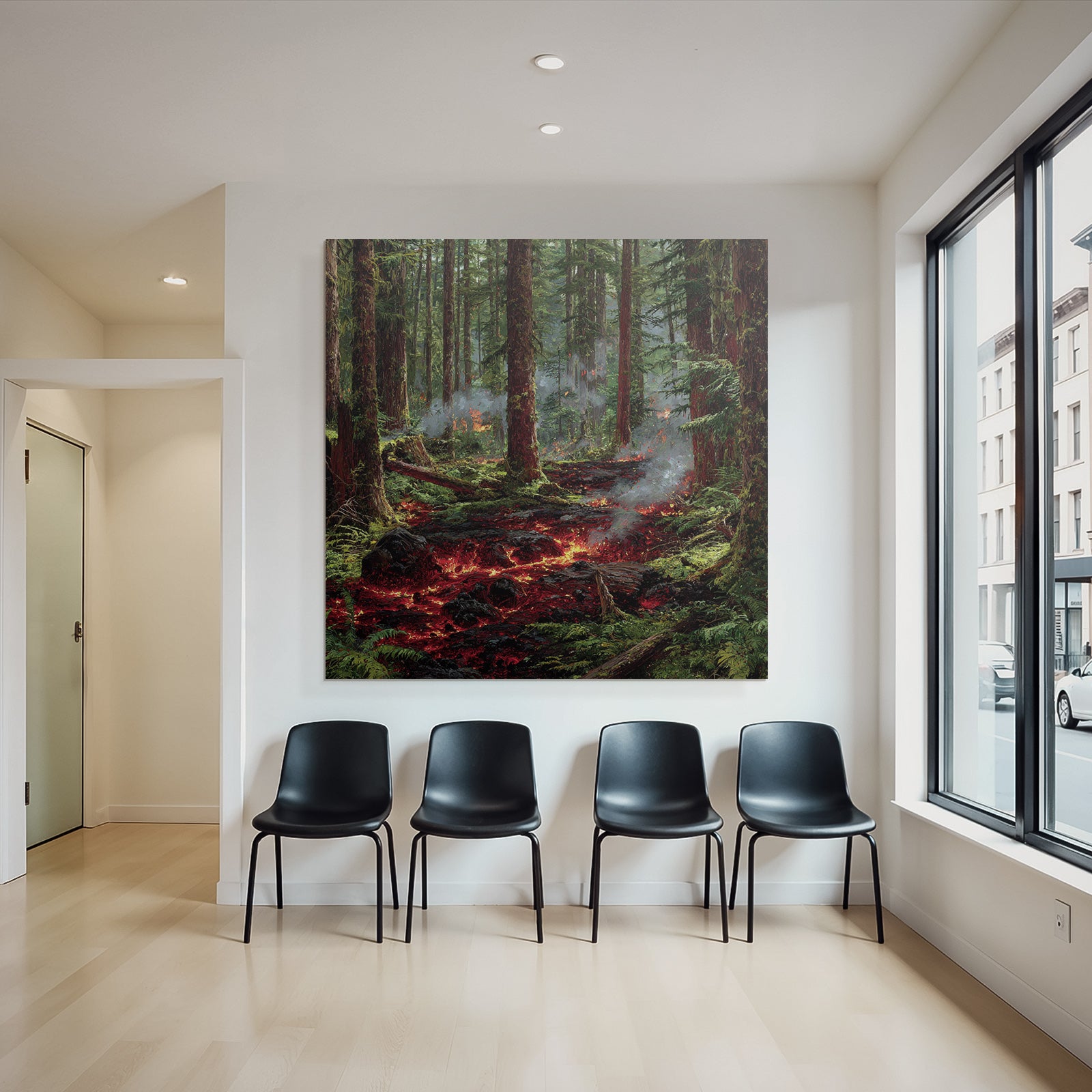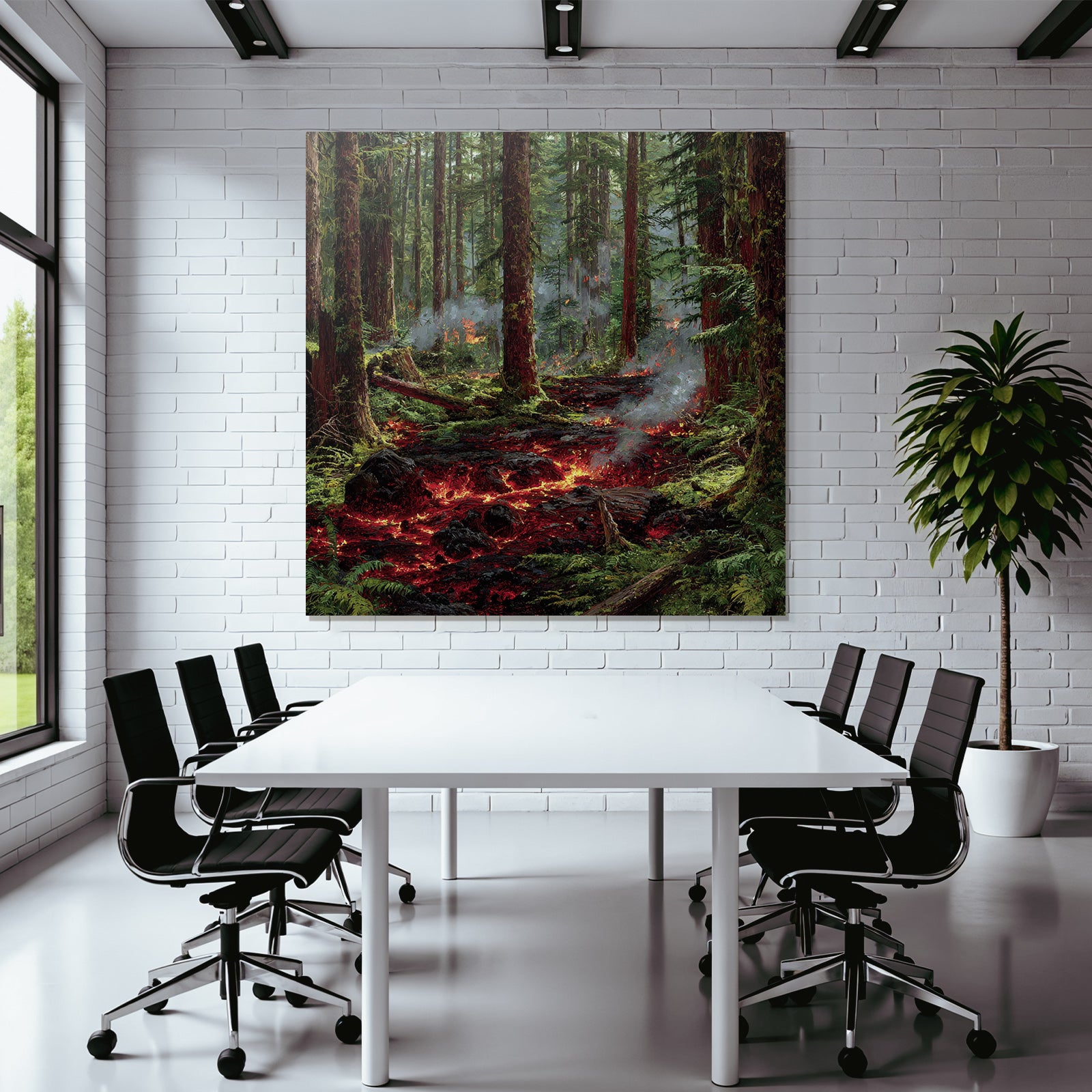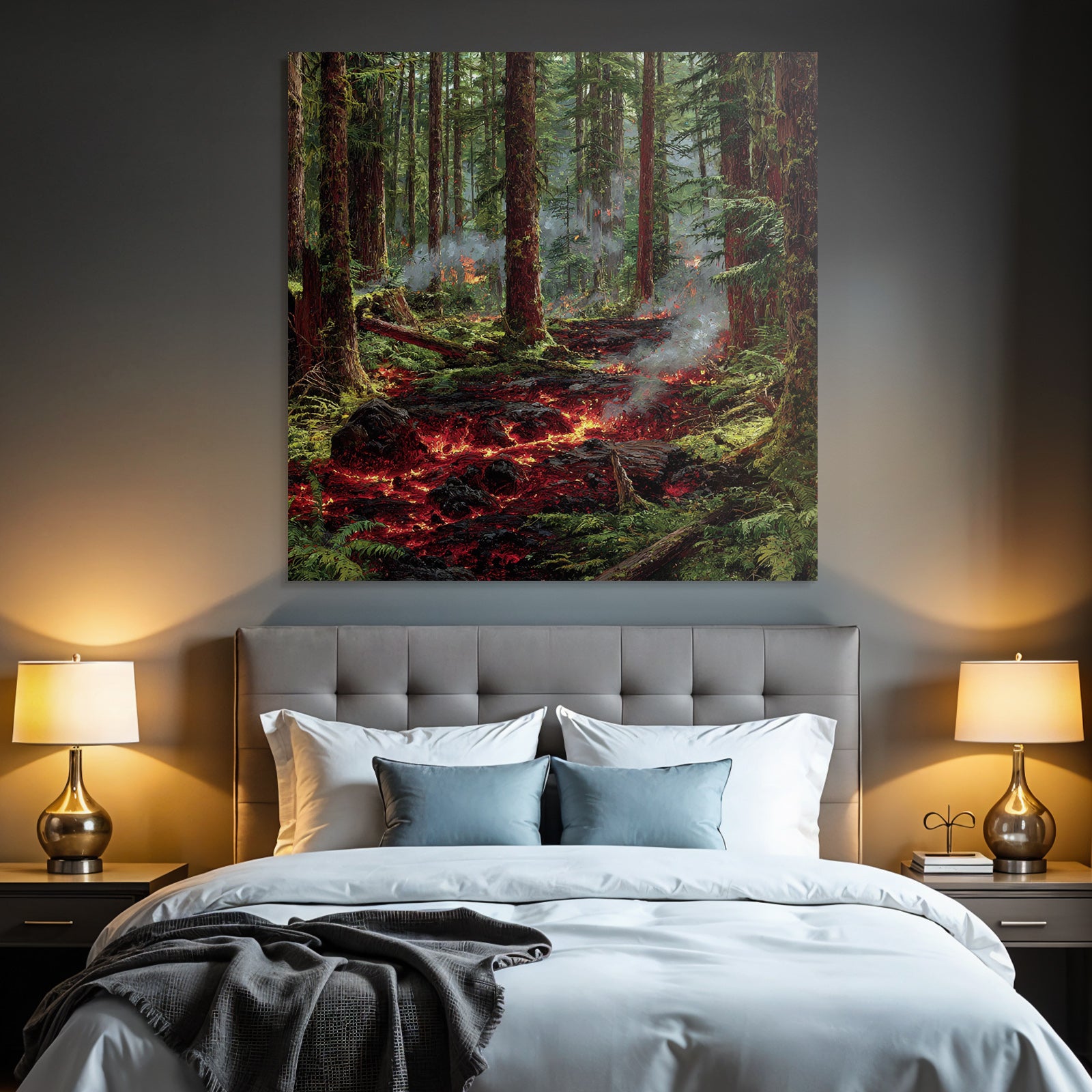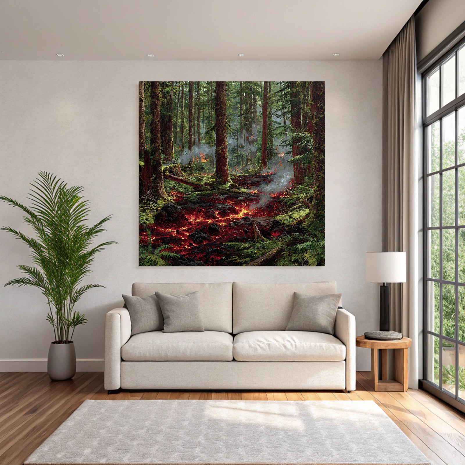 Ein Highlight für Wohnzimmer, Studio oder Empfangsbereich: „Vulkanausbruch Im Wald Mit Lavafluss“ bringt den Stil Feuer und Vulkane auf Stoff – gespannt im edlen FameFrame.