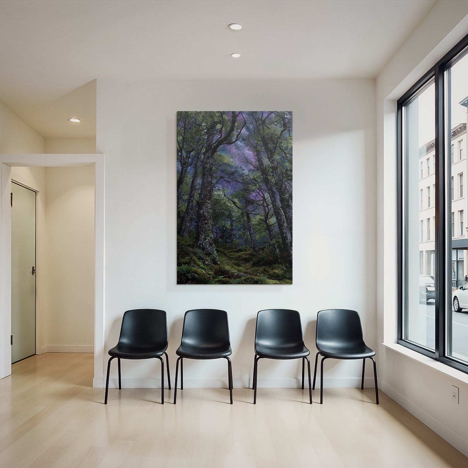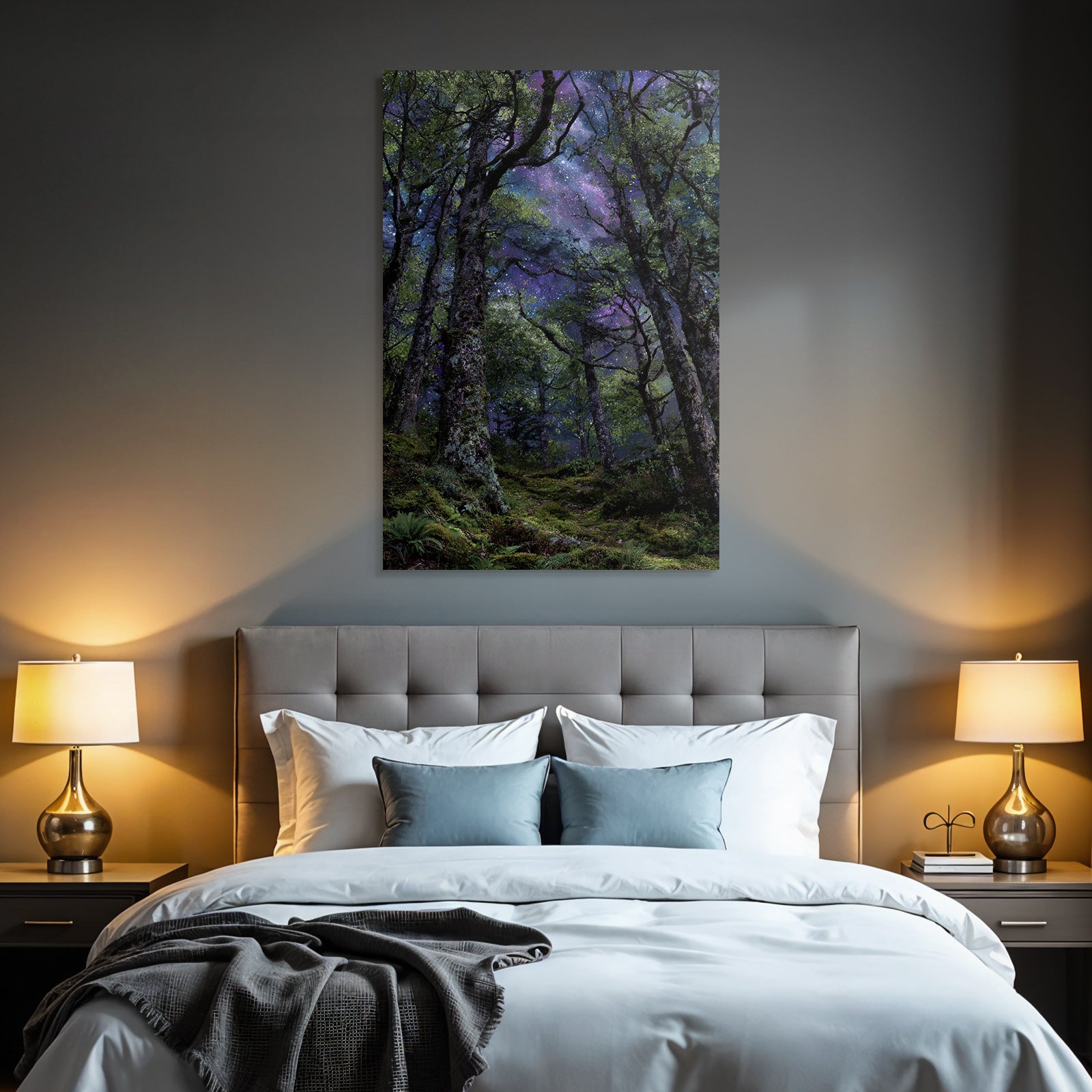 Verschönere Dein Zuhause mit diesem Werk im Stil Psychedelische Kunst. Der Titel „Waldlandschaft Mit Kosmischem Himmel“ kommt im hochwertigen FameFrame™ perfekt zur Geltung.