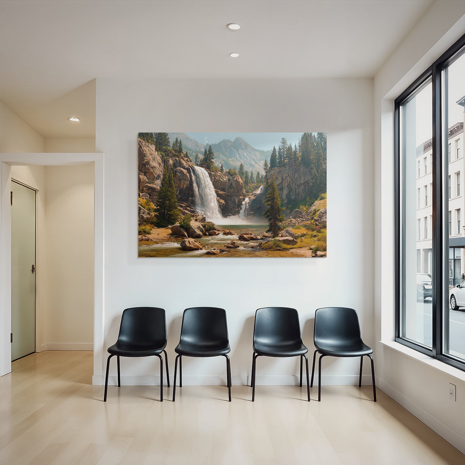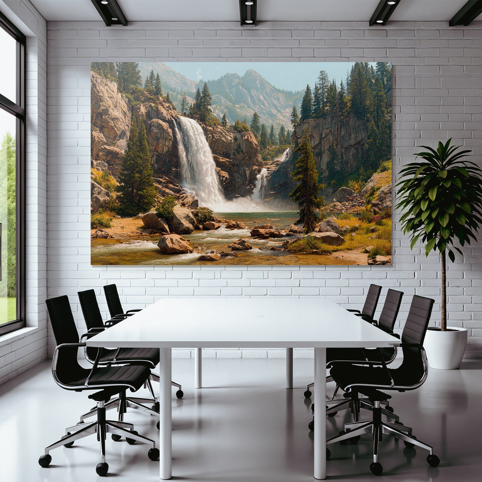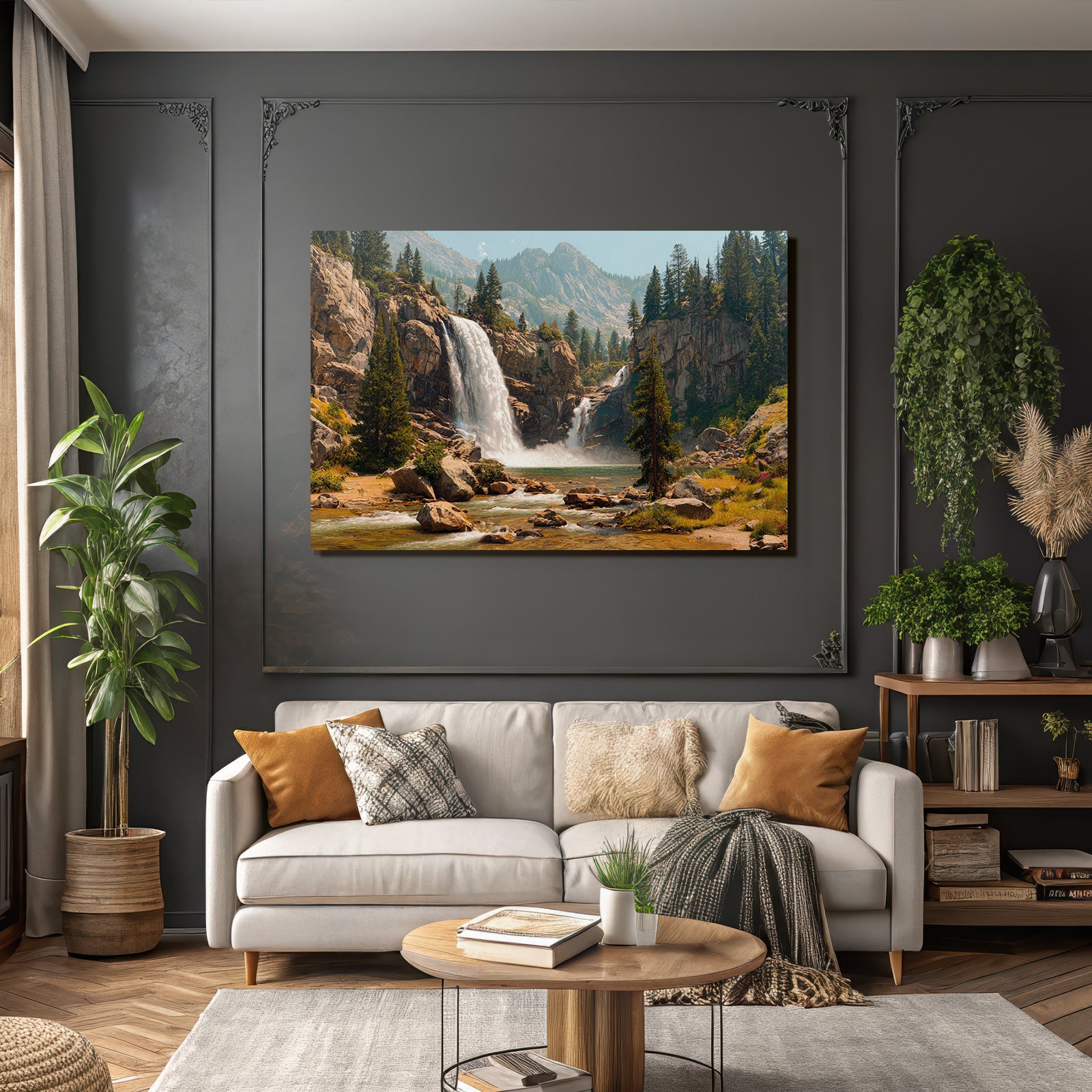Spüren Sie die Energie von „Wasserfall Landschaft Im Nationalpark“. Die dynamische Komposition im Stil Wasserfaelle und Tropfen wird durch die matte Oberfläche des Textildrucks im FameFrame besonders intensiv.