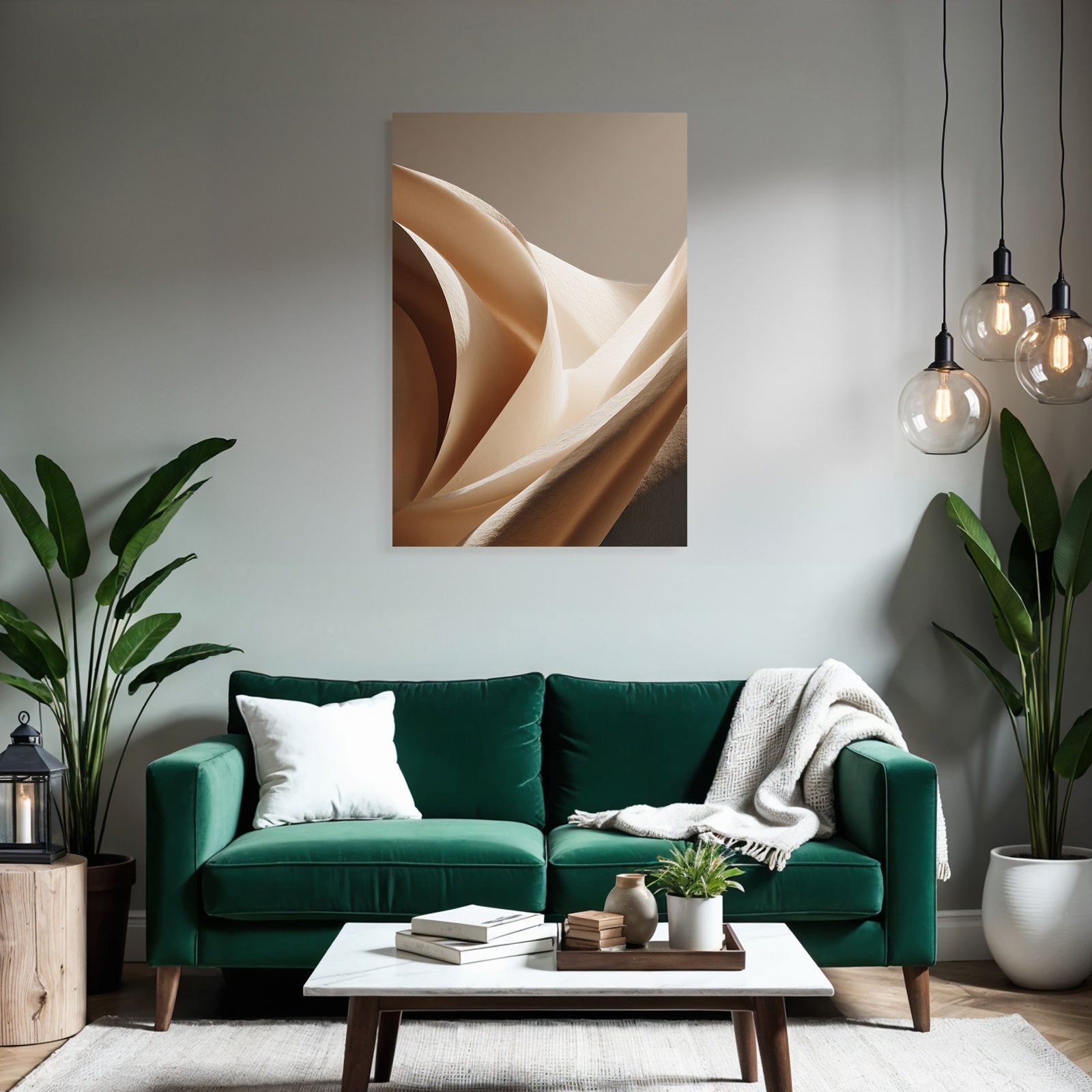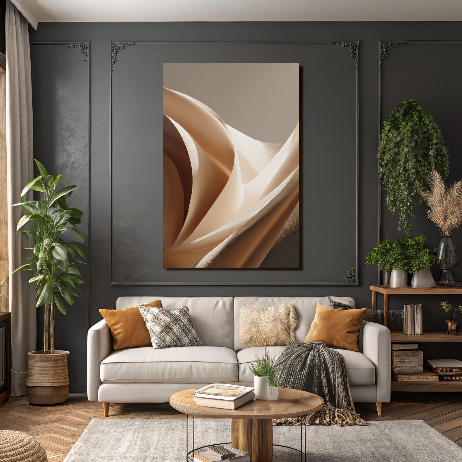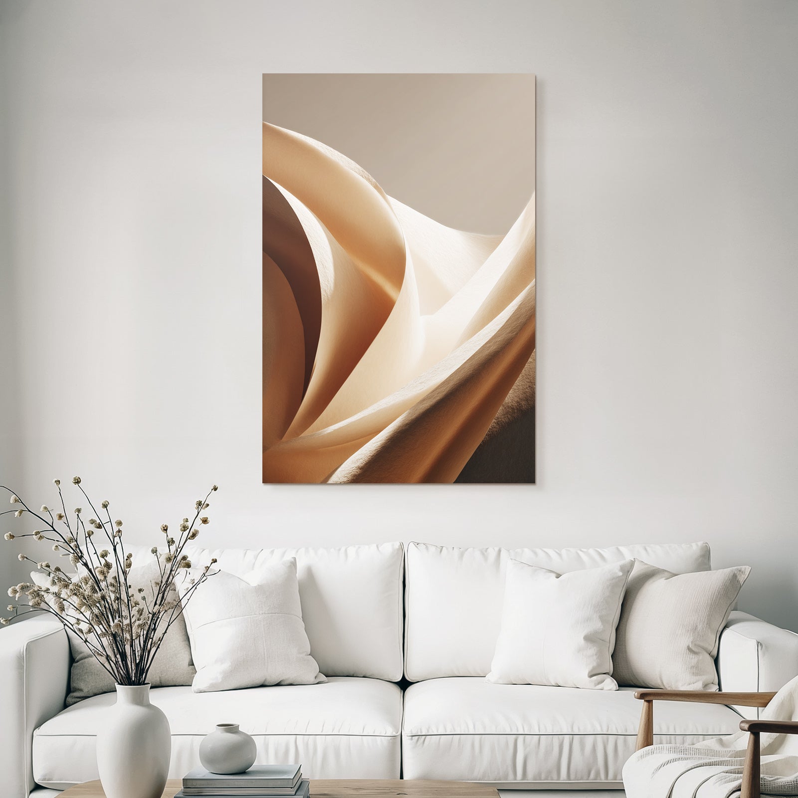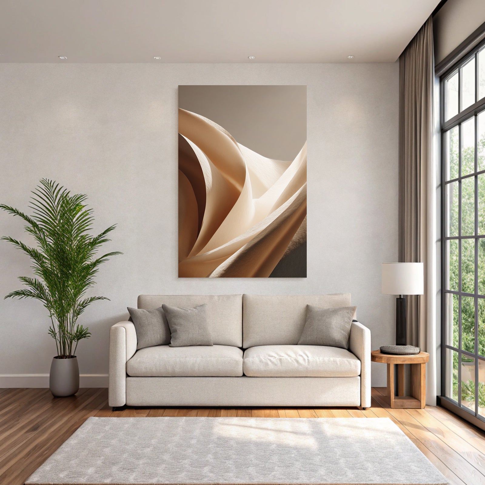 „„Weiche Texturen Sanfte Kurven Beleuchtung““ verbindet das Beste aus Japandi mit modernem Textildruck – edel präsentiert im hochwertigen FameFrame.