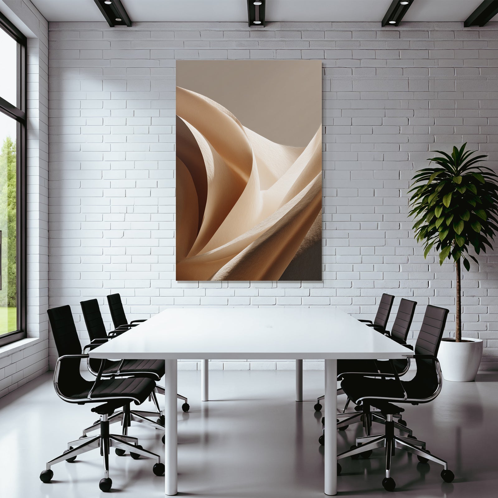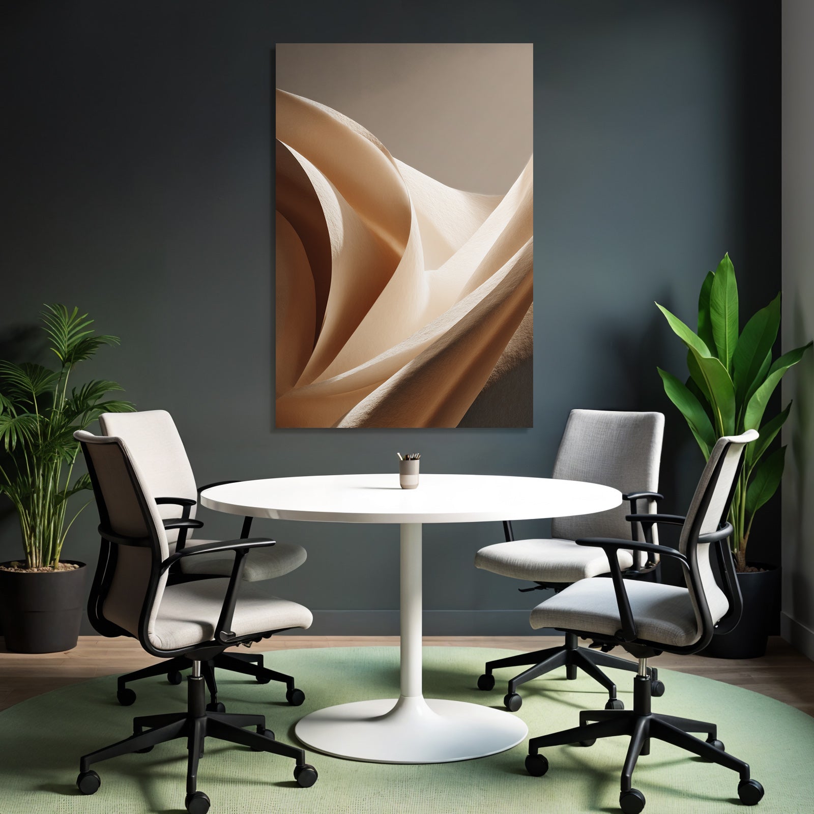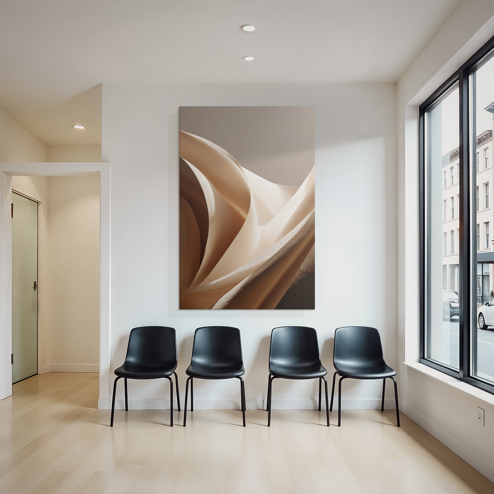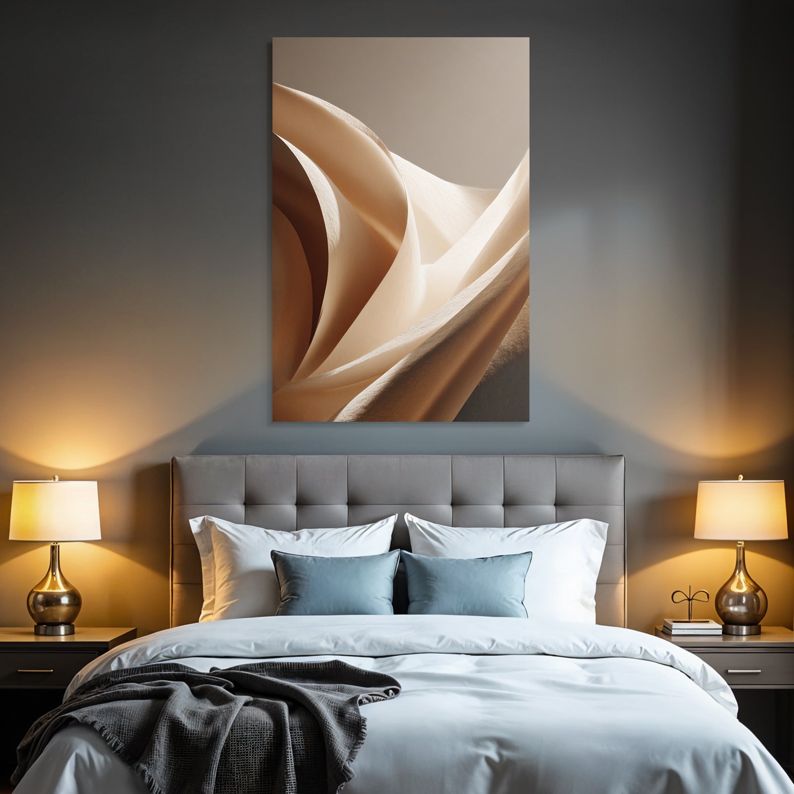 „„Weiche Texturen Sanfte Kurven Beleuchtung““ verbindet das Beste aus Japandi mit modernem Textildruck – edel präsentiert im hochwertigen FameFrame.