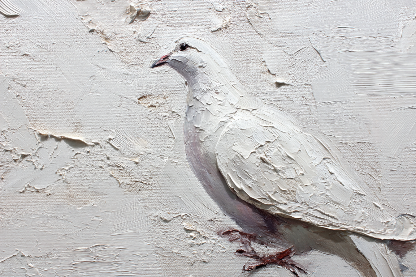 Setze Akzente im Esszimmer, Salon oder Praxisraum mit dem Kunstwerk „„Weisse Taube Malerei Texturen Kunst““ im Stil Skandinavisch – gespannt im edlen FameFrame.