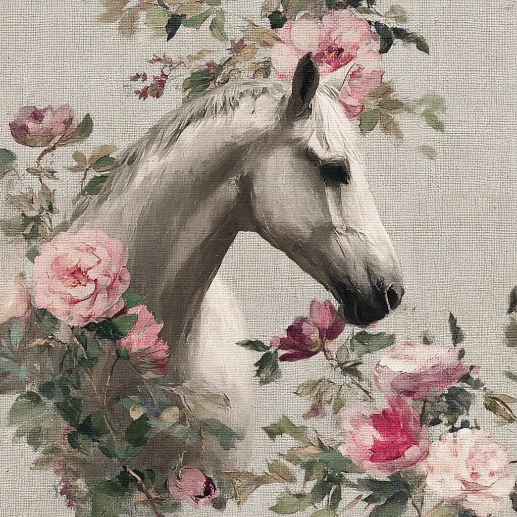 Mach mehr aus Deinem Wohnbereich oder Besprechungszimmer„„Weisser Pferd Blumen Gemalt““ im Stil Romantisch und Landhaus überzeugt als eleganter Textildruck im FameFrame.