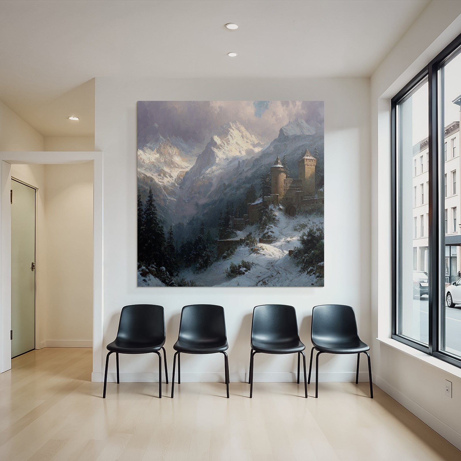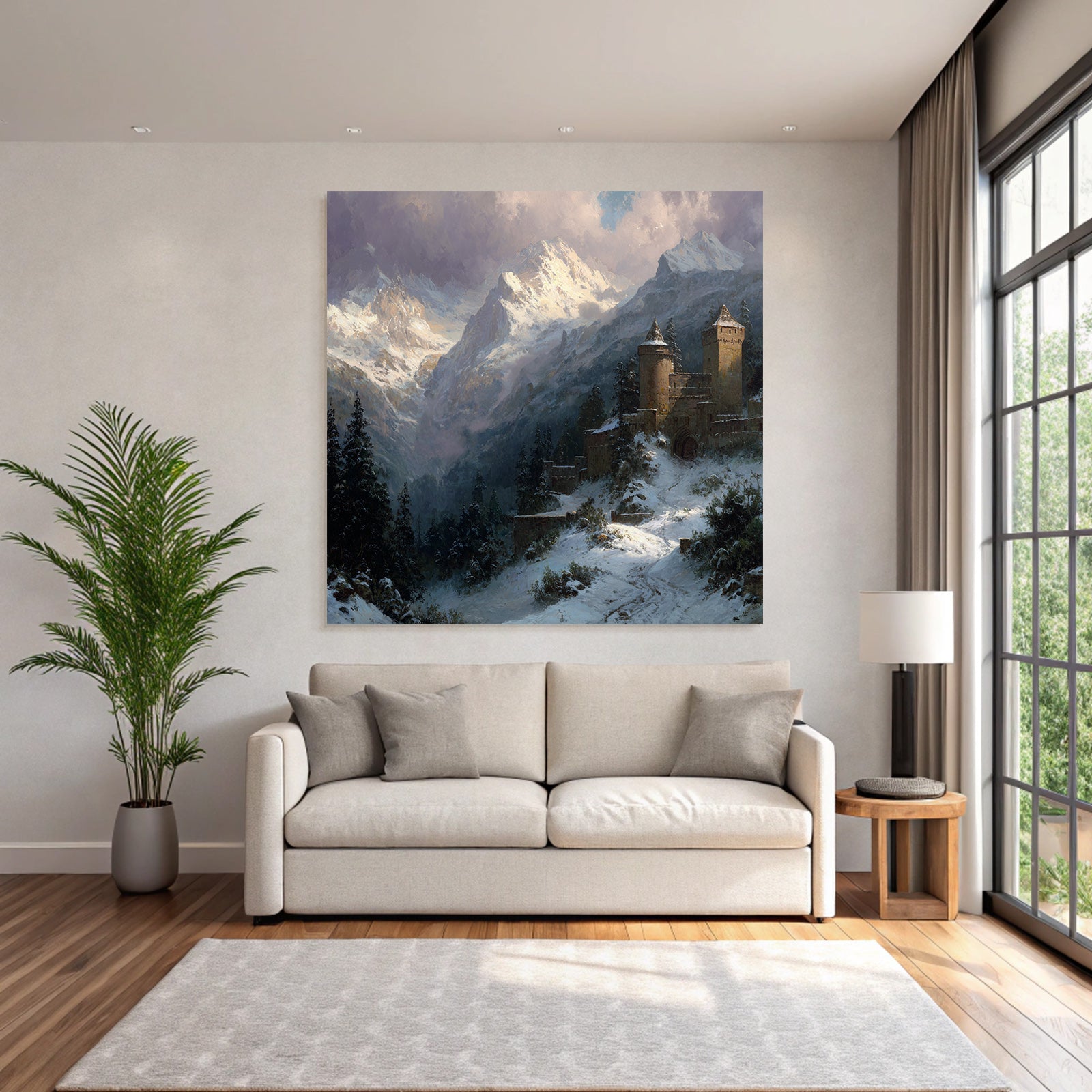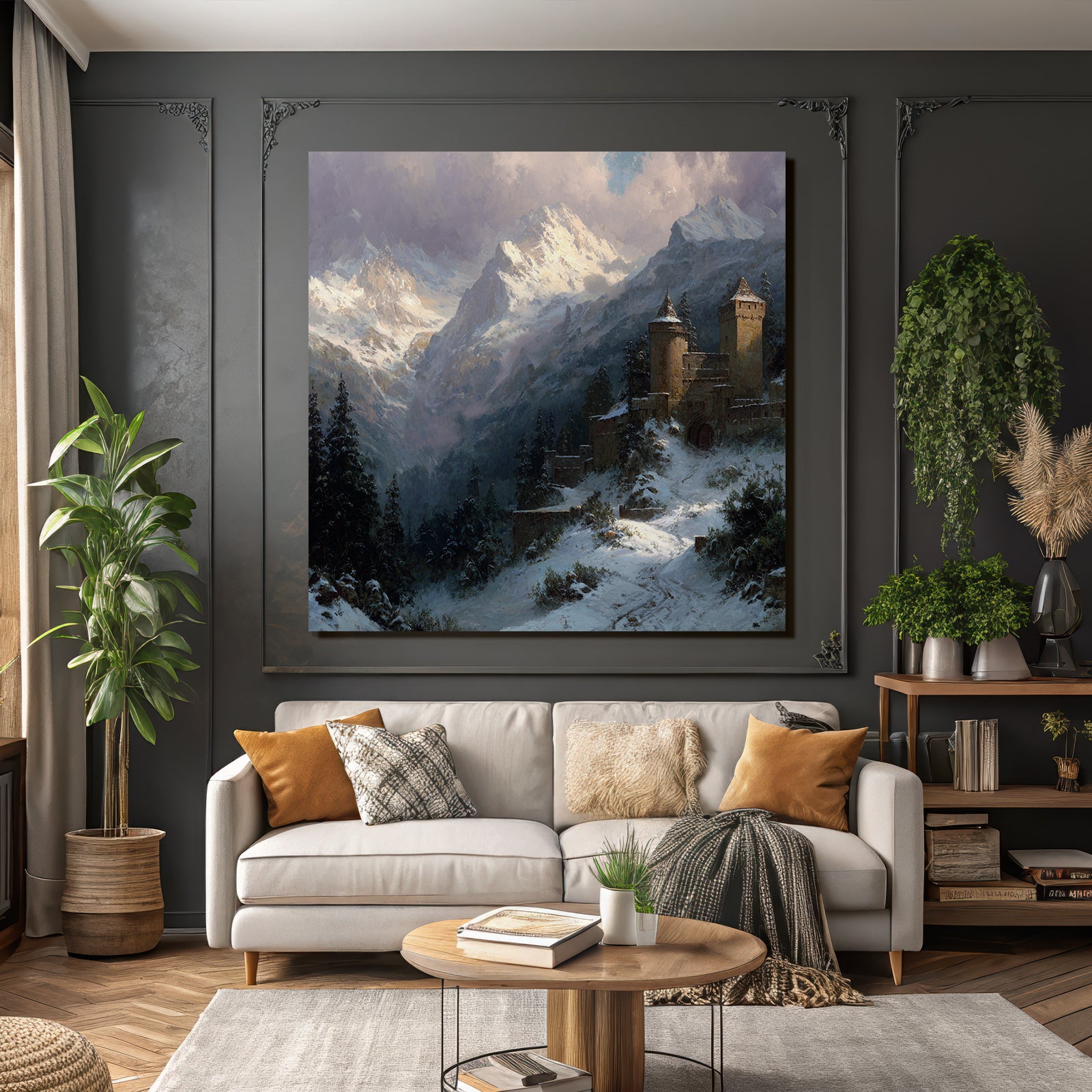 Der Stil Eis und Schnee, neu interpretiert. Mit „Winterliche Burg Im Verschneiten Gebirge“ holen Sie sich ein Kunstwerk nach Hause, das im eleganten FameFrame seine volle ästhetische Kraft entfaltet.