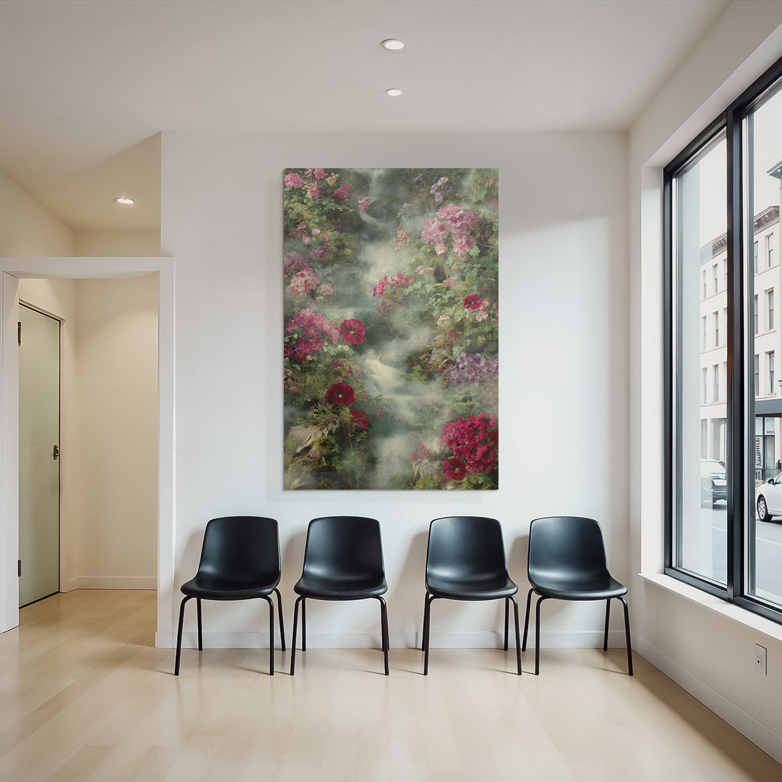 Mit Collagen-Elementen und klarer Wirkung verleiht „„Wunderschoene Blumenlandschaft Mit Fluss Im Nebel““ Deinem Raum Persönlichkeit – eingerahmt im exklusiven FameFrame.