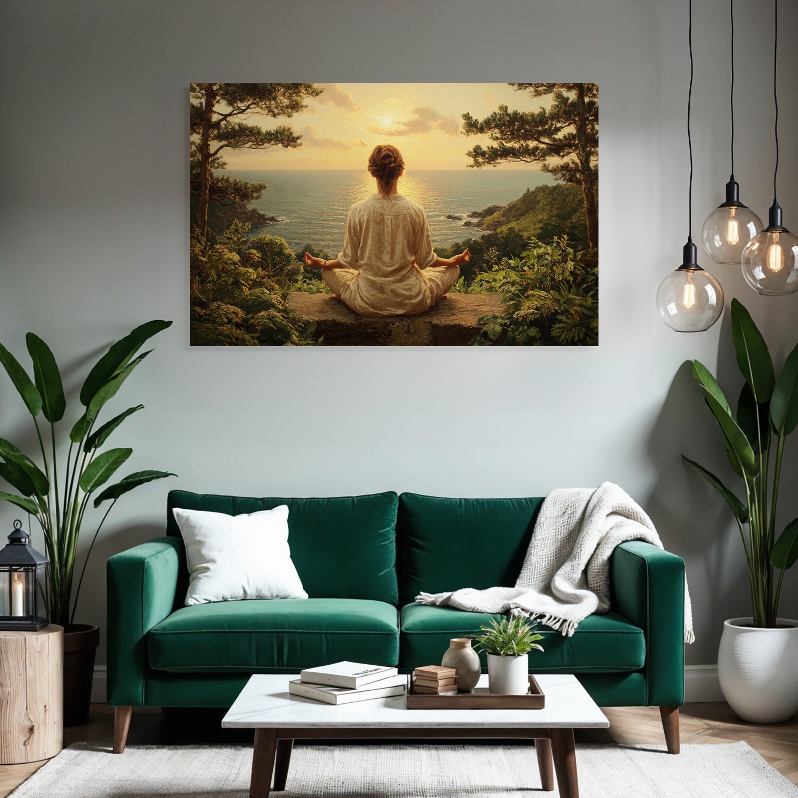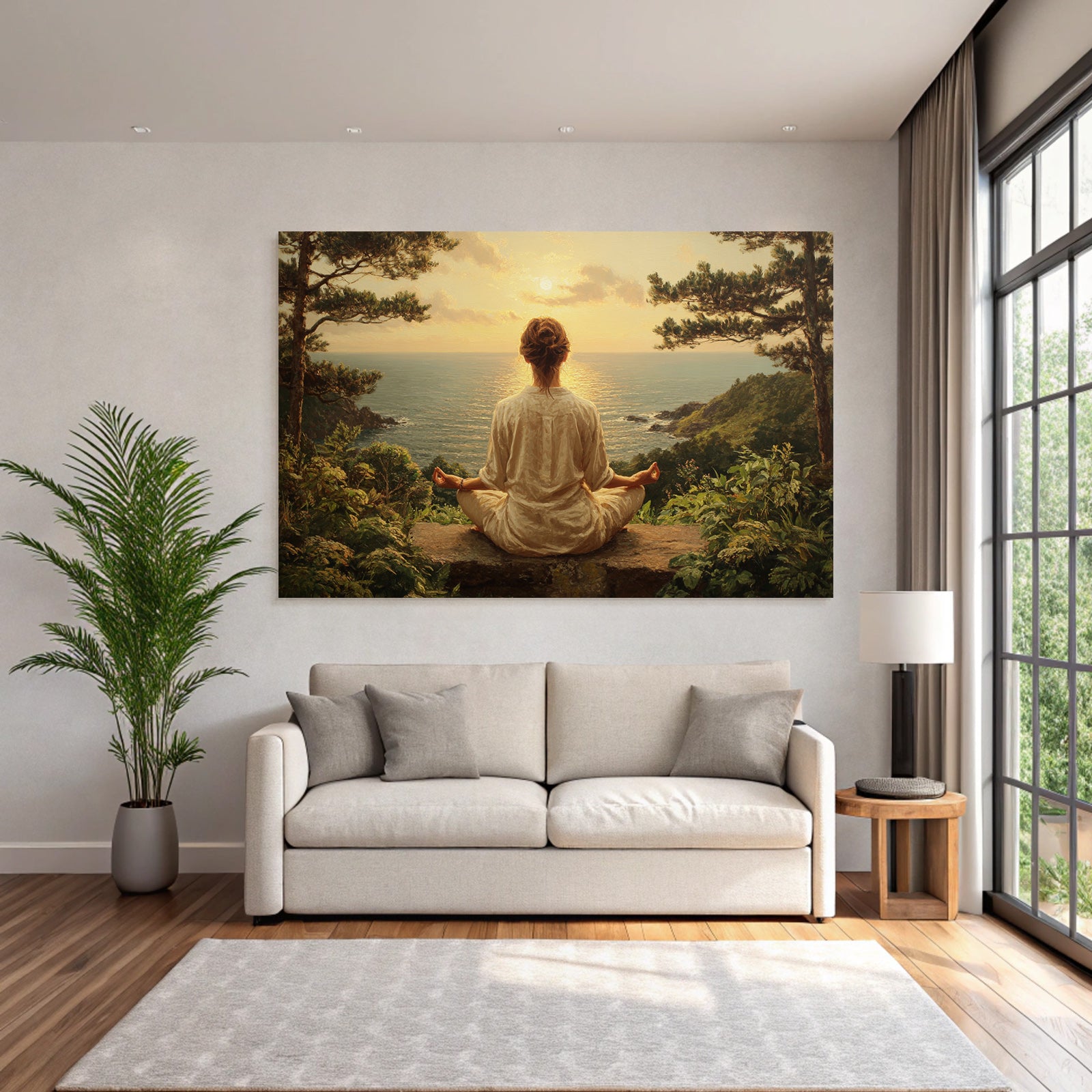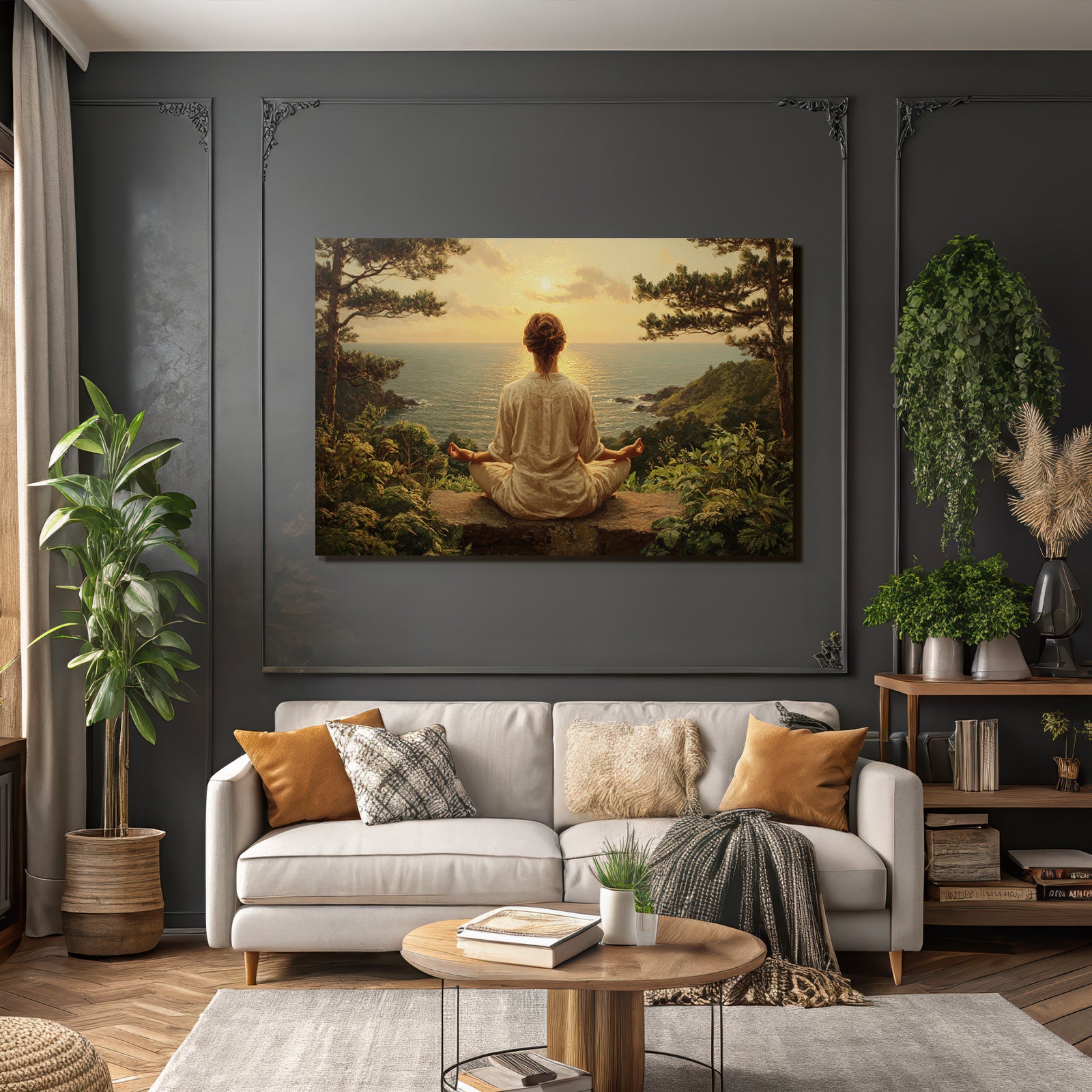 „Yoga Meditation Friedliche Landschaft Meditation Am Meer Im Sonnenuntergang“ im Stil Yoga und Meditation sorgt für stilvolle Ruhe im Schlafzimmer oder inspirierende Energie im Büro – perfekt im FameFrame™ inszeniert.