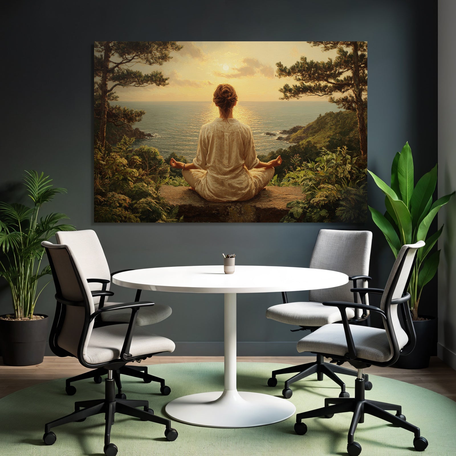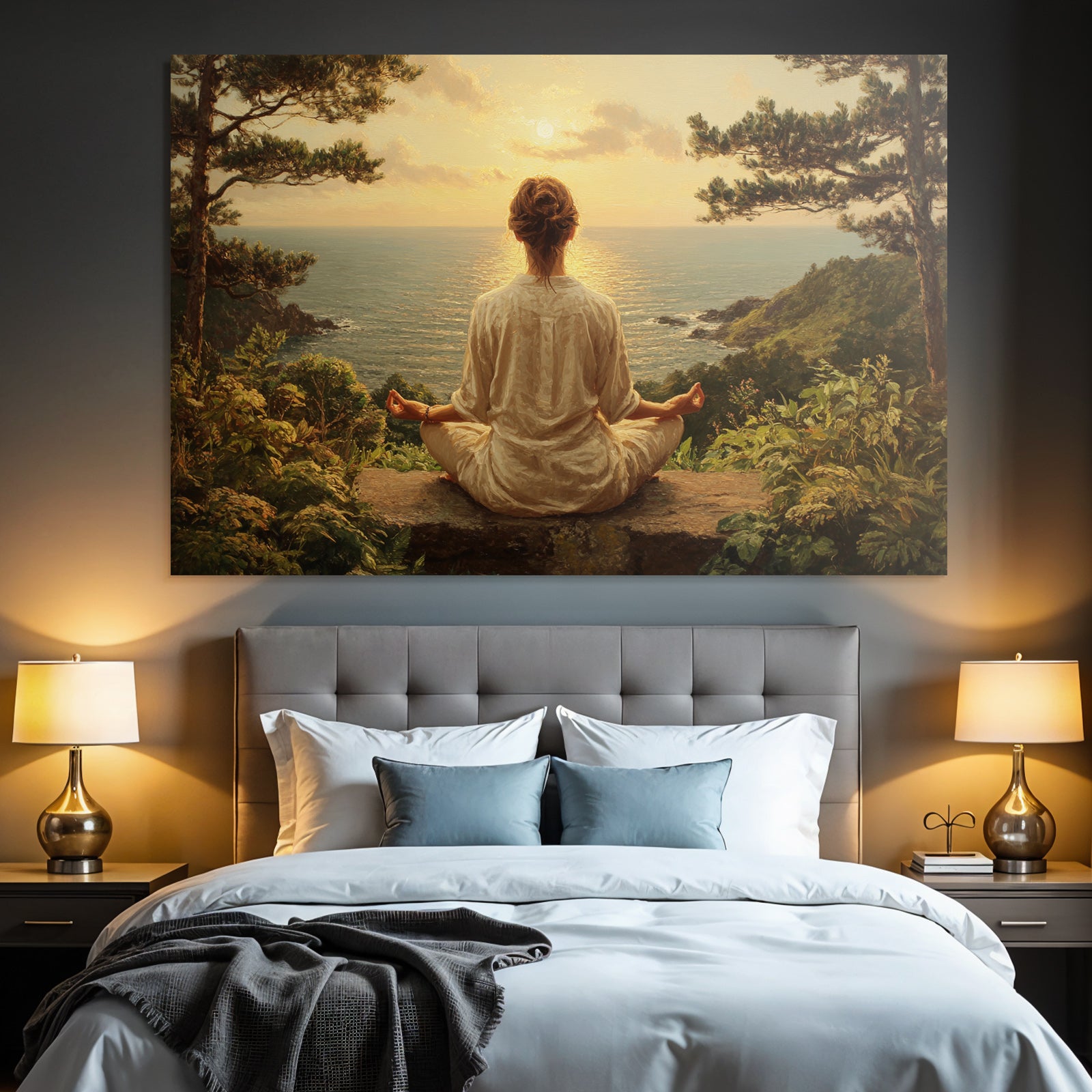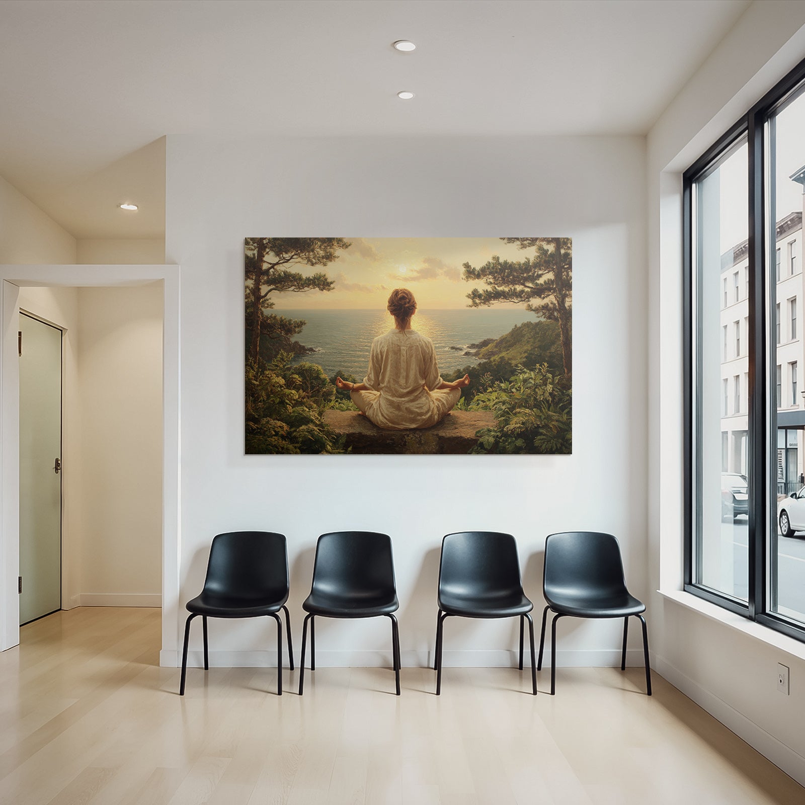 „Yoga Meditation Friedliche Landschaft Meditation Am Meer Im Sonnenuntergang“ im Stil Yoga und Meditation sorgt für stilvolle Ruhe im Schlafzimmer oder inspirierende Energie im Büro – perfekt im FameFrame™ inszeniert.