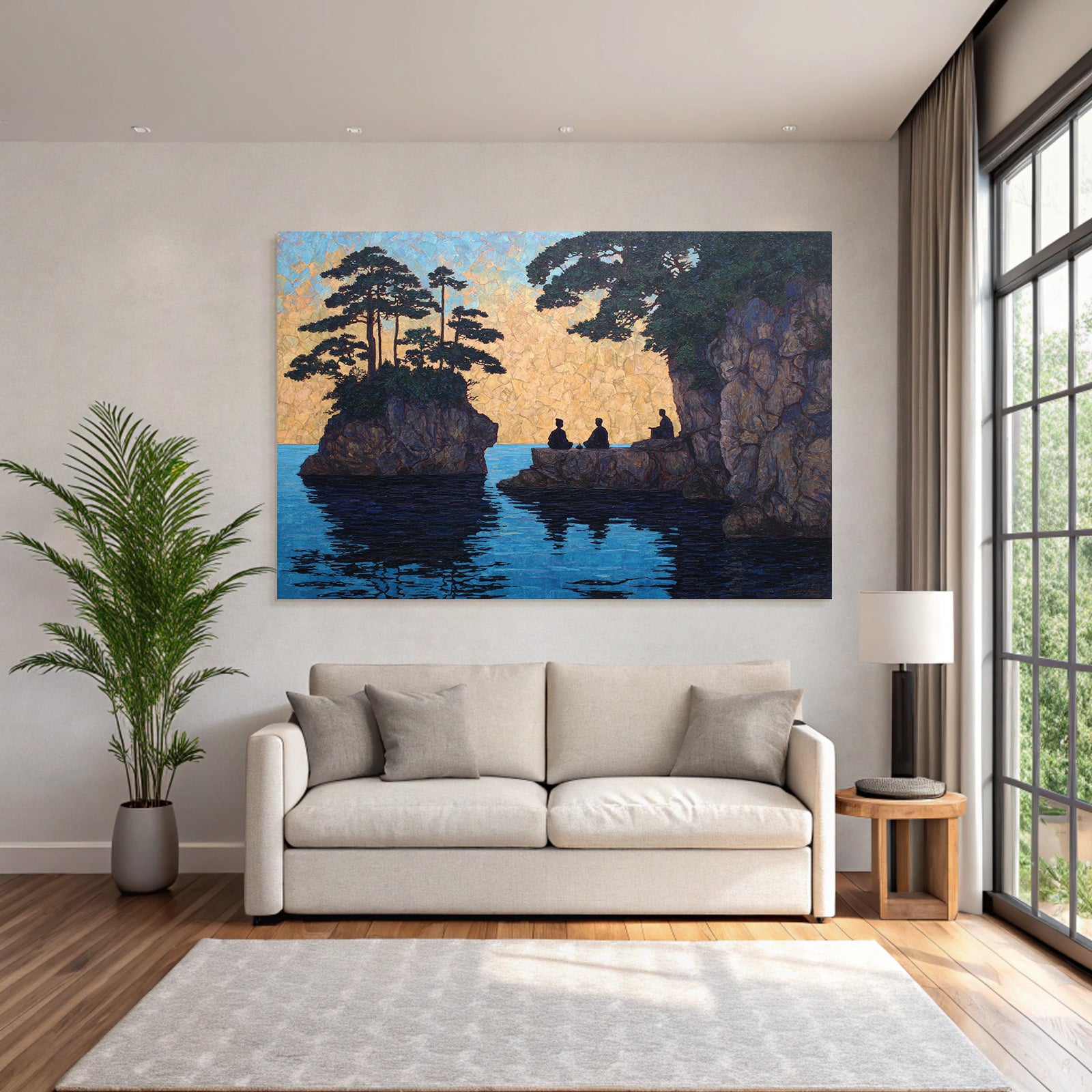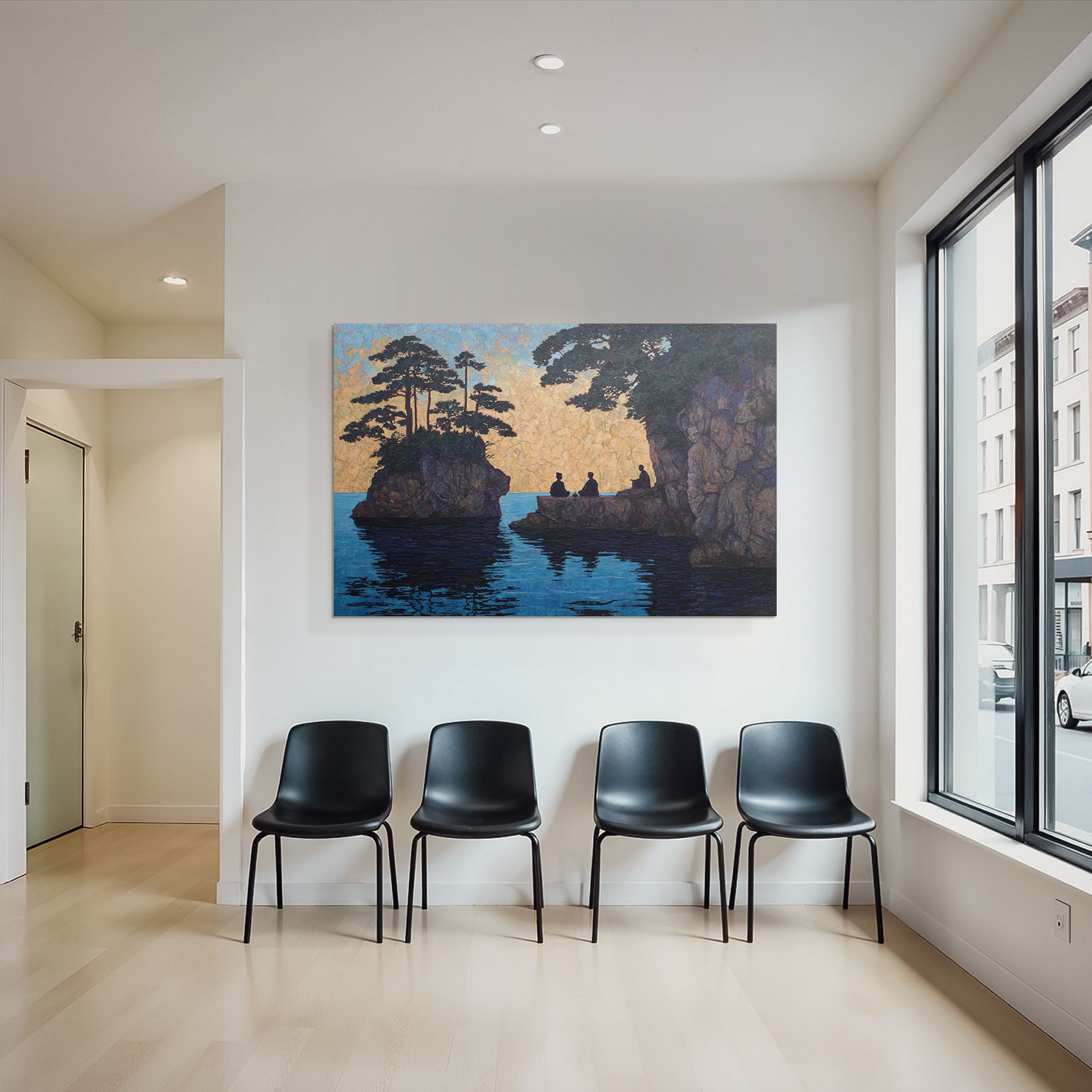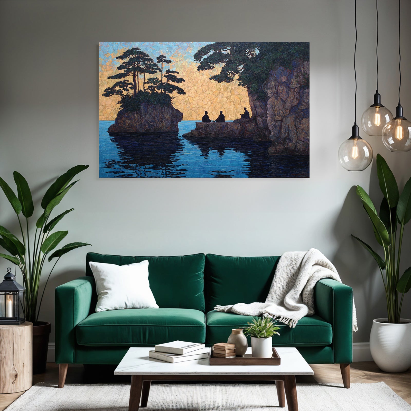 Mit „Yoga Meditation Friedliche Landschaft Mit Figuren Am Wasser Sunset“ entscheiden Sie sich für ein ausdrucksstarkes Kunstwerk im Stil Yoga und Meditation. Der FameFrame™ unterstreicht die moderne und hochwertige Wirkung.
