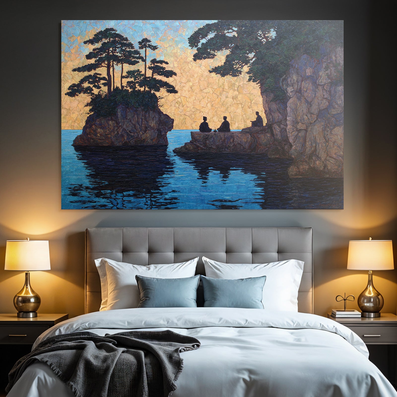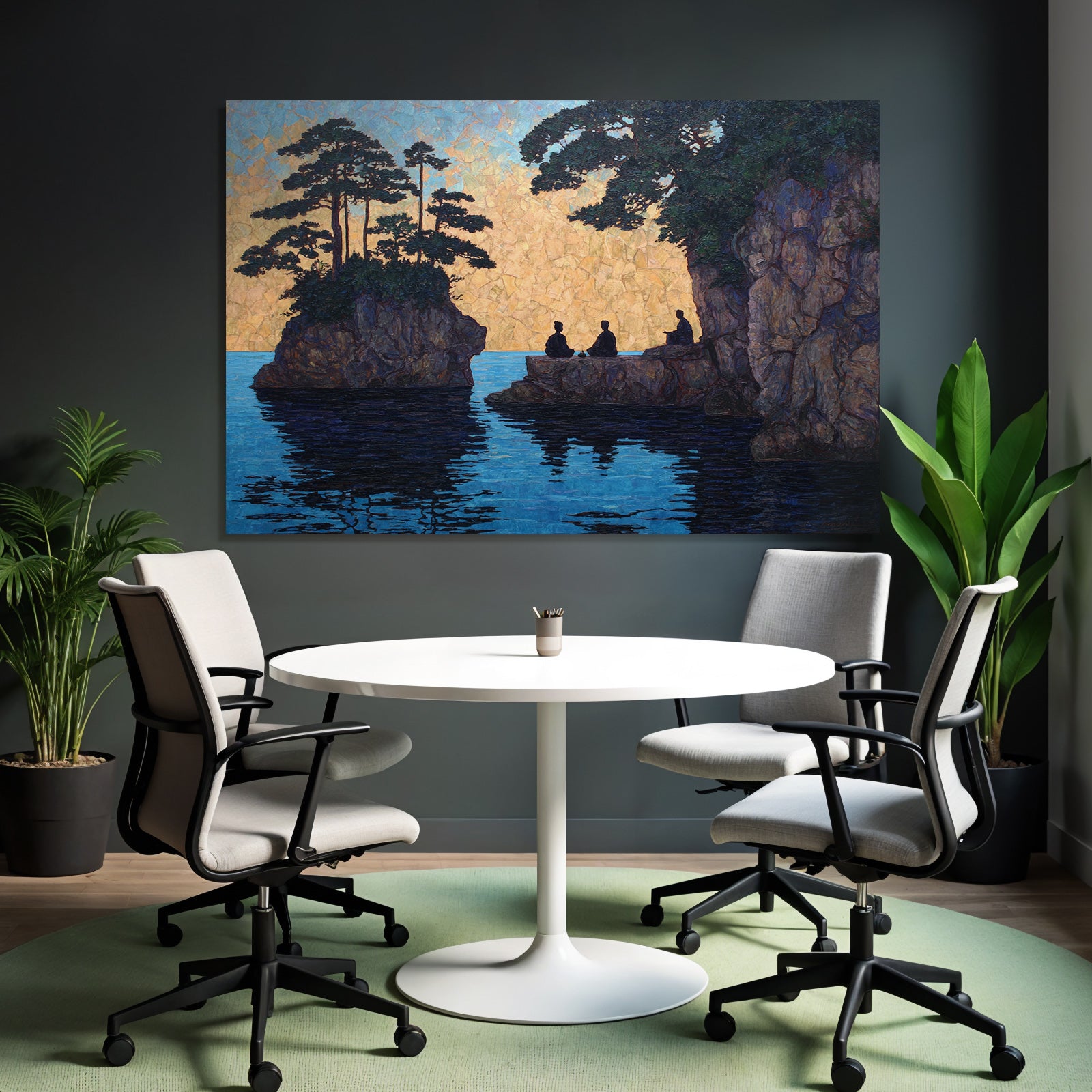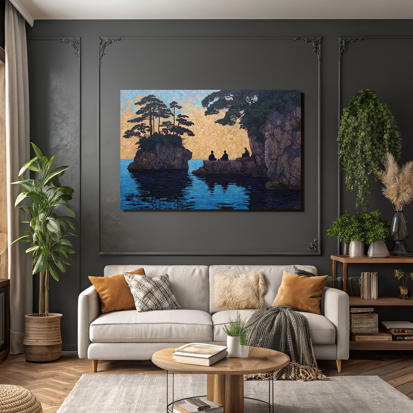 Mit „Yoga Meditation Friedliche Landschaft Mit Figuren Am Wasser Sunset“ entscheiden Sie sich für ein ausdrucksstarkes Kunstwerk im Stil Yoga und Meditation. Der FameFrame™ unterstreicht die moderne und hochwertige Wirkung.