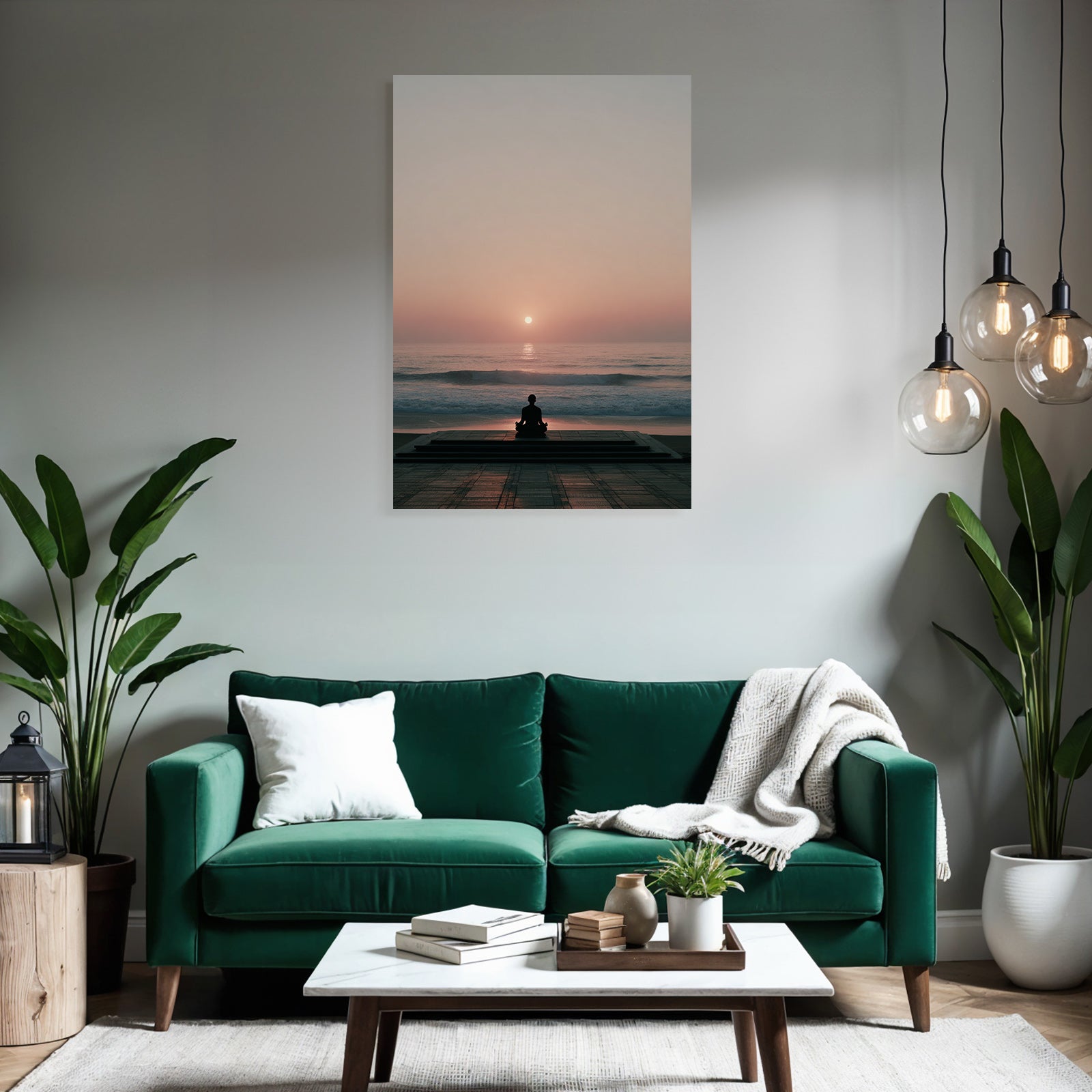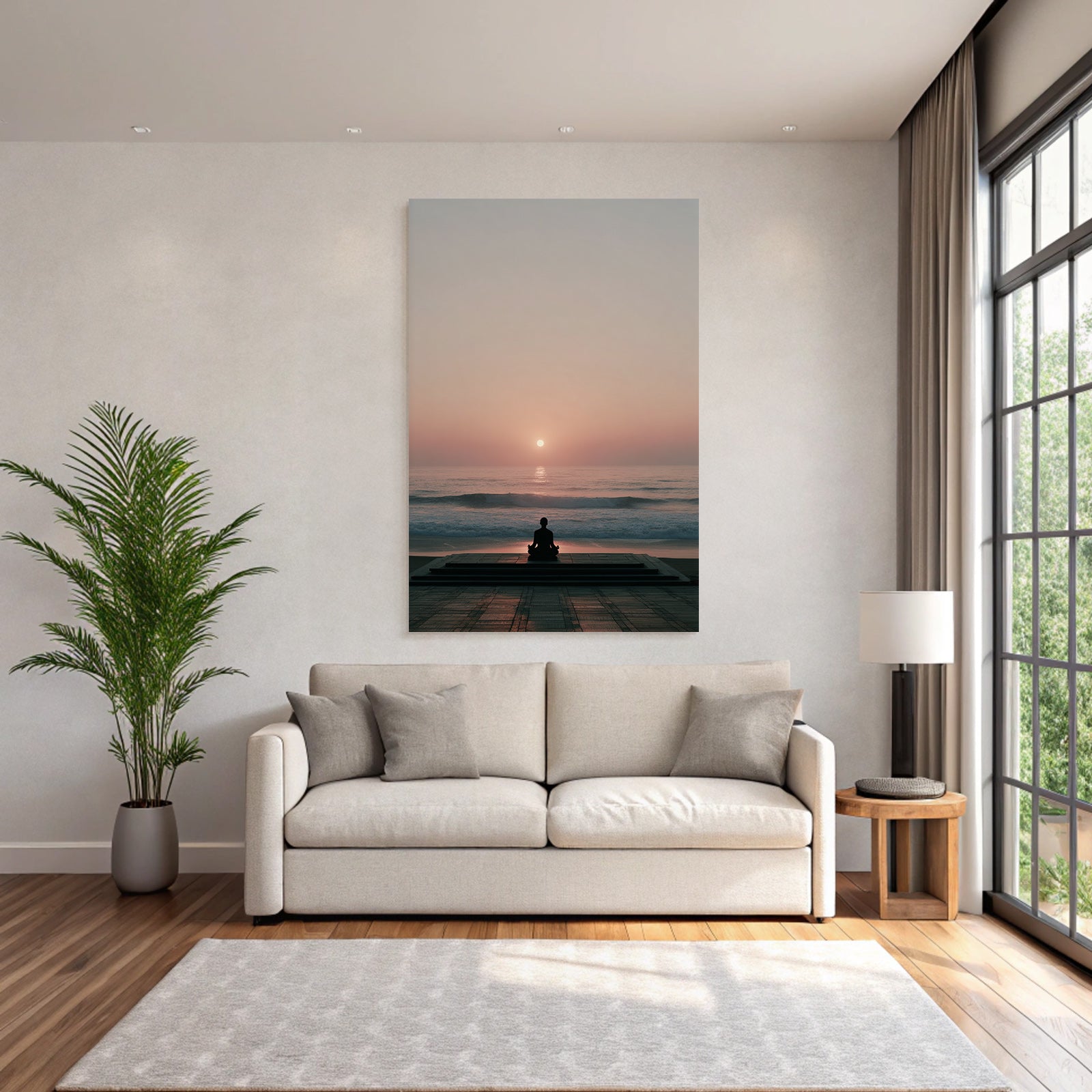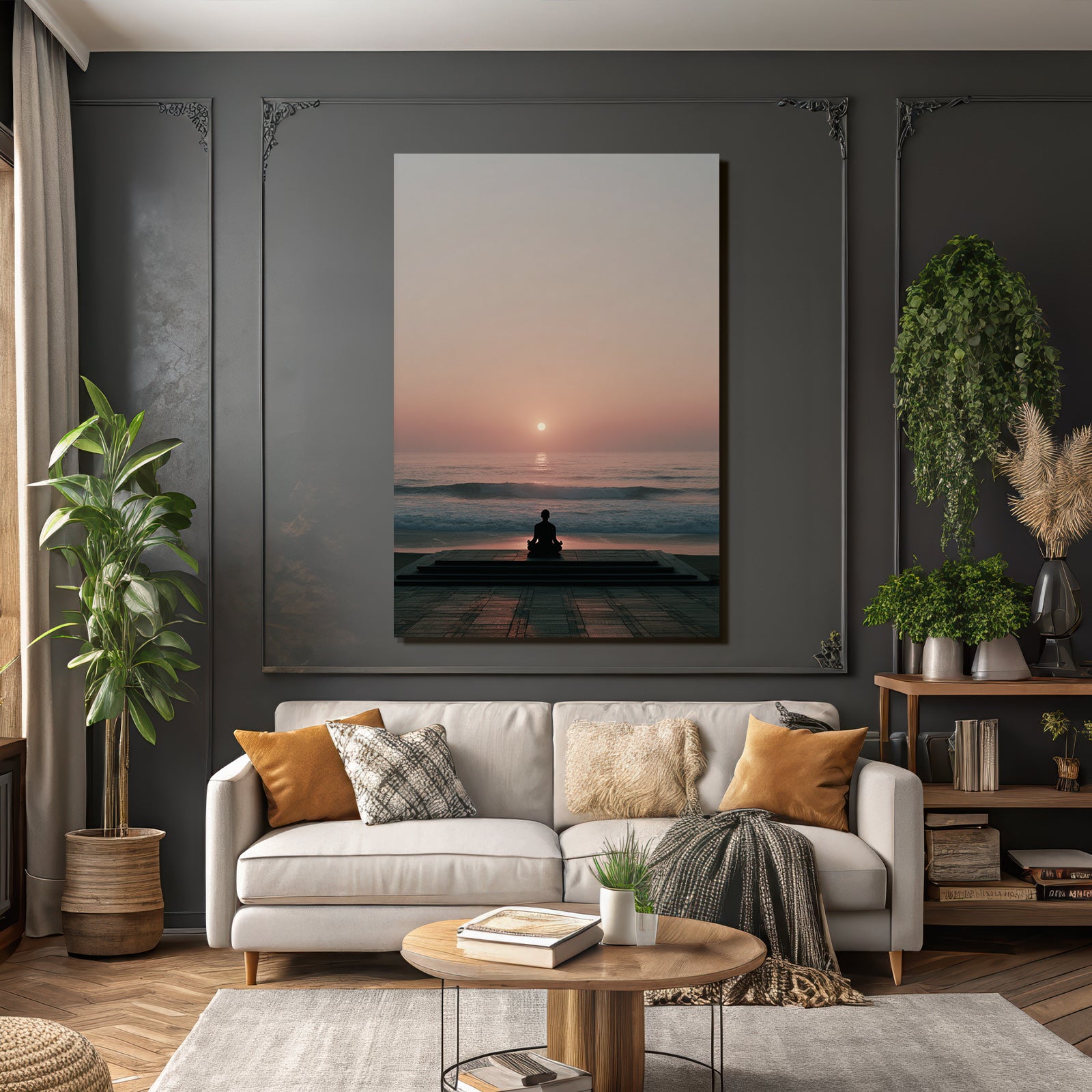 Ob für eine exklusive Boutique, ein modernes Restaurant oder Ihr Esszimmer – „Yoga Meditation Meditierende Person Am Strand Bei Sonnenuntergang“ im Yoga und Meditation-Design schafft im FameFrame™ ein unvergessliches Ambiente.
