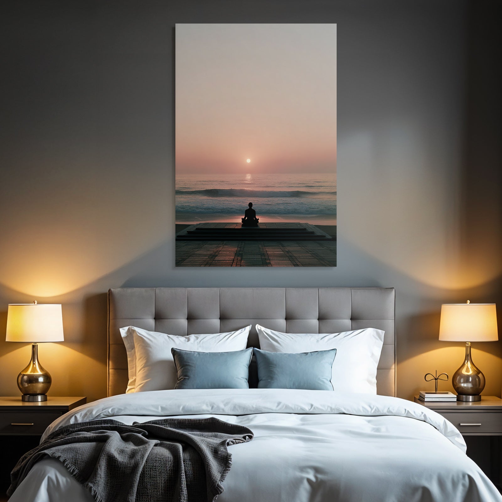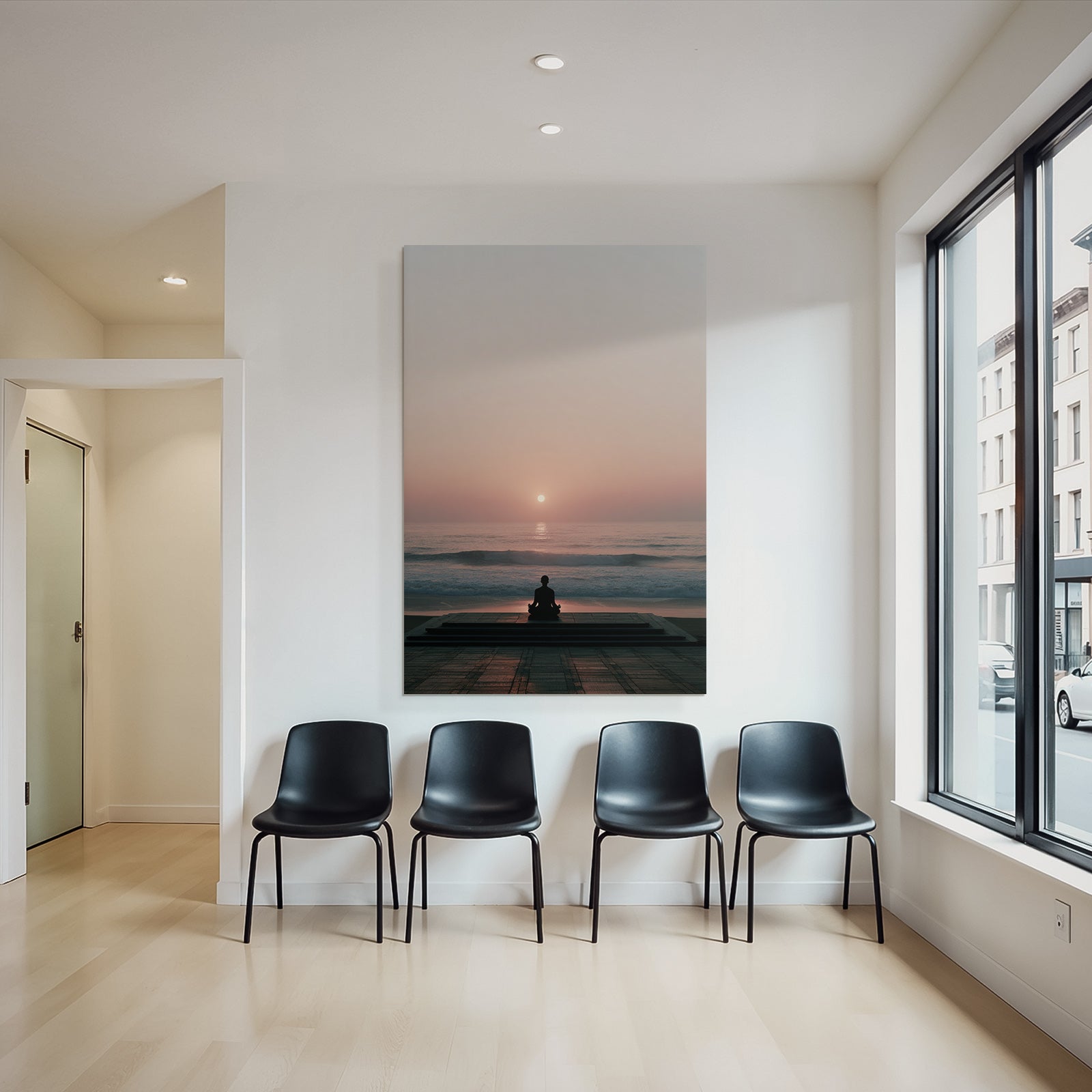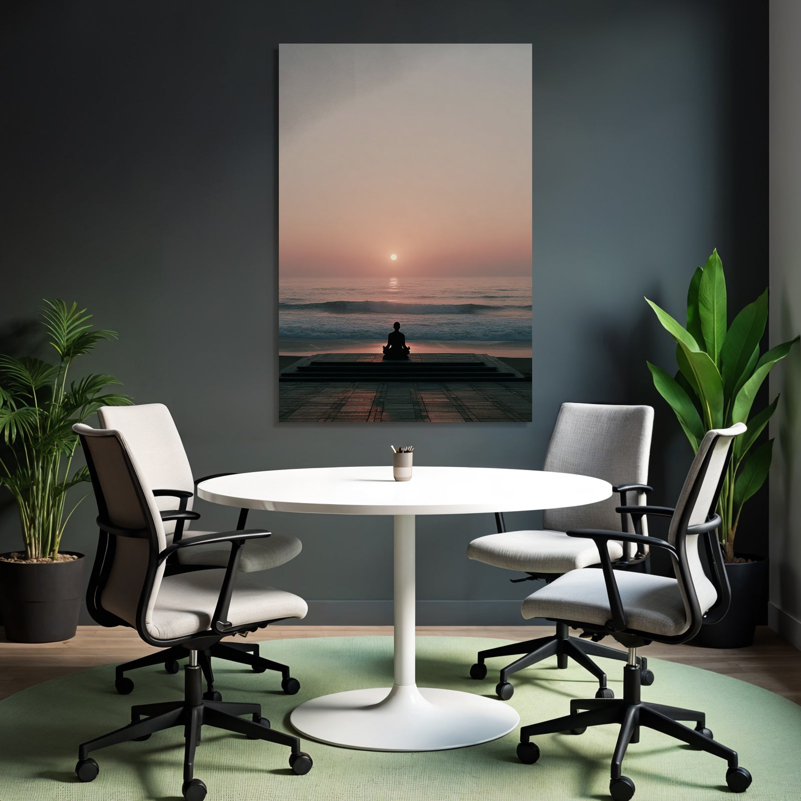 Ob für eine exklusive Boutique, ein modernes Restaurant oder Ihr Esszimmer – „Yoga Meditation Meditierende Person Am Strand Bei Sonnenuntergang“ im Yoga und Meditation-Design schafft im FameFrame™ ein unvergessliches Ambiente.