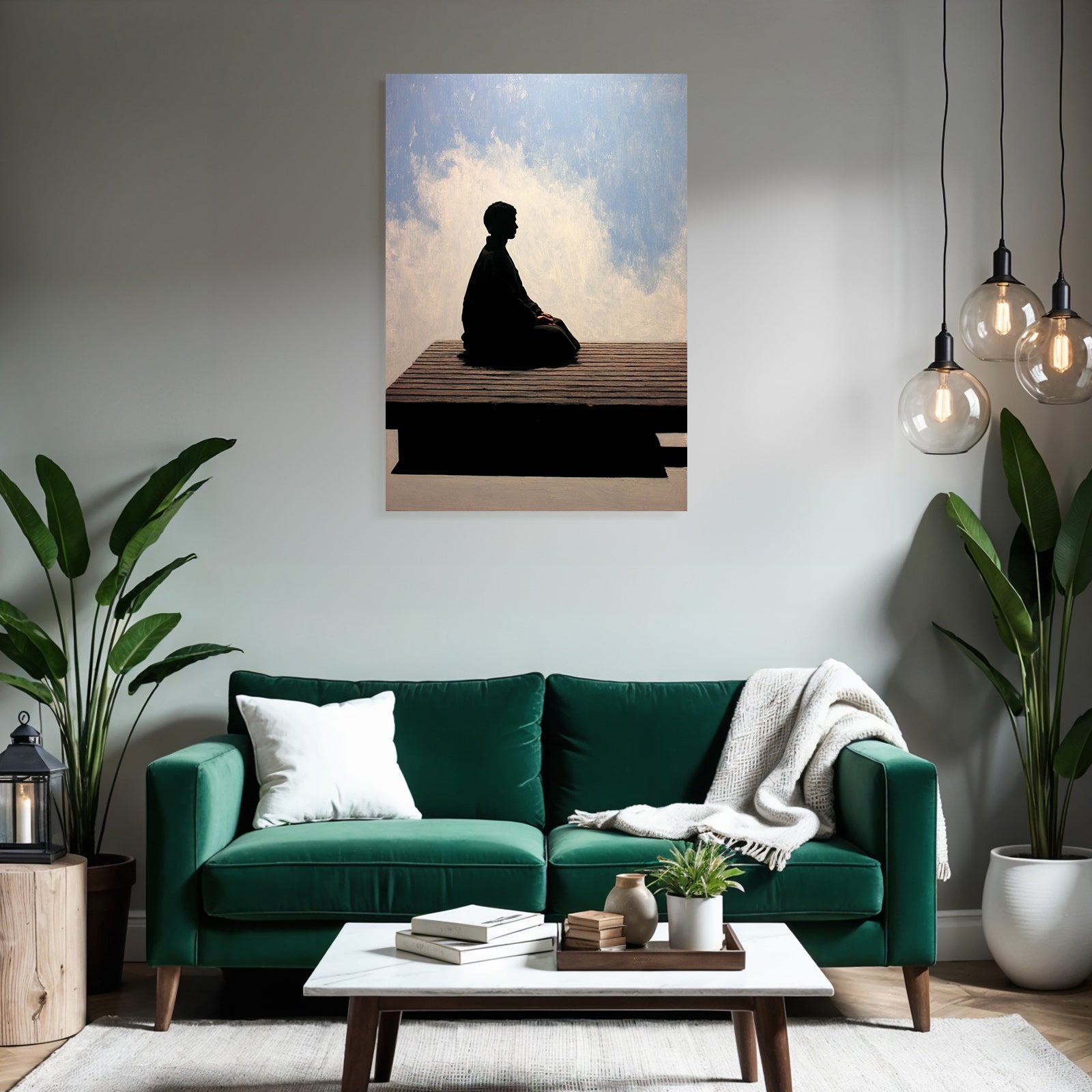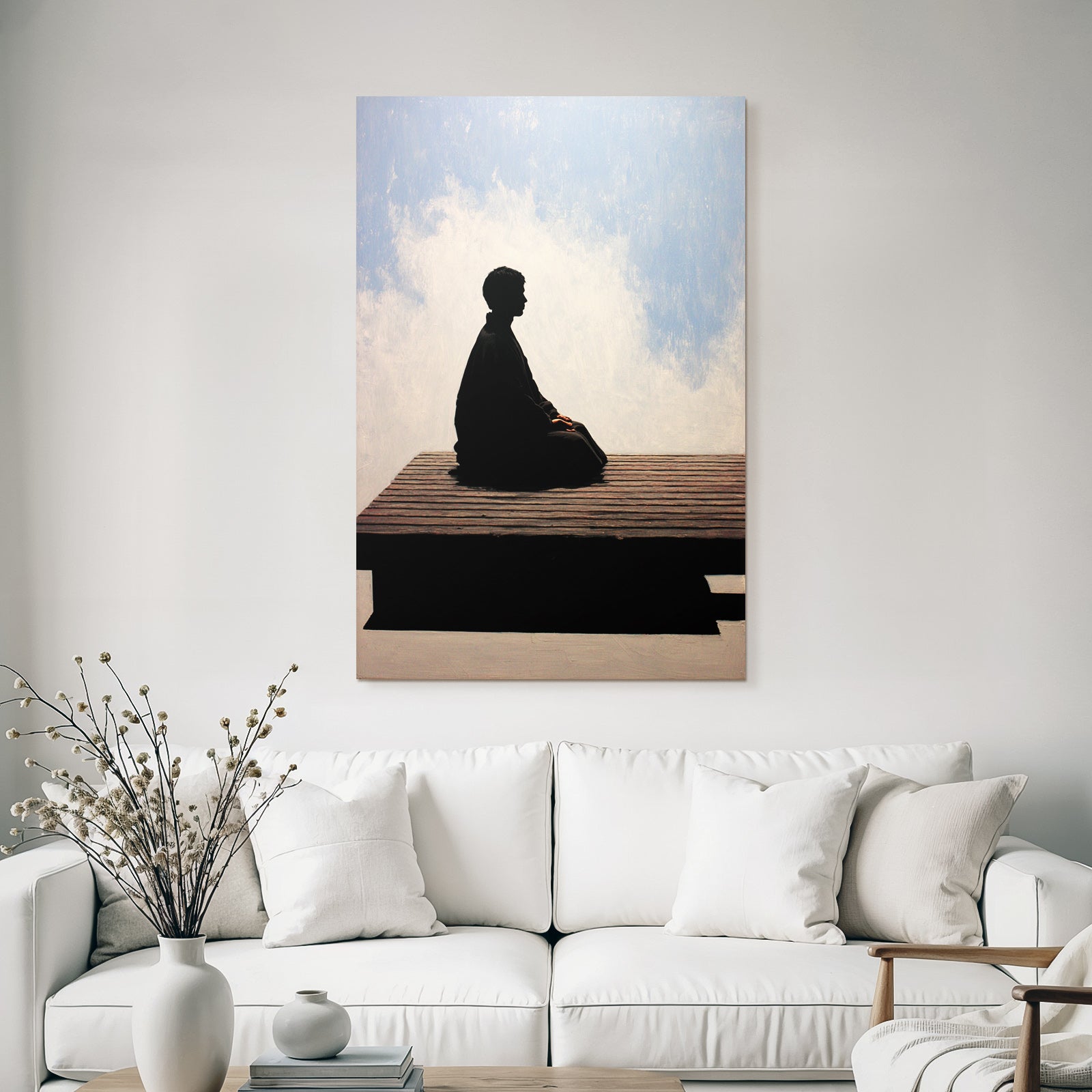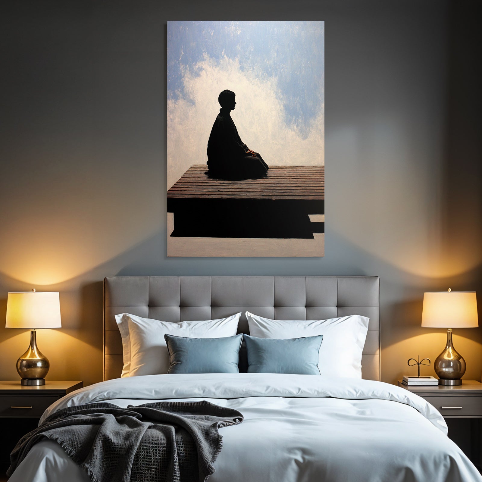 Verwandeln Sie Ihr Schlafzimmer in eine Oase der Ruhe. Das Motiv „Yoga Meditation Meditierende Person Auf Platform Mit Blaüm Himmel Und Wolken“ im Stil Yoga und Meditation wirkt im FameFrame™ besonders harmonisch und beruhigend.