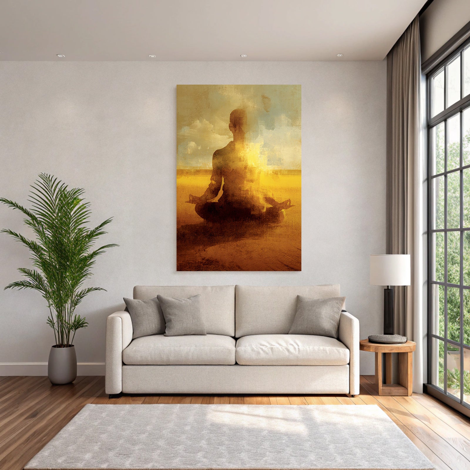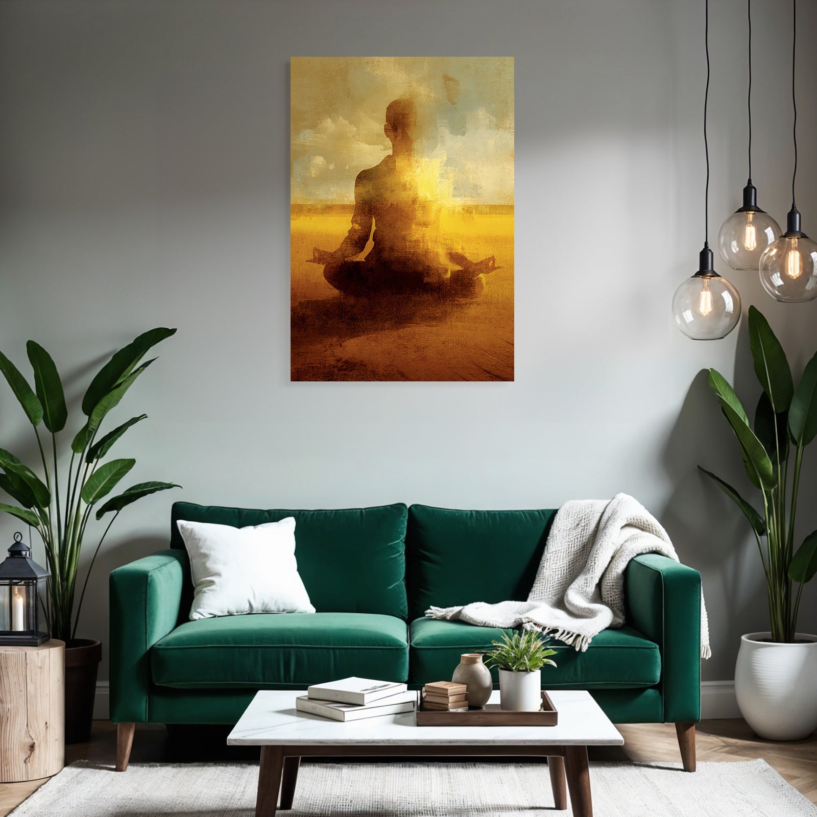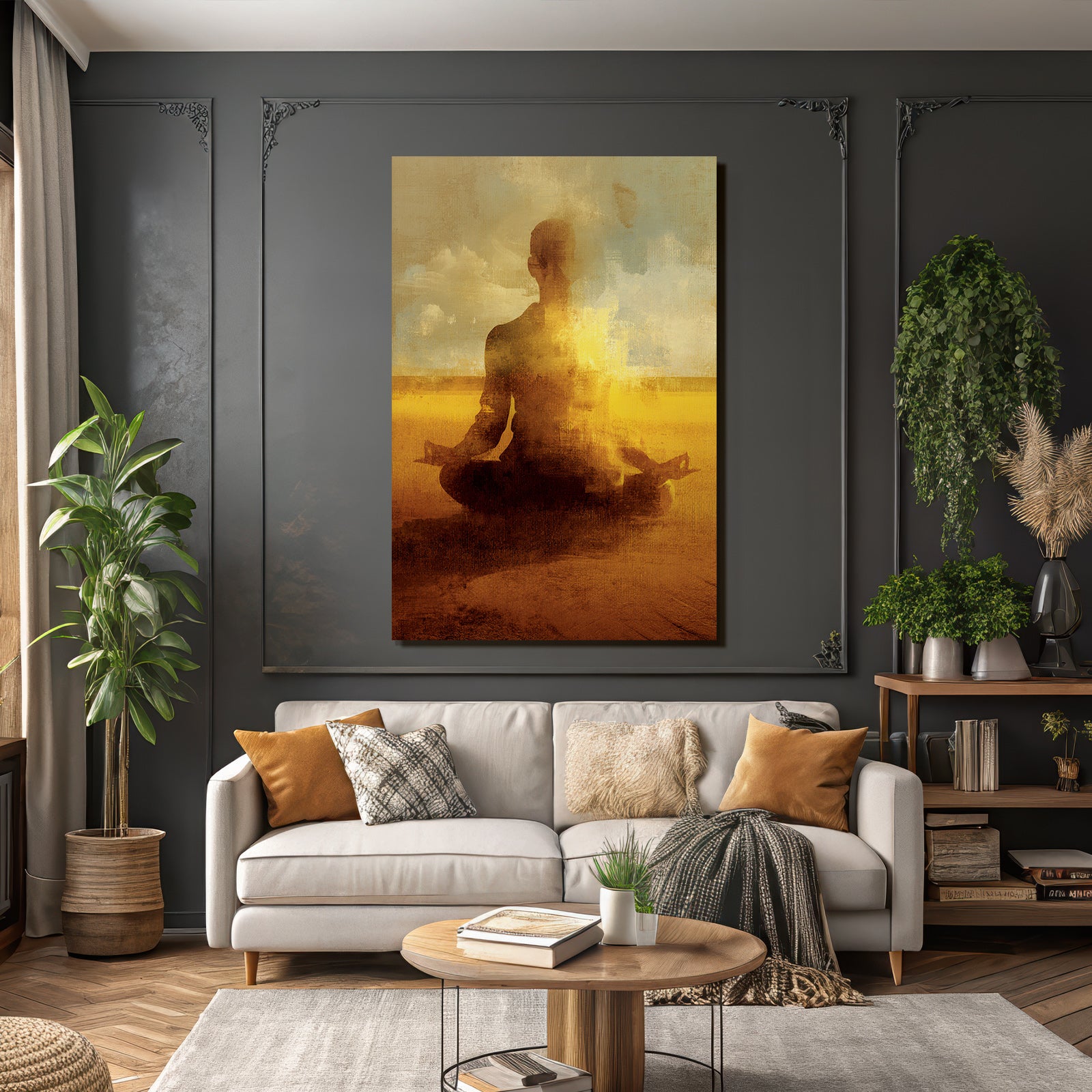 Dieses Kunstwerk zelebriert den Stil Yoga und Meditation. Die klaren Linien (oder organischen Formen) von „Yoga Meditation Meditierender Mensch Im Erdton Hintergrund Serenität“ werden durch den minimalistischen FameFrame™ elegant betont.