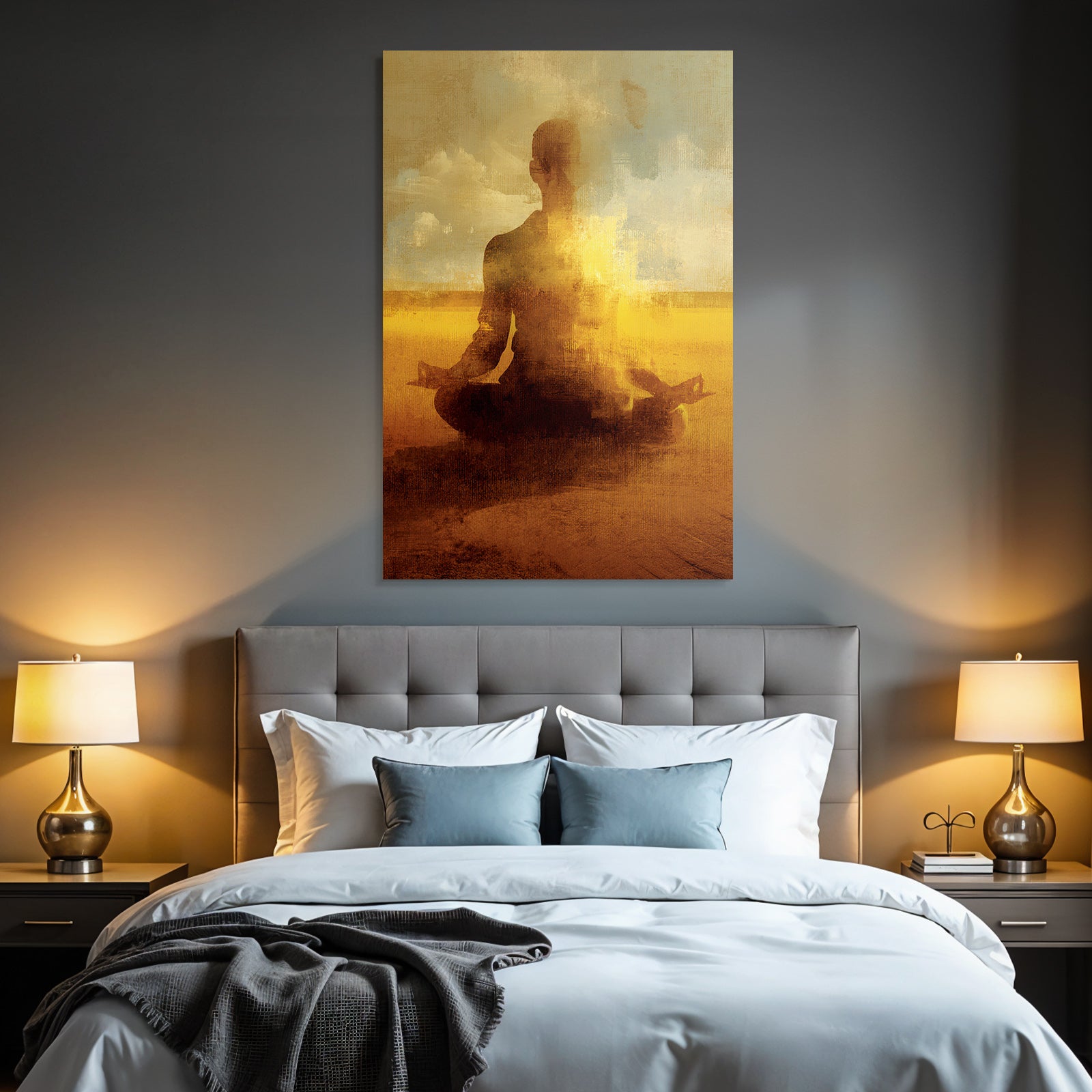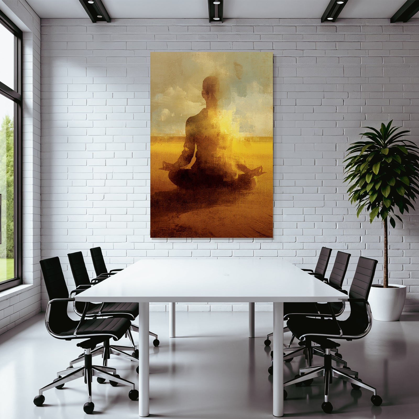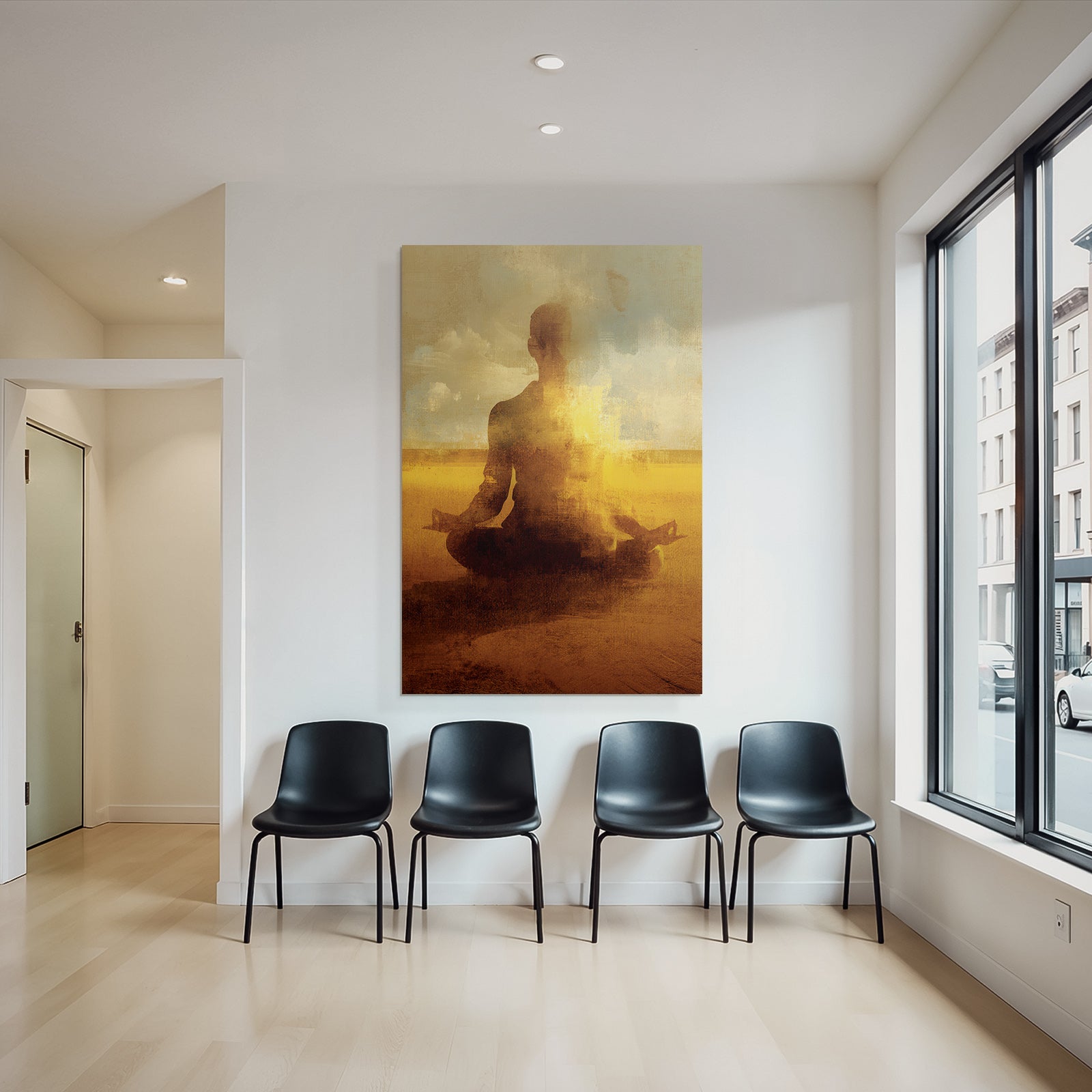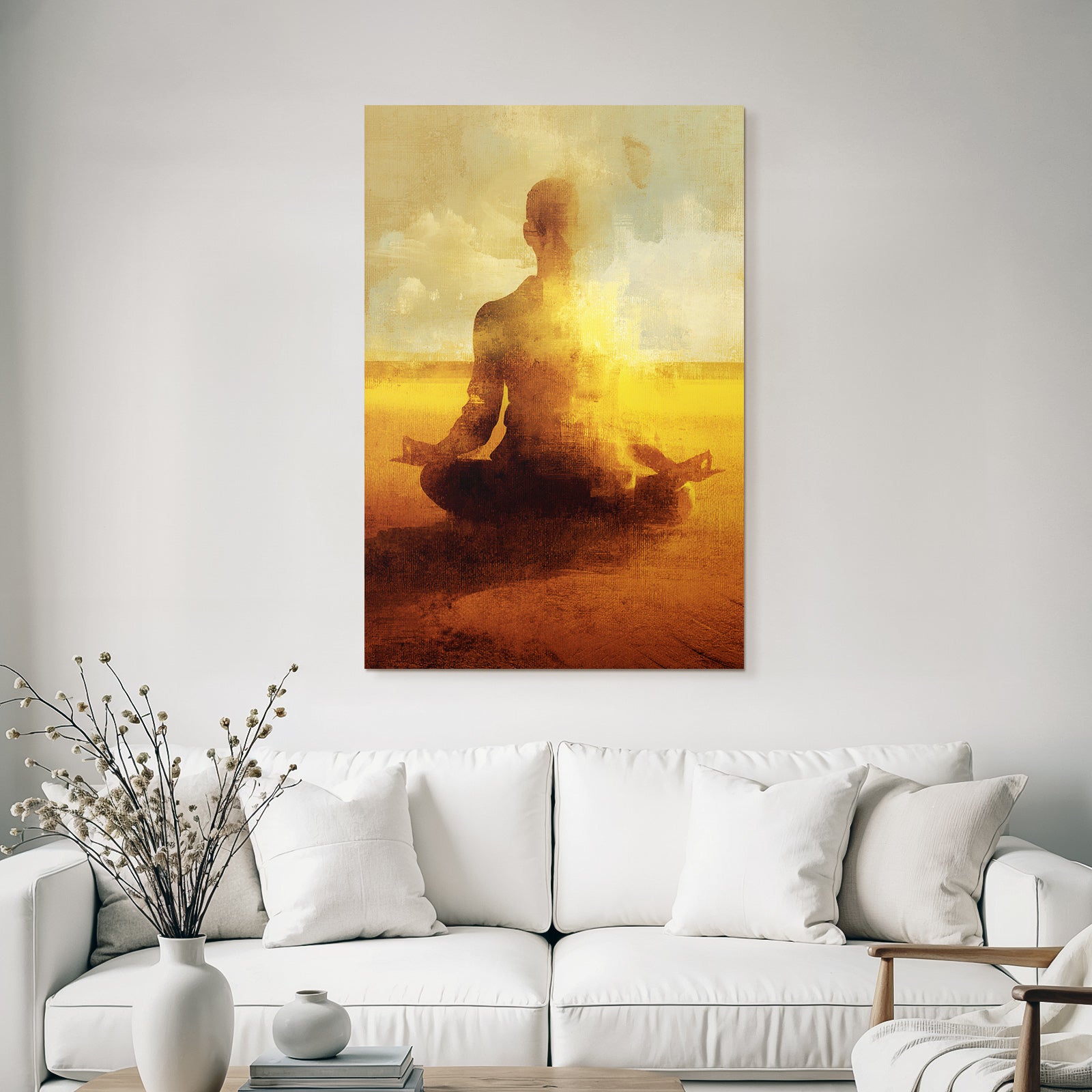 Dieses Kunstwerk zelebriert den Stil Yoga und Meditation. Die klaren Linien (oder organischen Formen) von „Yoga Meditation Meditierender Mensch Im Erdton Hintergrund Serenität“ werden durch den minimalistischen FameFrame™ elegant betont.