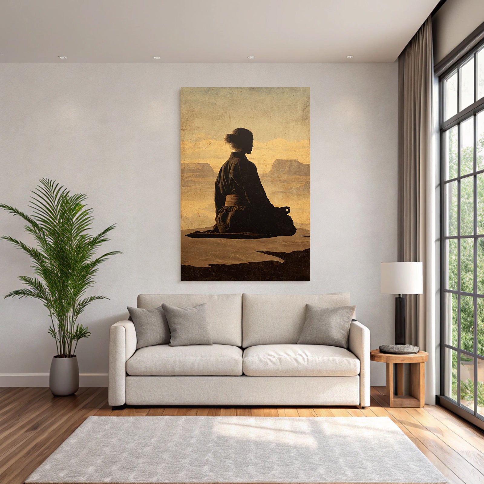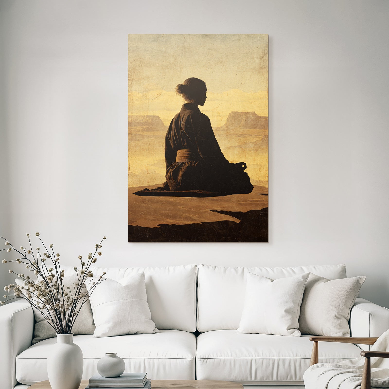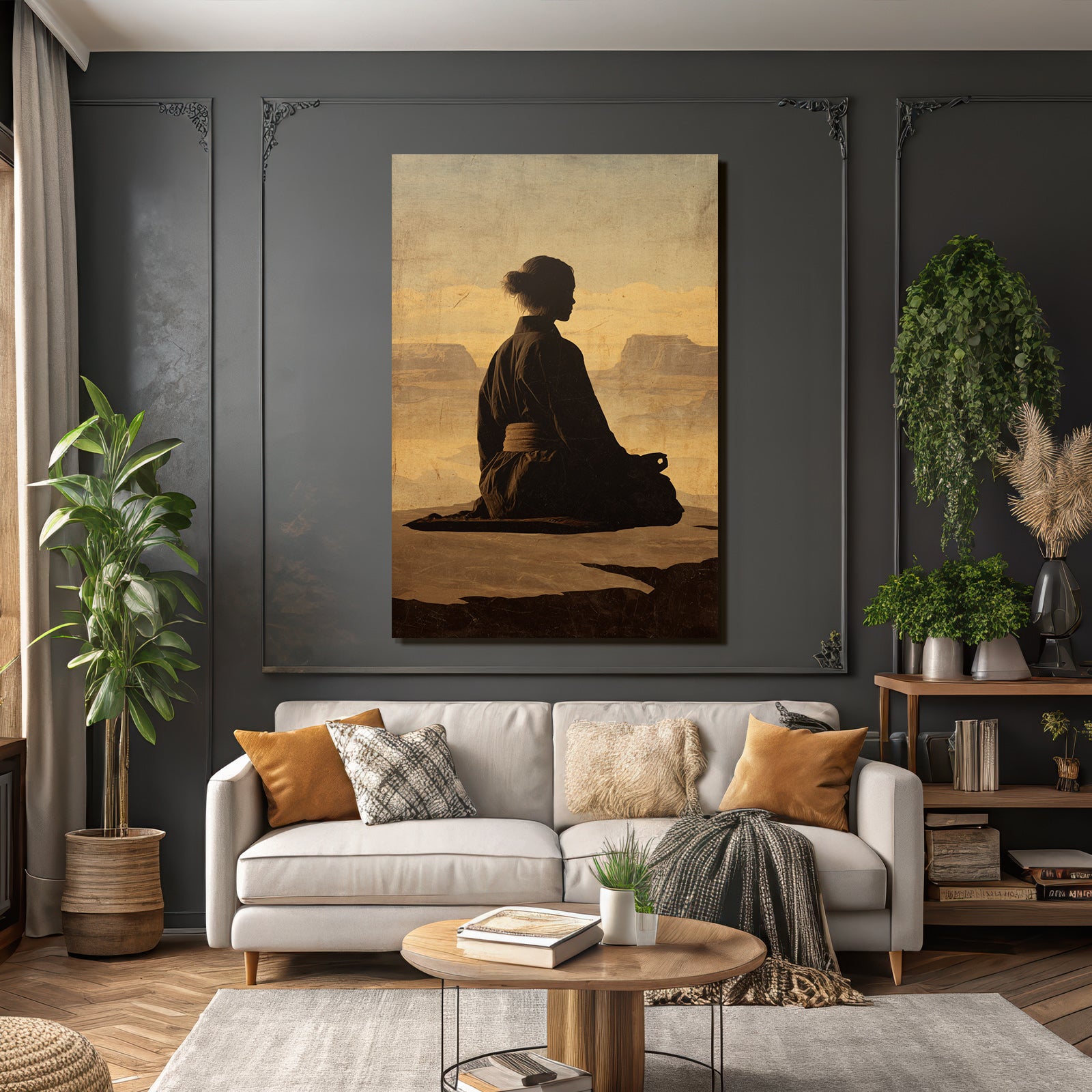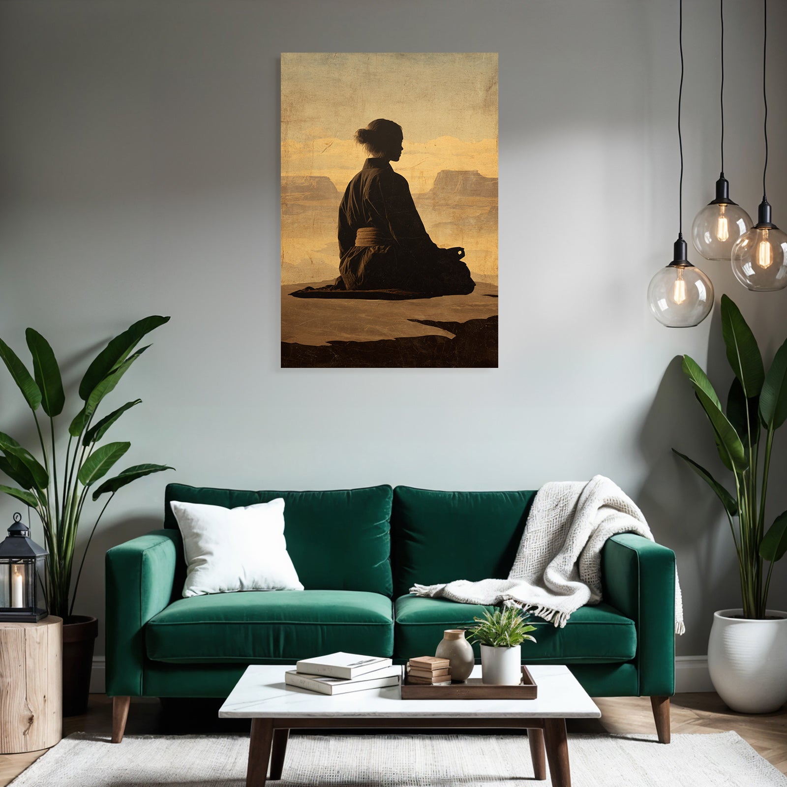 Dieses Kunstwerk zelebriert den Stil Yoga und Meditation. Die klaren Linien (oder organischen Formen) von „Yoga Meditation Meditierender Mensch In Der Natur Vintage Stil“ werden durch den minimalistischen FameFrame™ elegant betont.