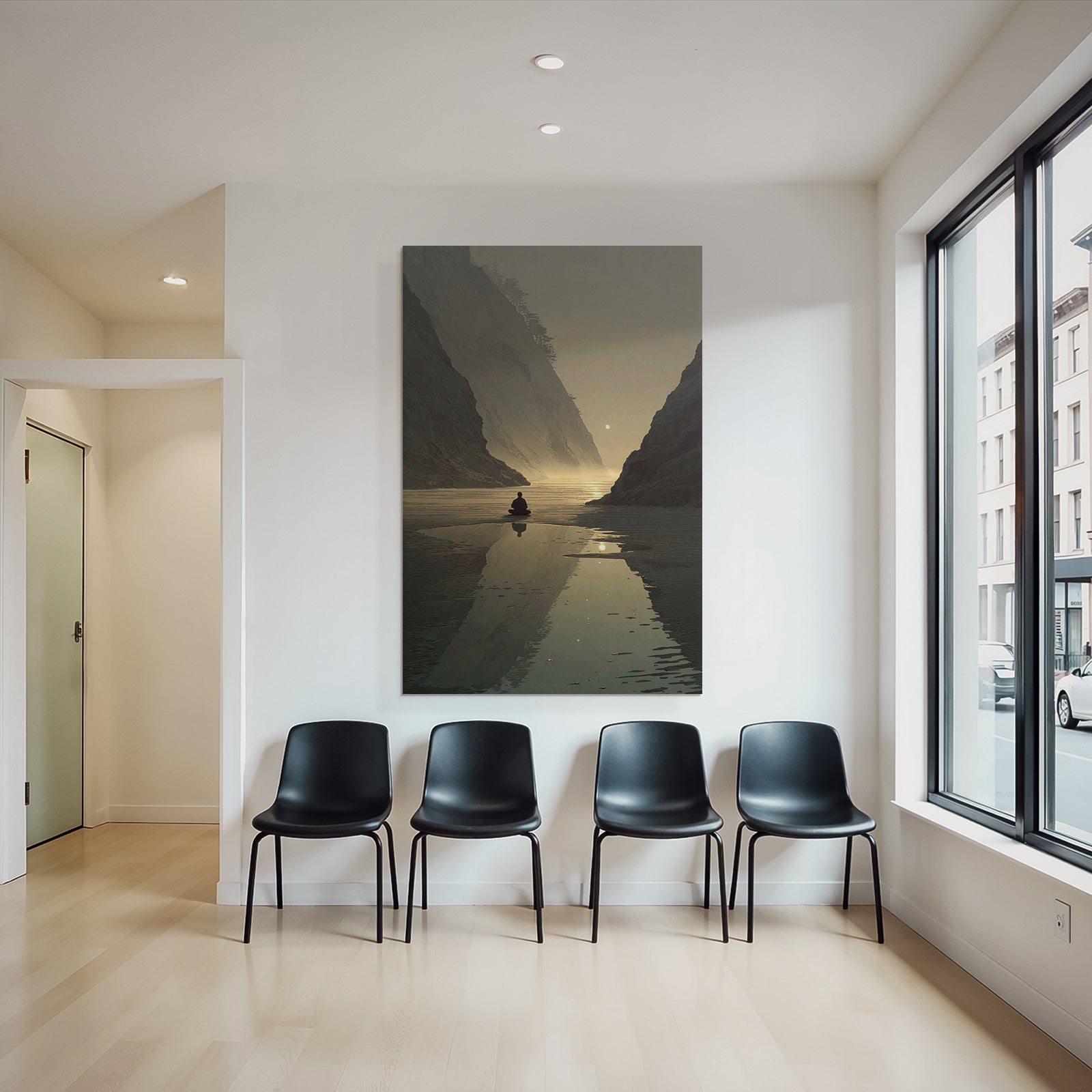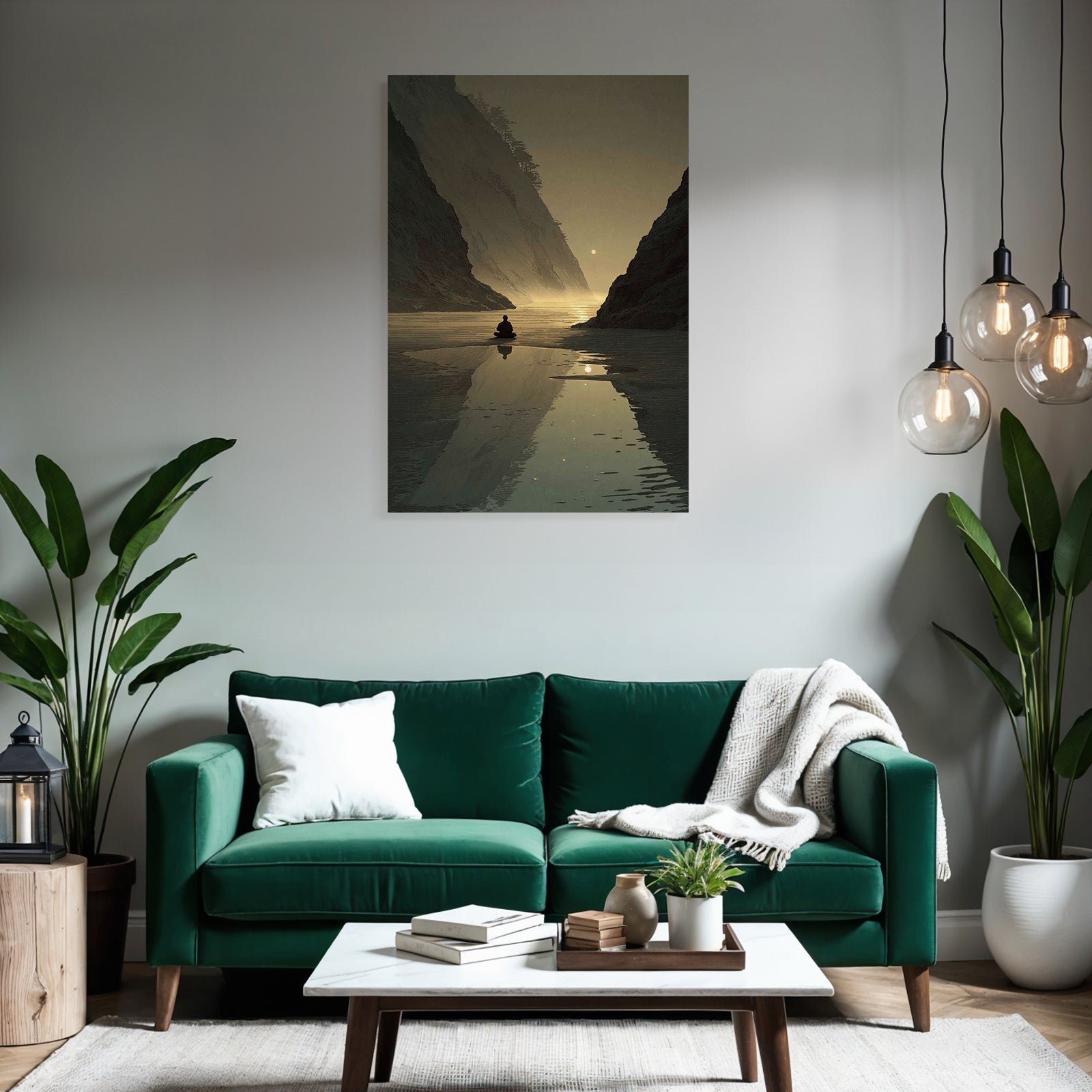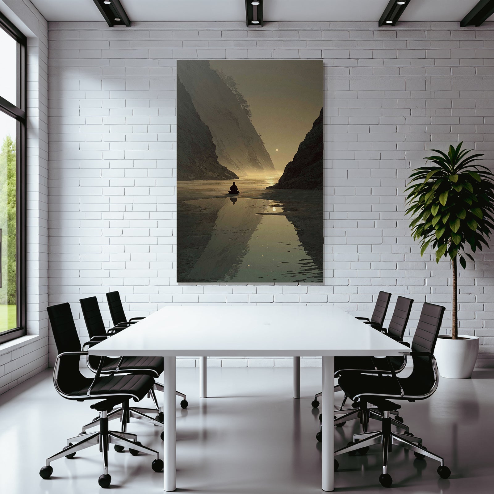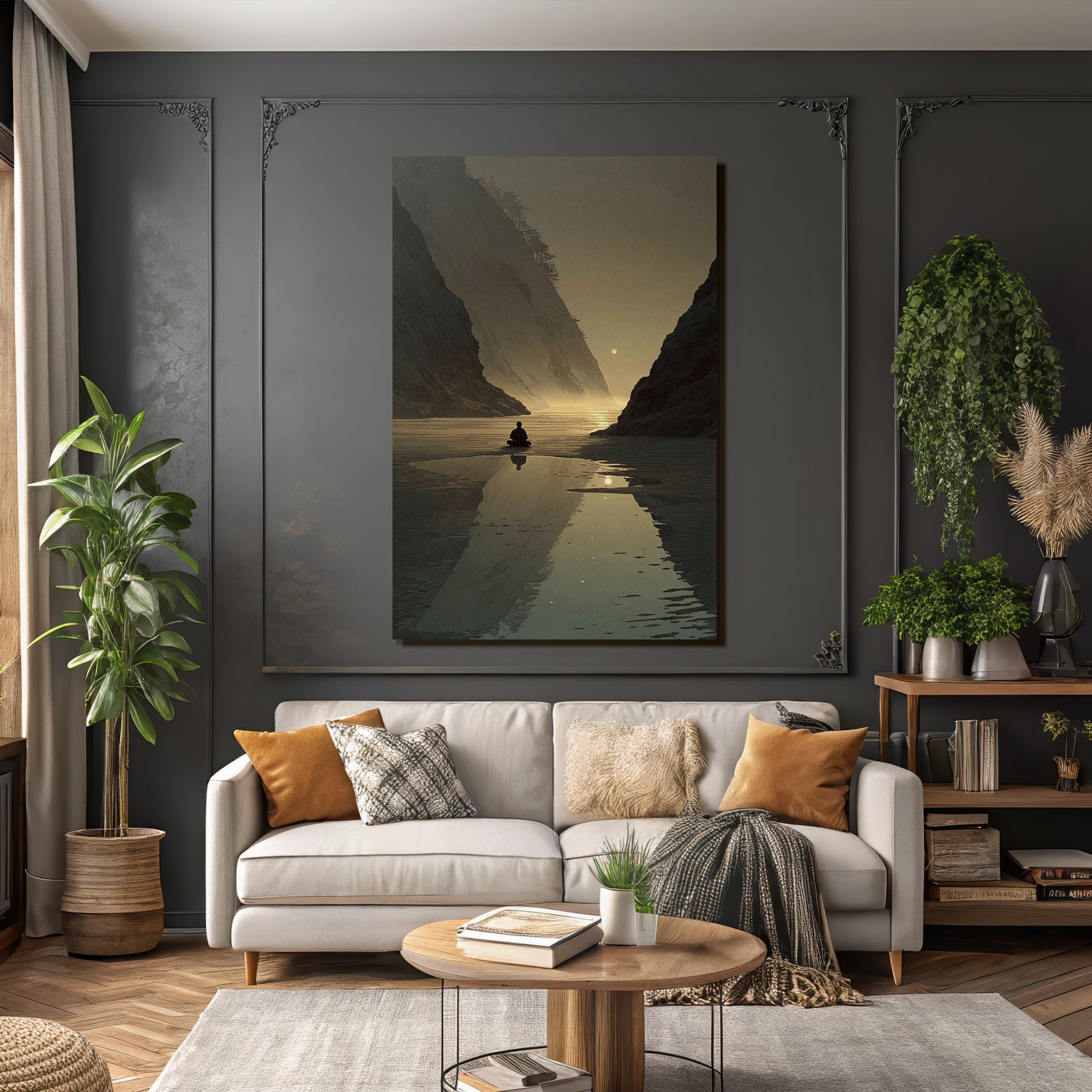 Mach mehr aus Deinem Wohnbereich oder Besprechungszimmer – „Yoga Meditation Ruhige Landschaft Meditierende Person Am Wasser Sonnenuntergang“ im Stil Yoga und Meditation überzeugt als eleganter Textildruck im FameFrame™.