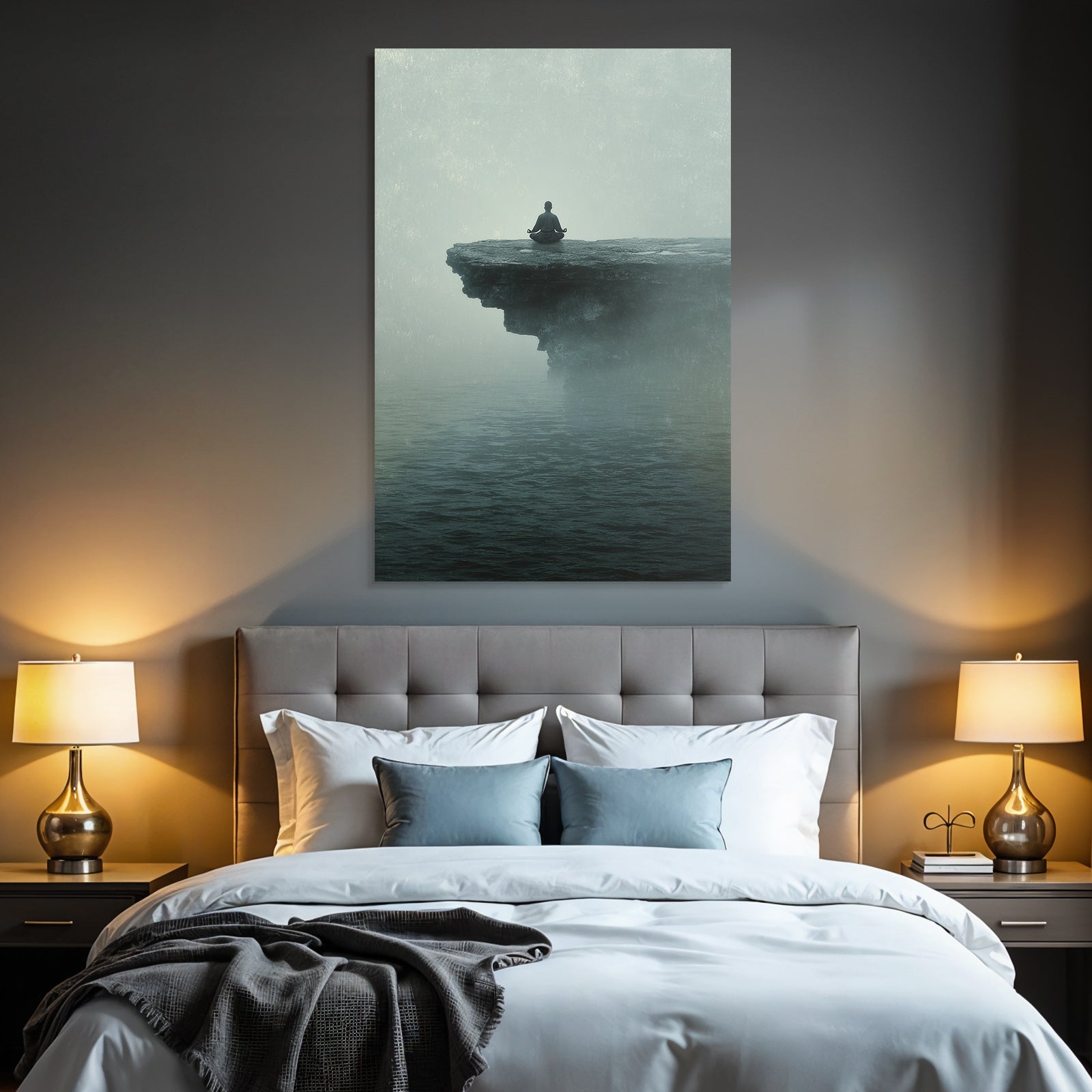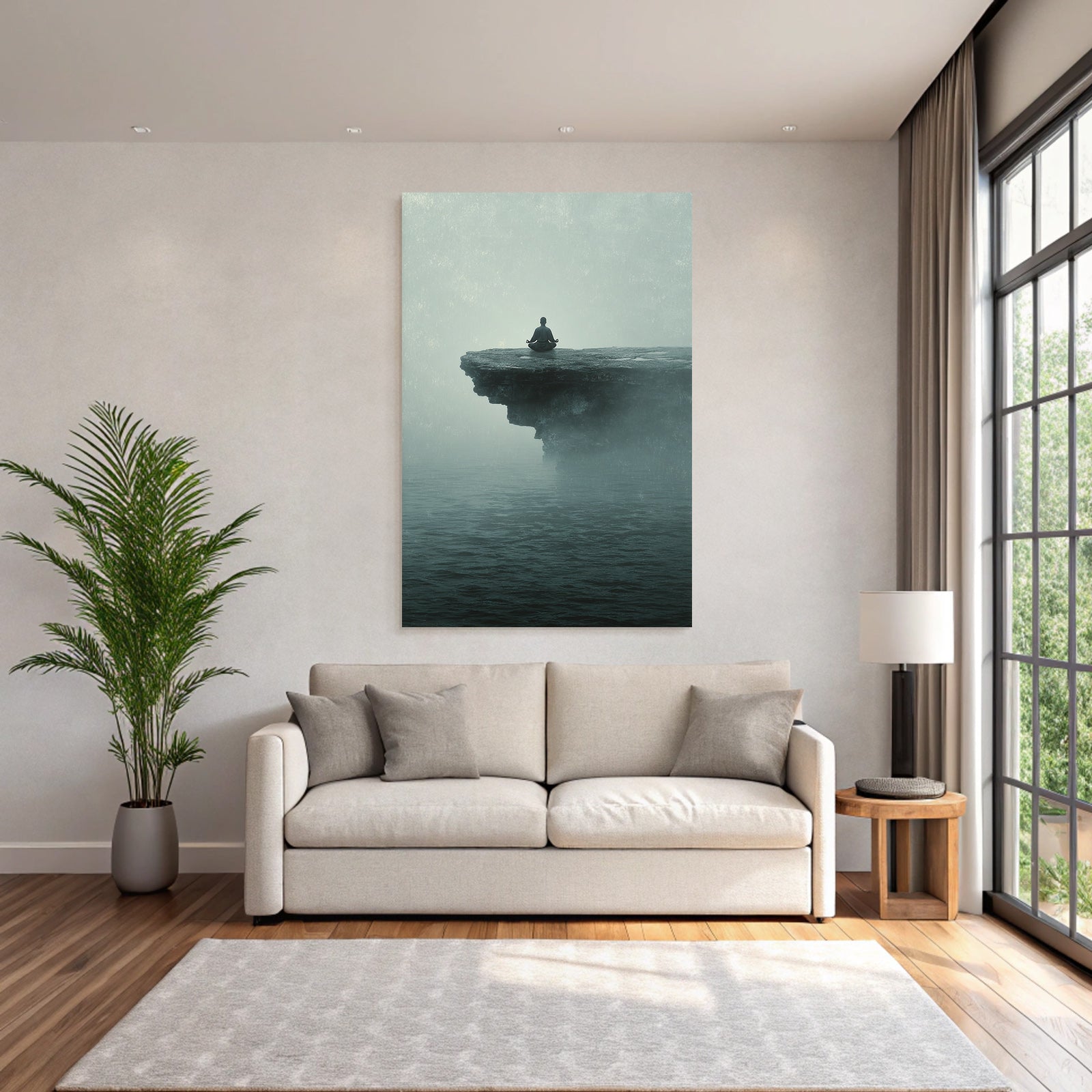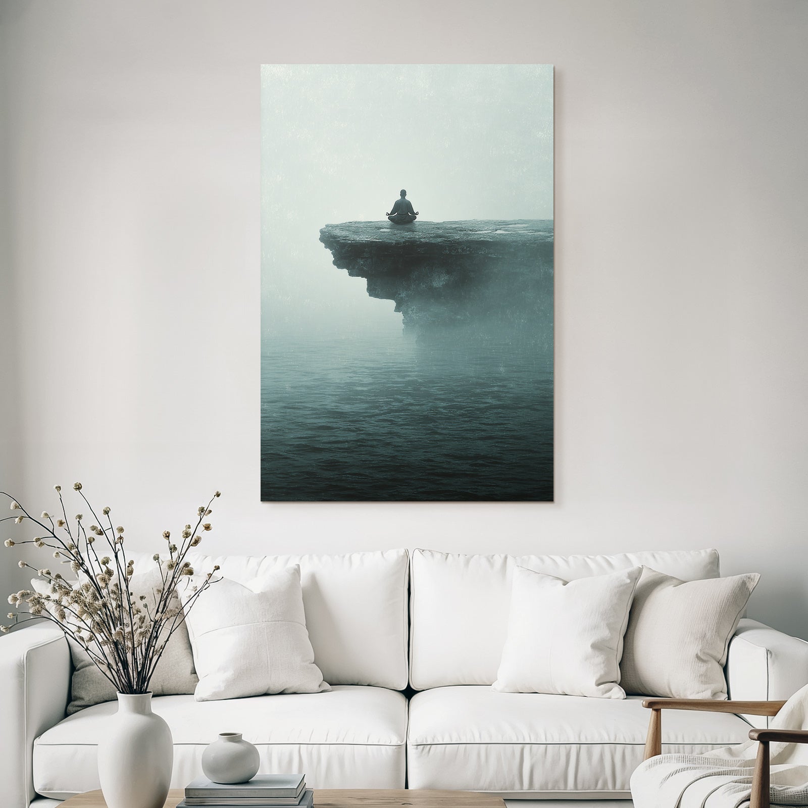 „Yoga Meditation Ruhige Medidation Auf Einem Felsen Am Wasser Mit Nebel Und Stille“ im Stil Yoga und Meditation sorgt für stilvolle Ruhe im Schlafzimmer oder inspirierende Energie im Büro – perfekt im FameFrame™ inszeniert.