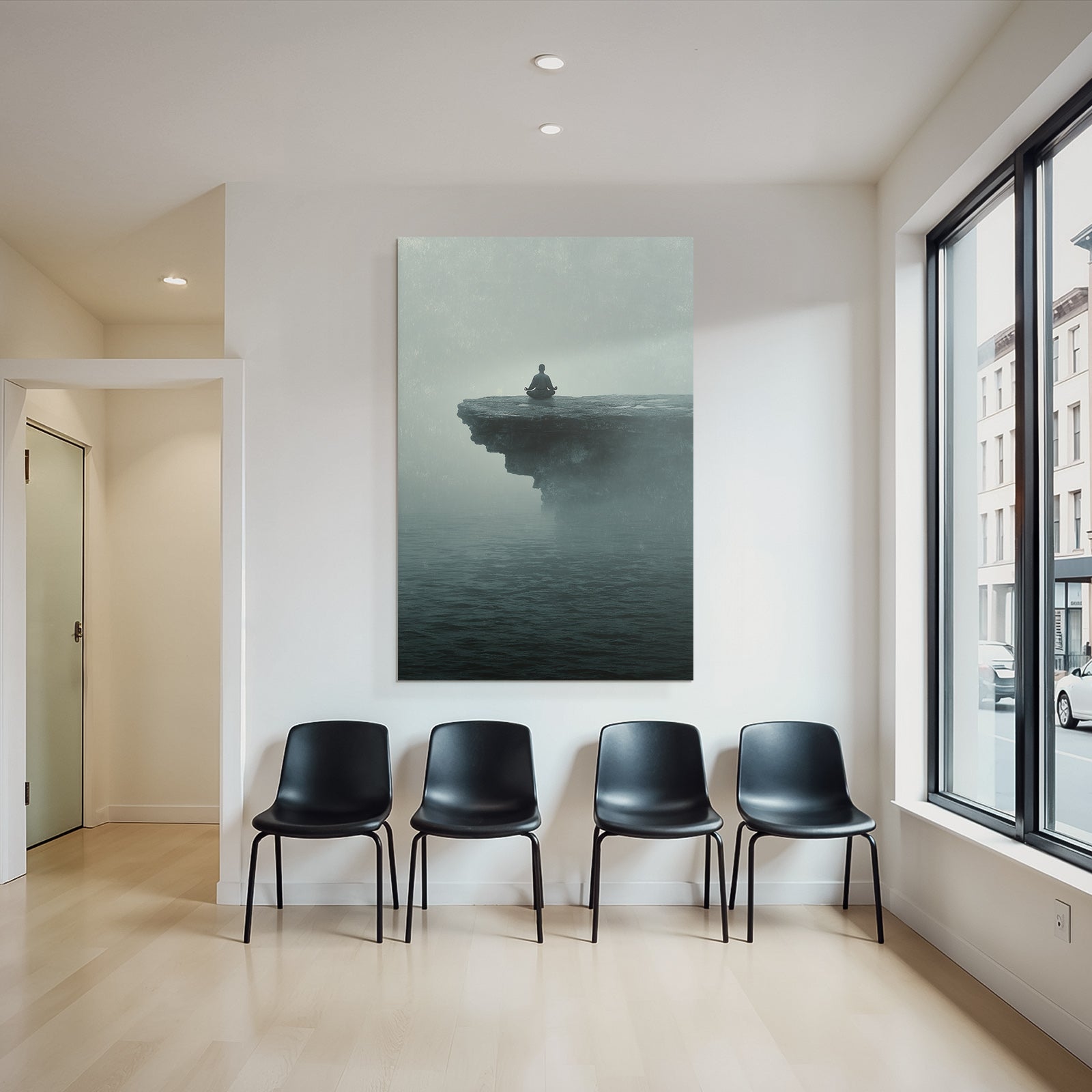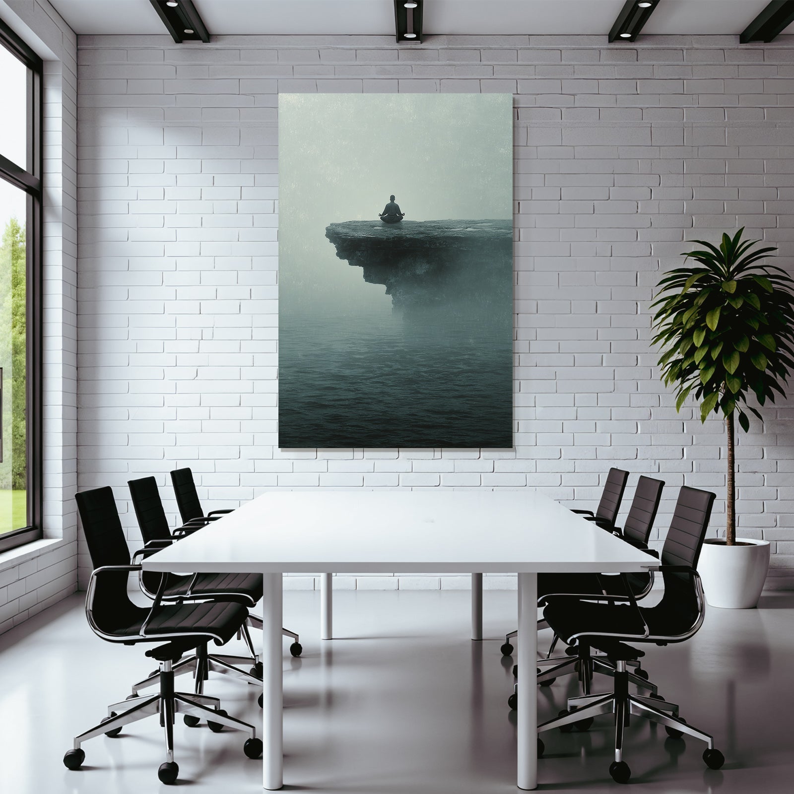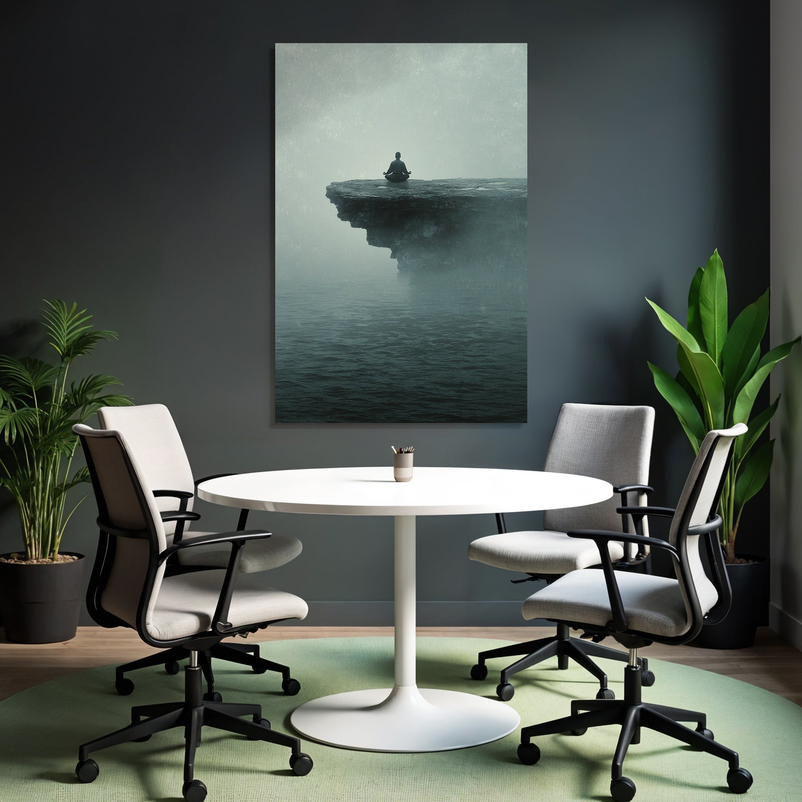 „Yoga Meditation Ruhige Medidation Auf Einem Felsen Am Wasser Mit Nebel Und Stille“ im Stil Yoga und Meditation sorgt für stilvolle Ruhe im Schlafzimmer oder inspirierende Energie im Büro – perfekt im FameFrame™ inszeniert.
