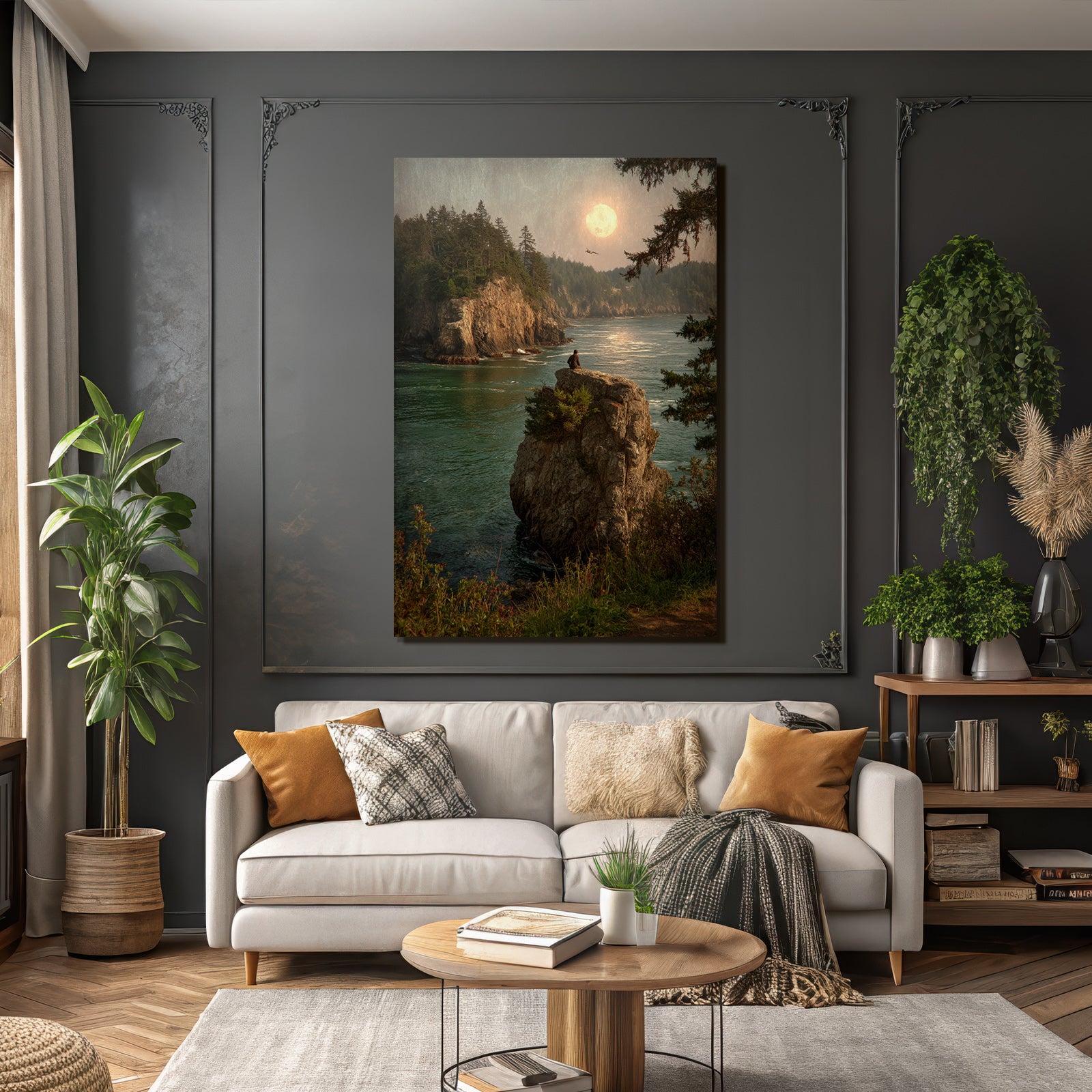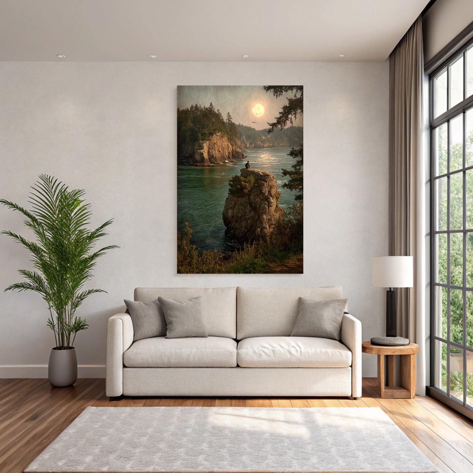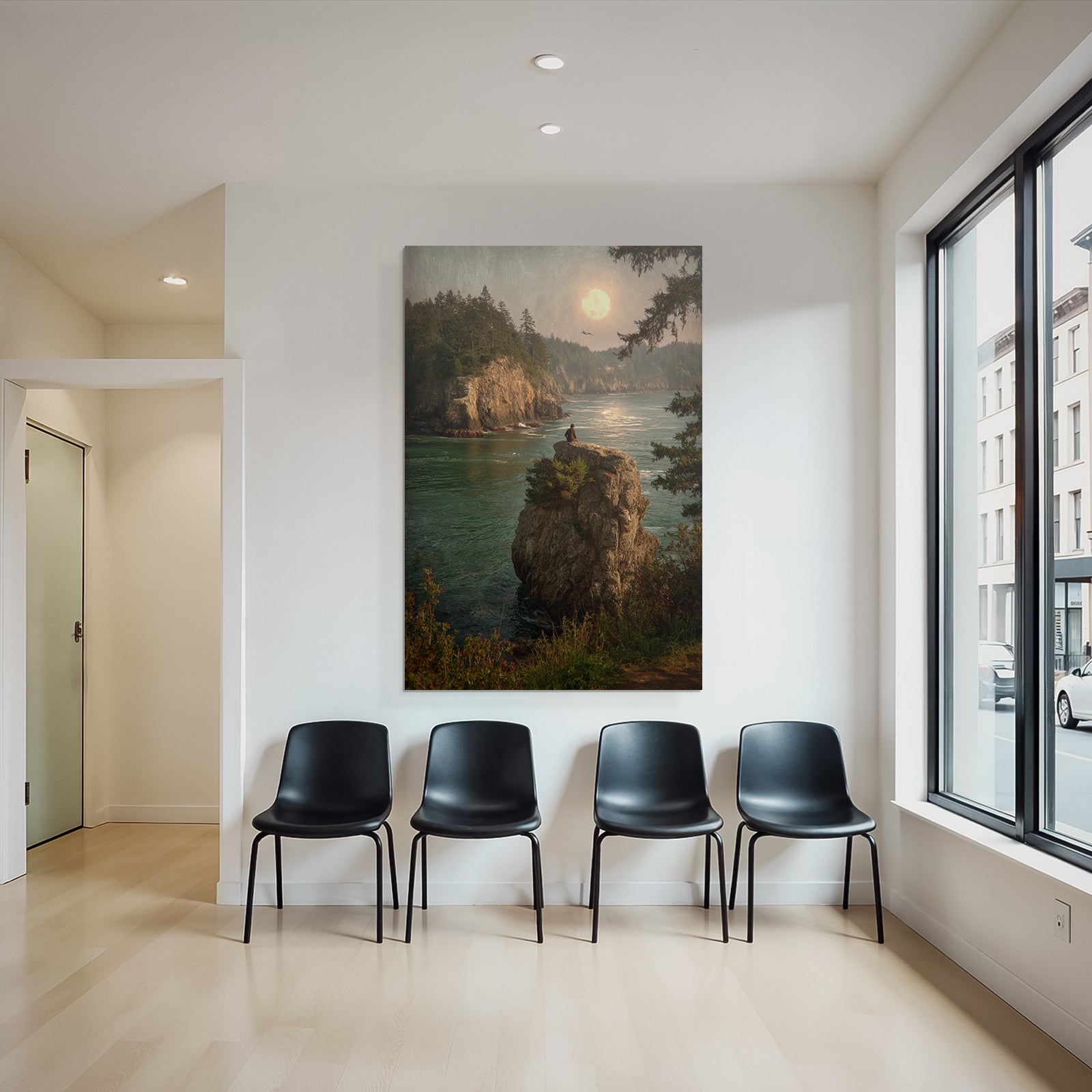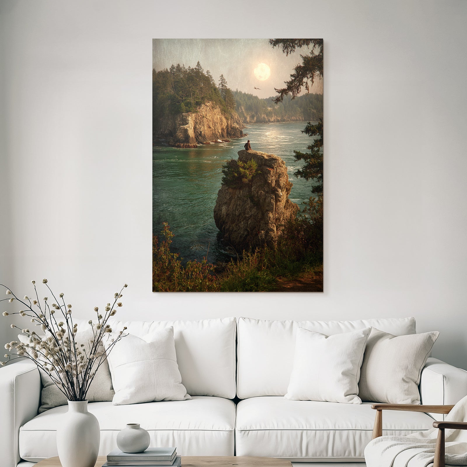 Mach mehr aus Deinem Wohnbereich oder Besprechungszimmer – „Yoga Meditation Ruhige Natur Landschaft Klippen Und Wasser“ im Stil Yoga und Meditation überzeugt als eleganter Textildruck im FameFrame™.