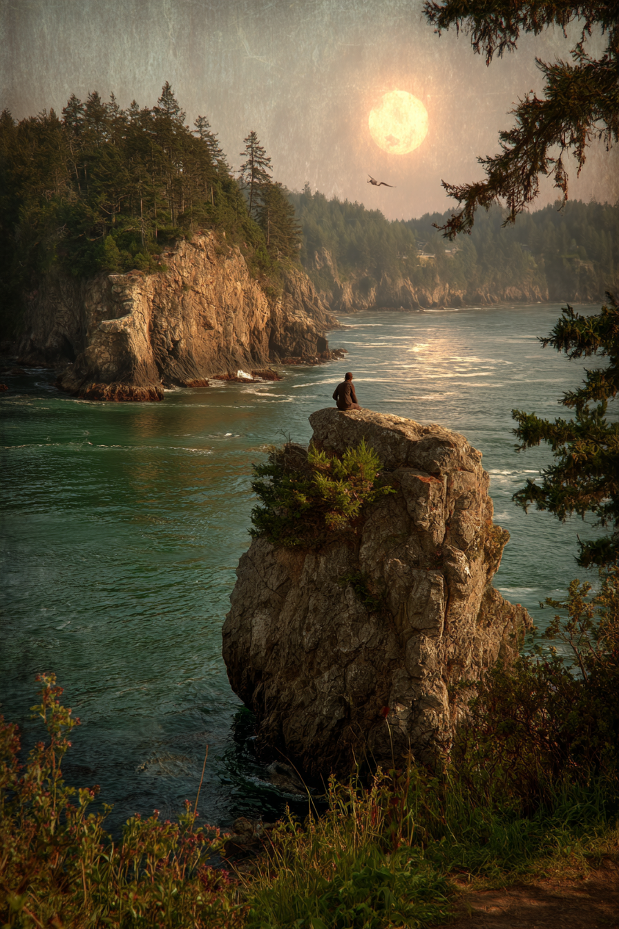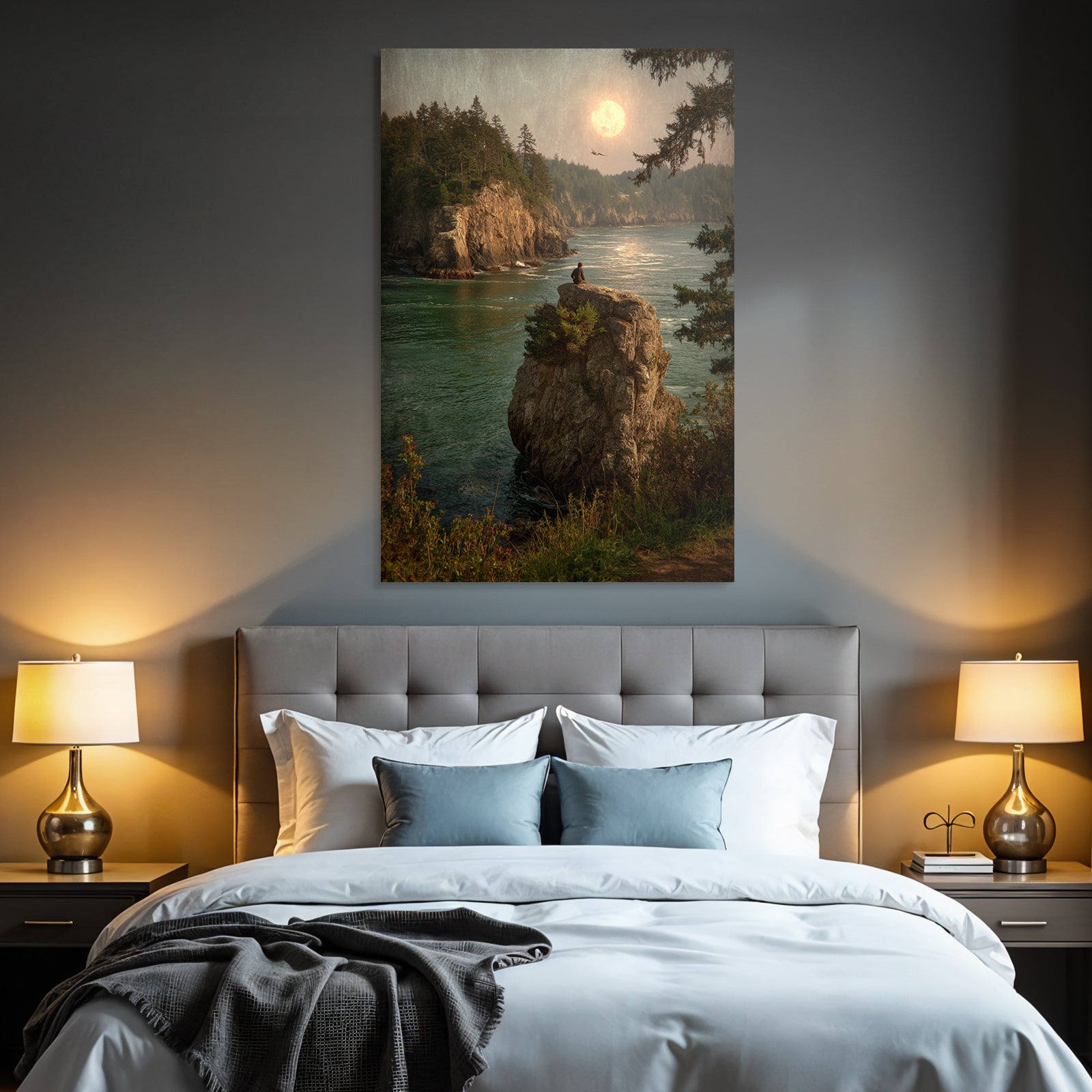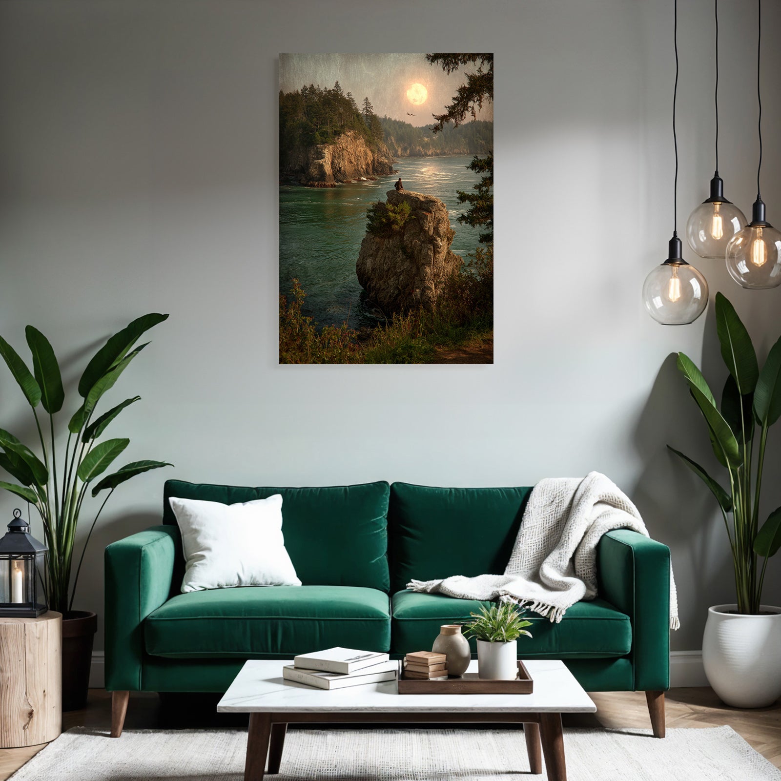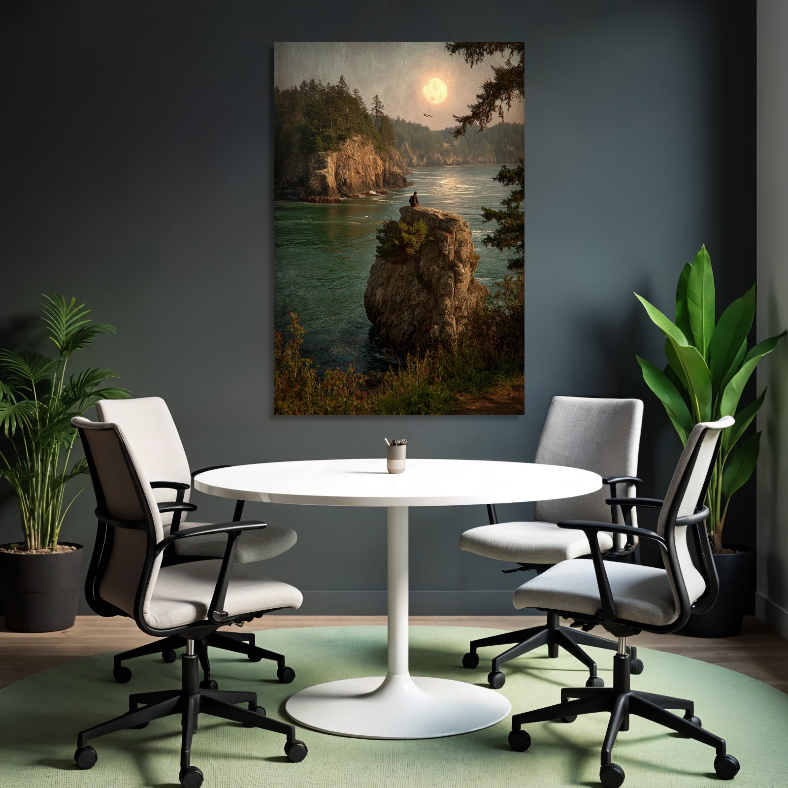 Mach mehr aus Deinem Wohnbereich oder Besprechungszimmer – „Yoga Meditation Ruhige Natur Landschaft Klippen Und Wasser“ im Stil Yoga und Meditation überzeugt als eleganter Textildruck im FameFrame™.