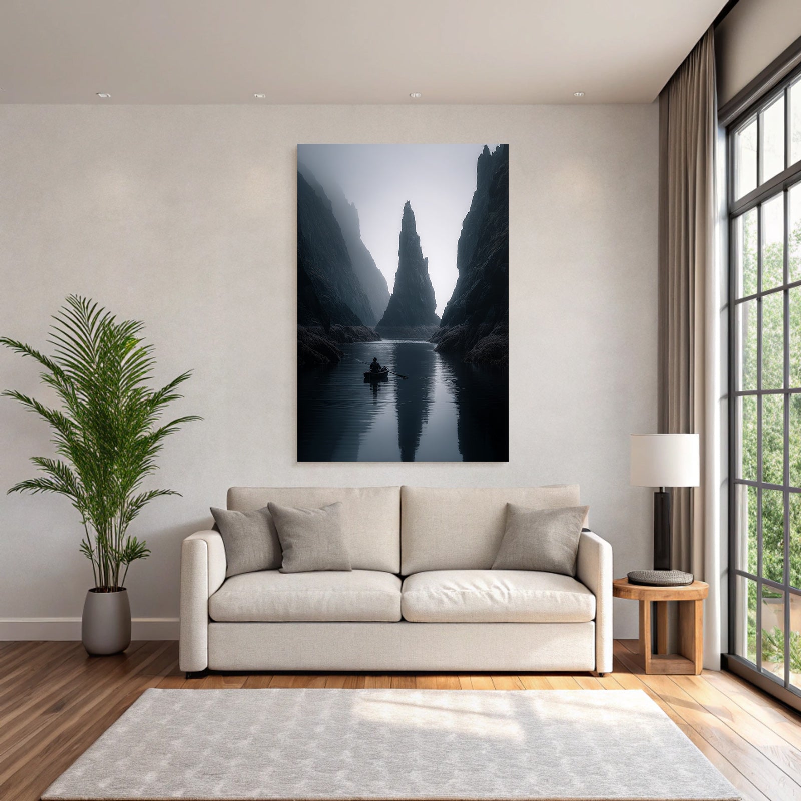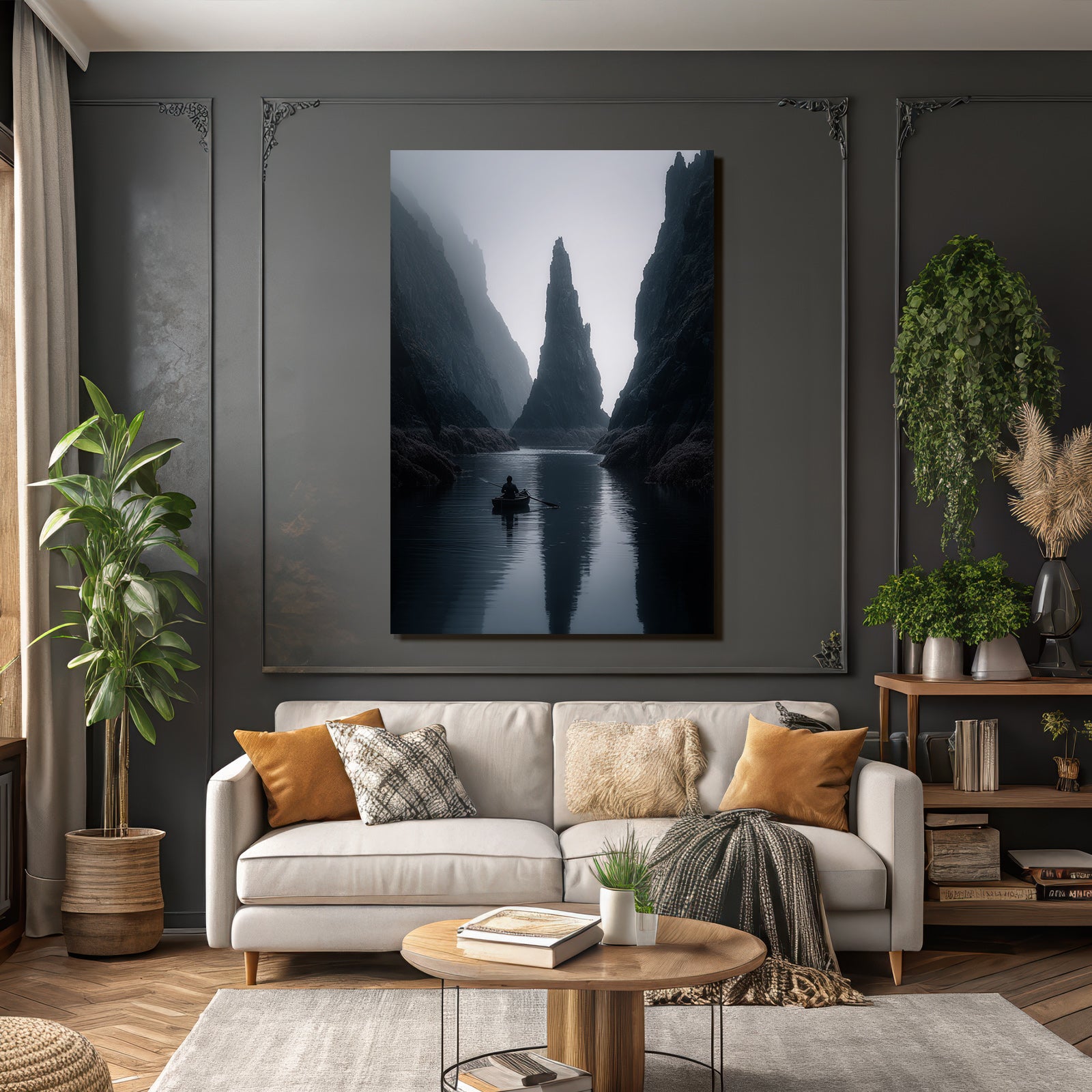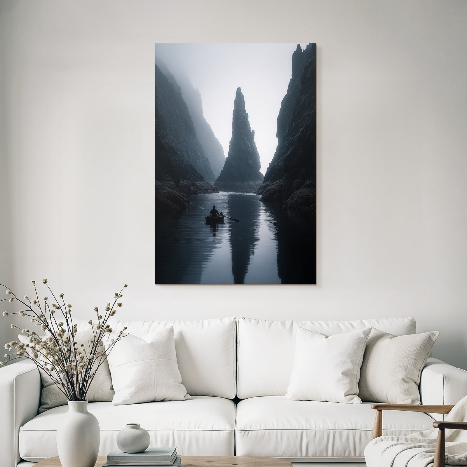 Mit dem Werk „Yoga Meditation Ruhige Nebelige Landschaft Käper In Ruhigem Wasser Mit Klippen Im Hintergrund“ im Stil Yoga und Meditation gestaltest Du Dein Wartezimmer oder Deine Hotel-Lobby eindrucksvoll und modern – auf Stoff im FameFrame™.