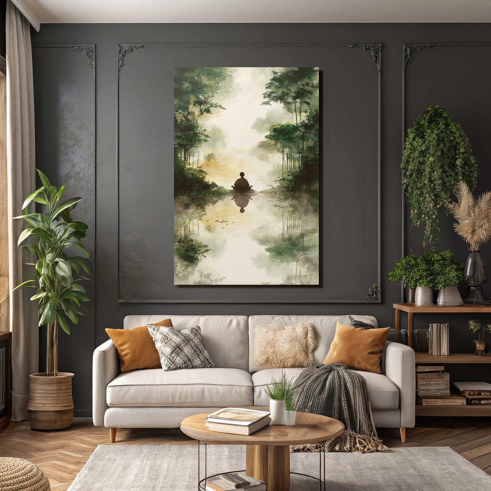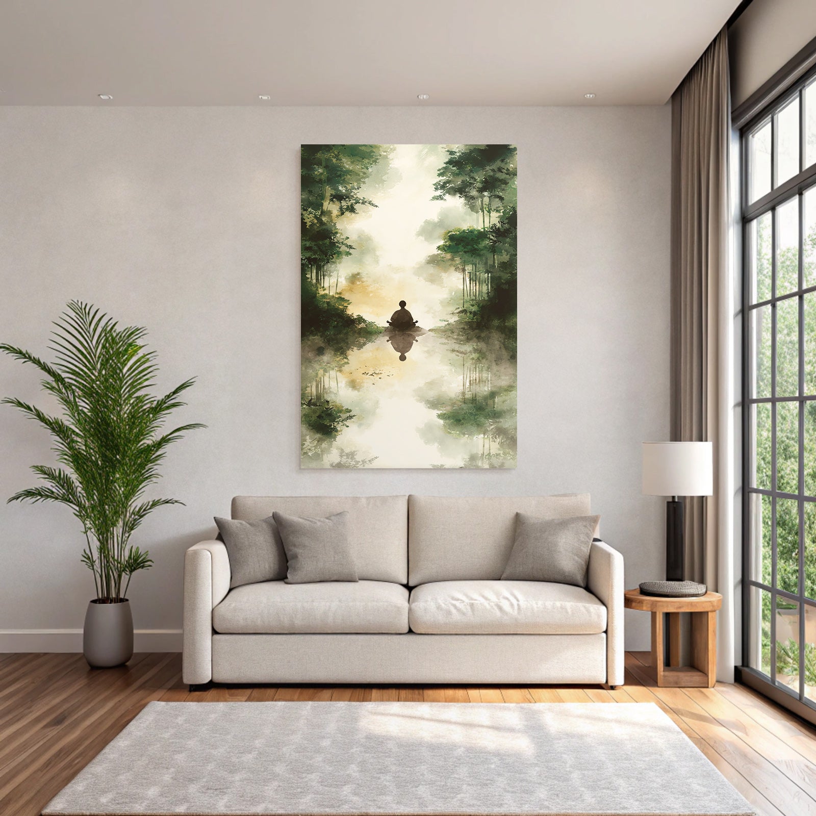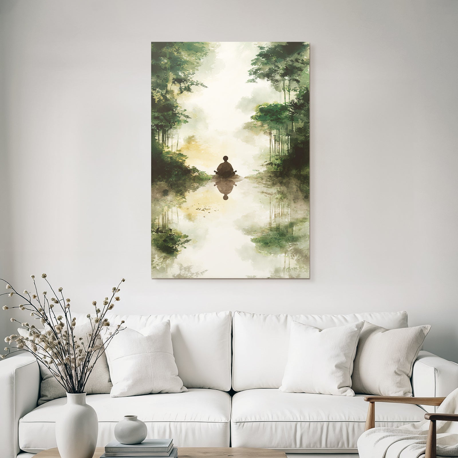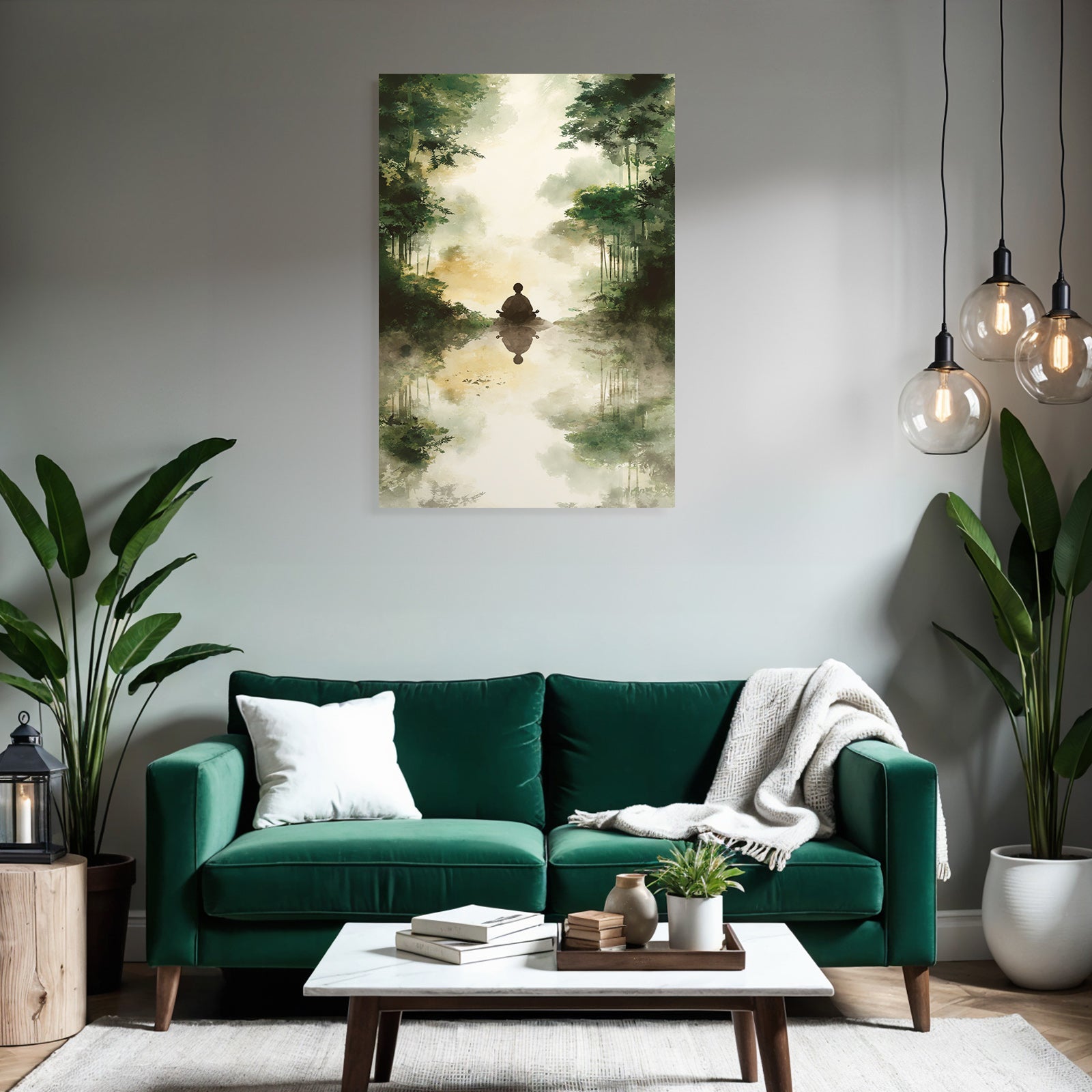 Ein Meisterwerk im Stil Yoga und Meditation: „Yoga Meditation Ruhige Szene Meditierender Figur In Natur Ausblick“ fängt die Atmosphäre und die typischen Elemente dieses Stils ein und wird im FameFrame™ zum zeitlosen Hingucker.