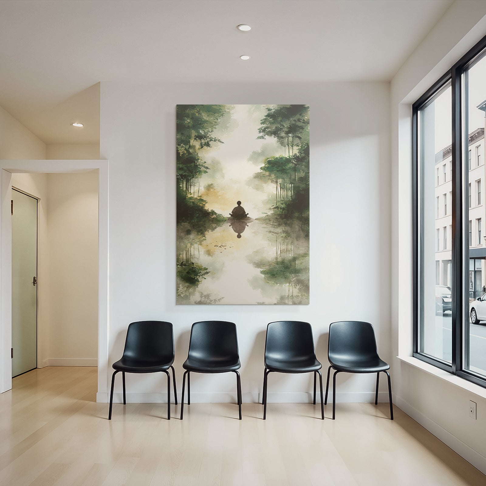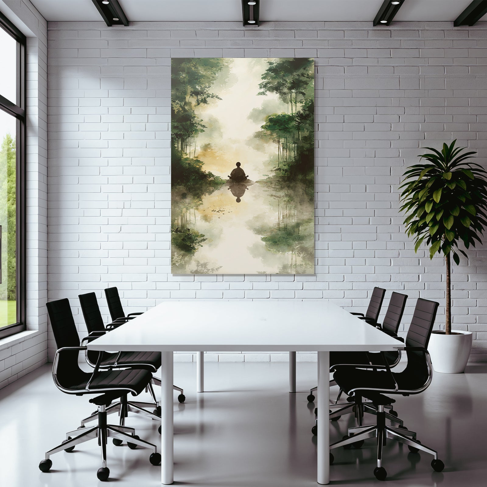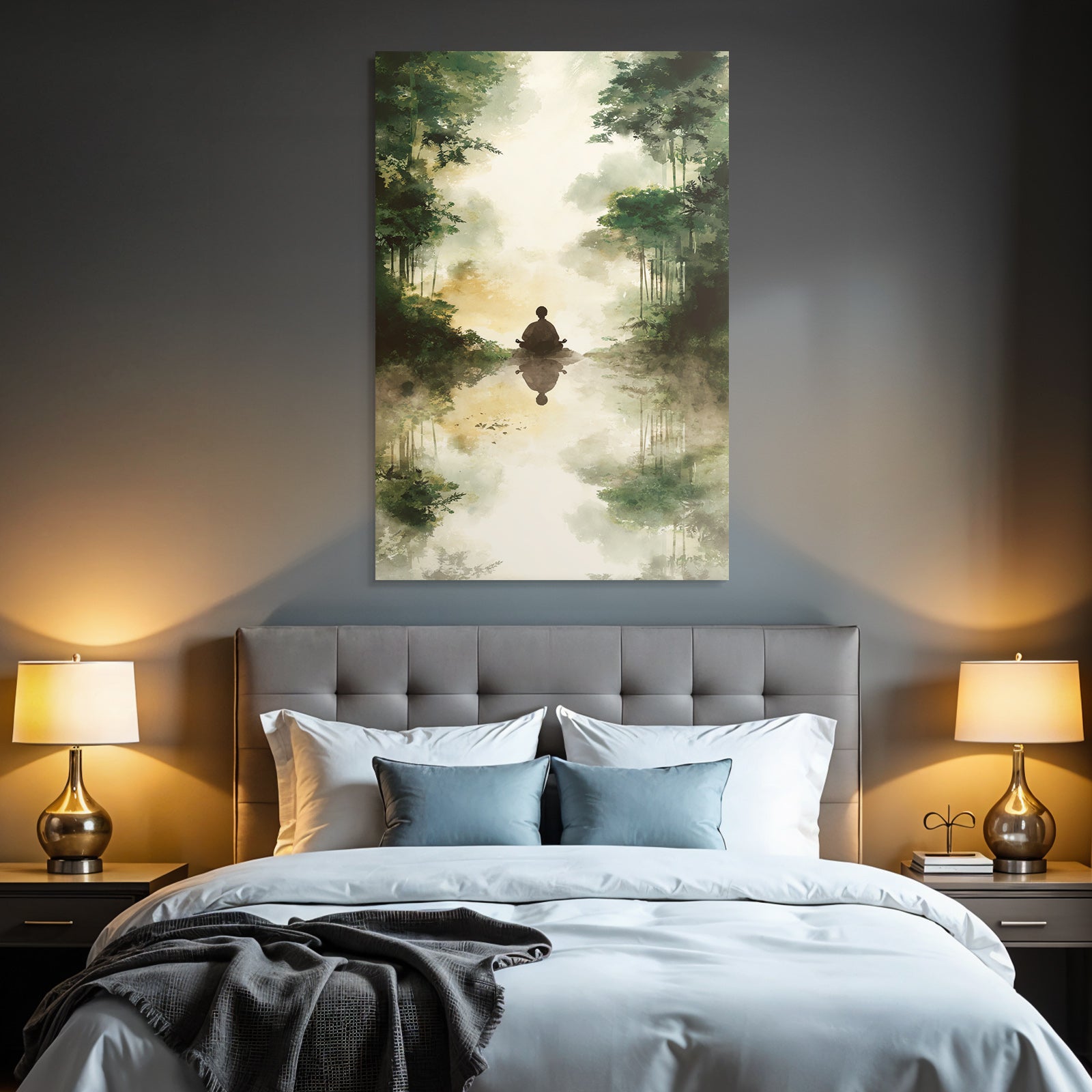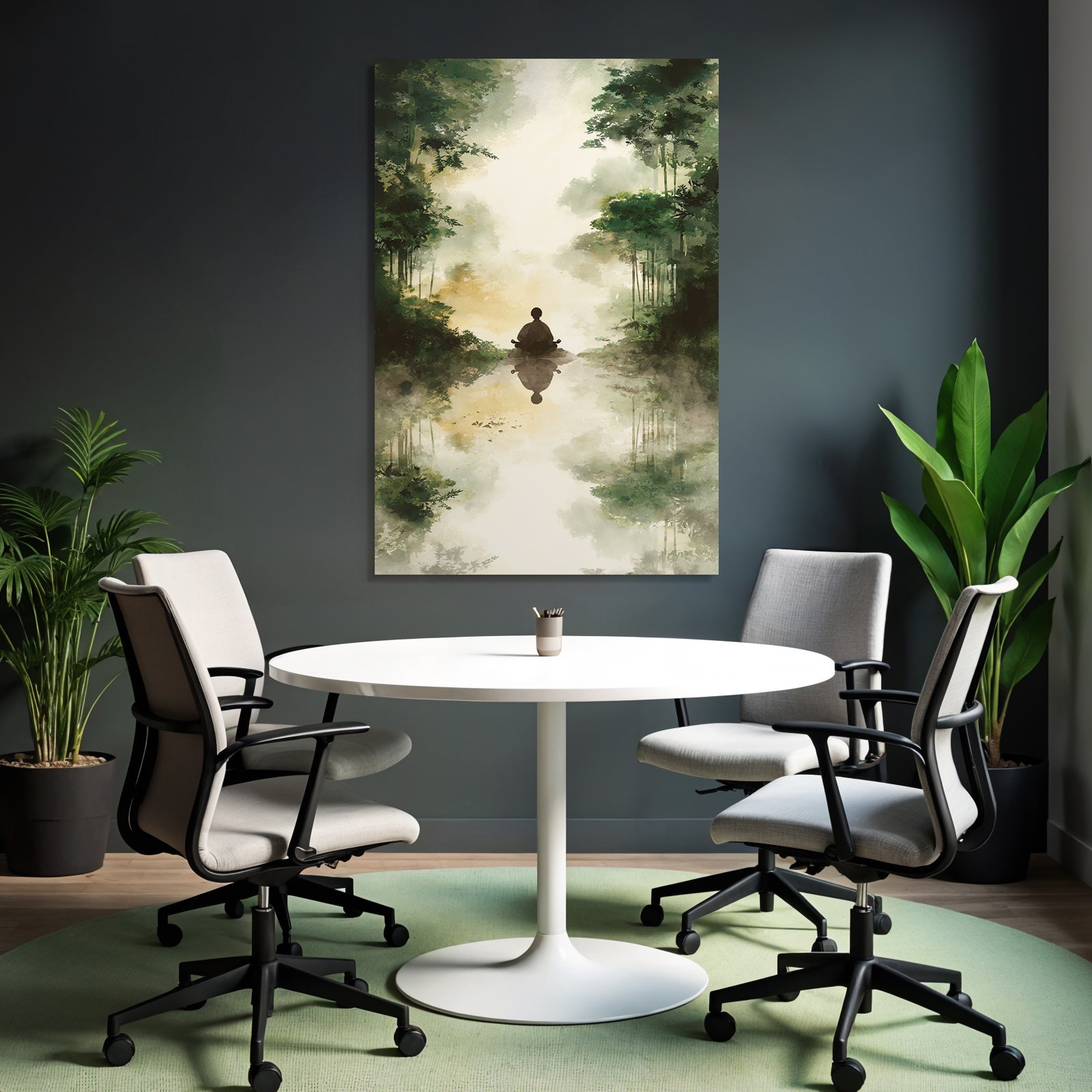 Ein Meisterwerk im Stil Yoga und Meditation: „Yoga Meditation Ruhige Szene Meditierender Figur In Natur Ausblick“ fängt die Atmosphäre und die typischen Elemente dieses Stils ein und wird im FameFrame™ zum zeitlosen Hingucker.