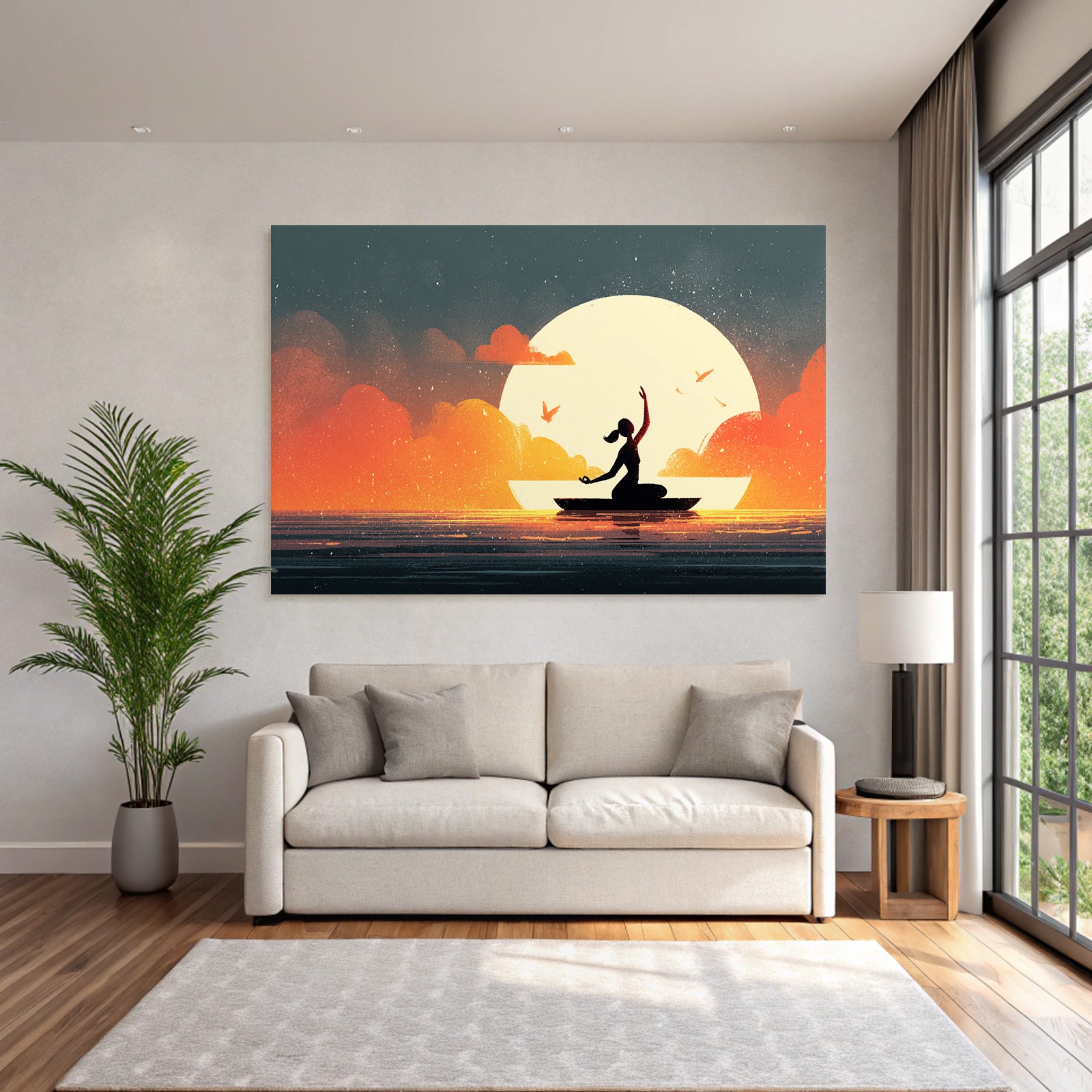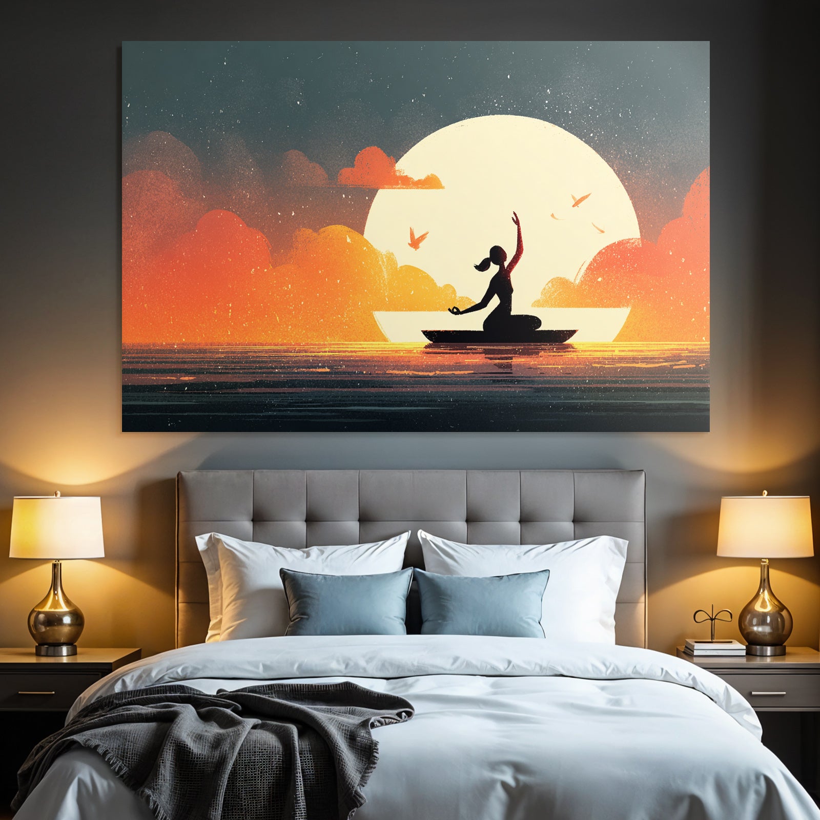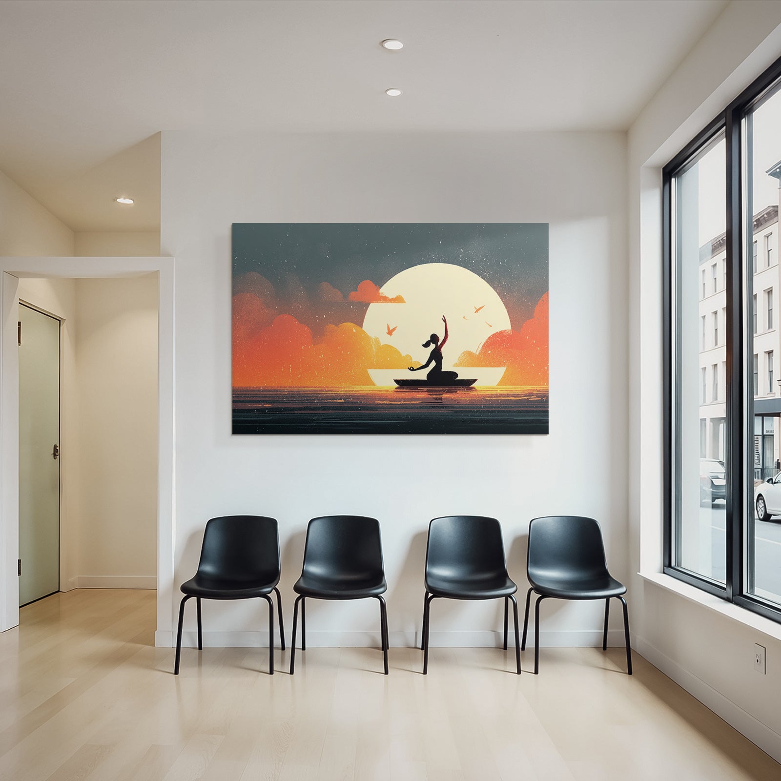 Setzen Sie auf zeitlose Ästhetik. Das Werk „Yoga Meditation Stille Meditation Im Boot Bei Sonnenuntergang“ im Stil Yoga und Meditation ist eine Investition in Ihr Ambiente, die dank des austauschbaren FameFrame™ immer modern bleibt.
