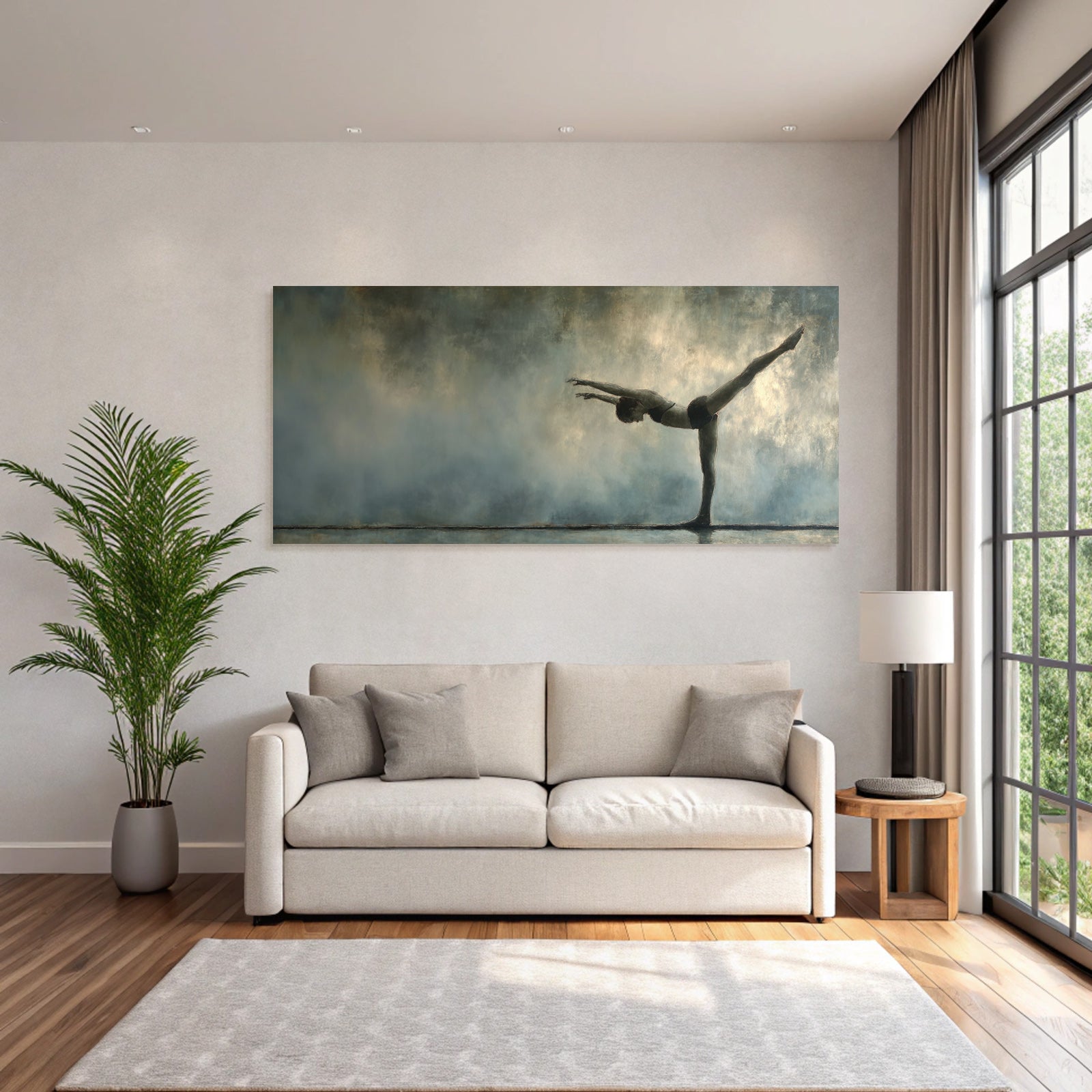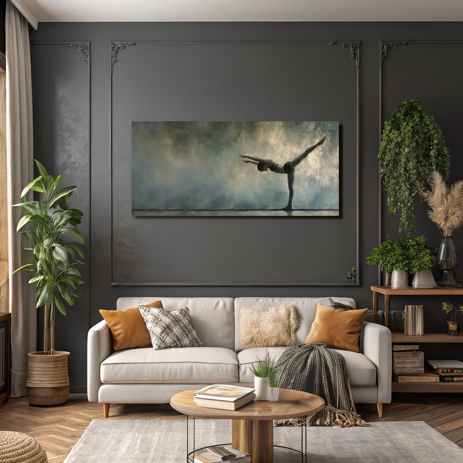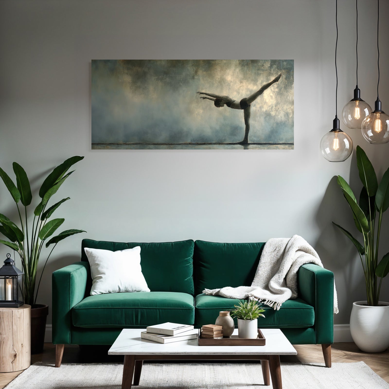 Setze stilvolle Akzente mit Kunst im Look von Yoga und Meditation. Das Werk „Yoga Meditation Tanzende Figur Mit Sanftem Hintergrund EleganzUnd Bewegung“ entfaltet im edlen FameFrame™ seine volle Wirkung.