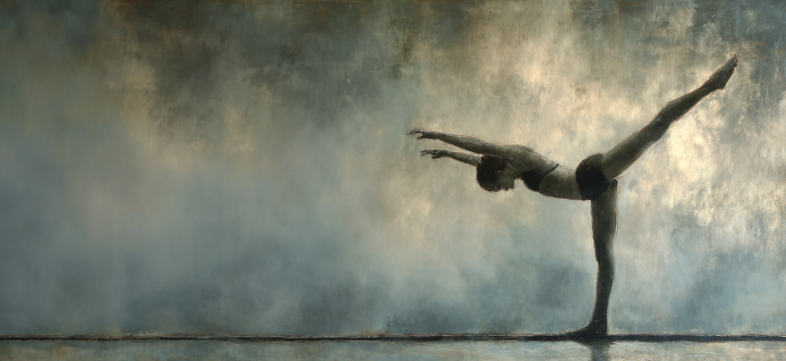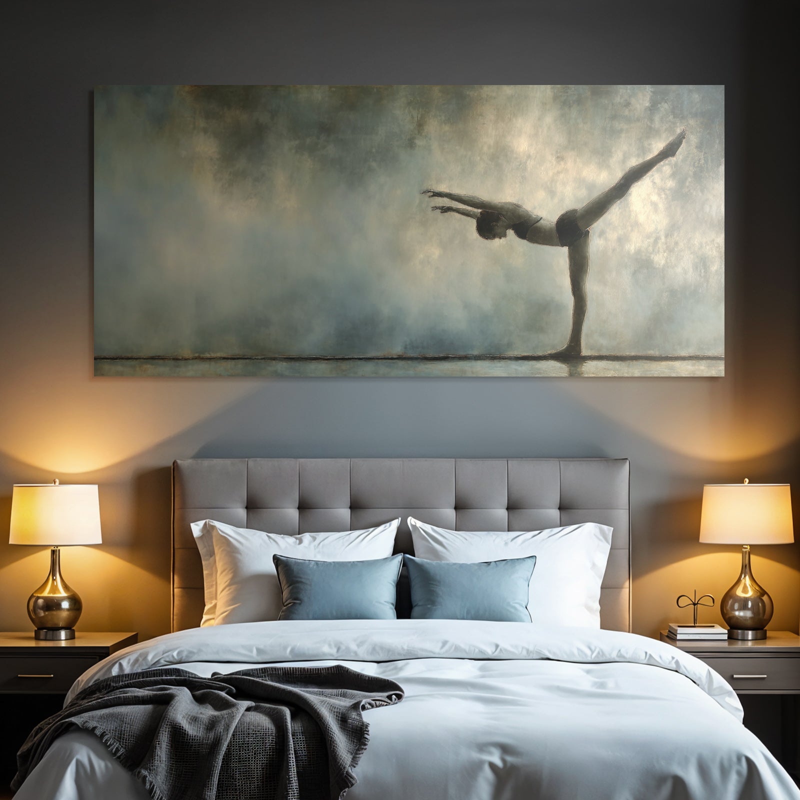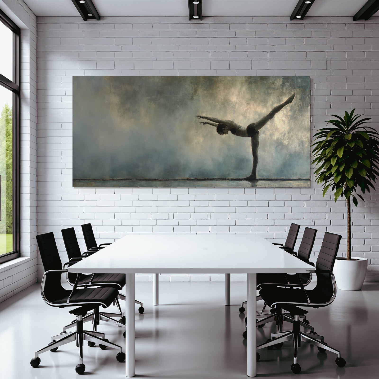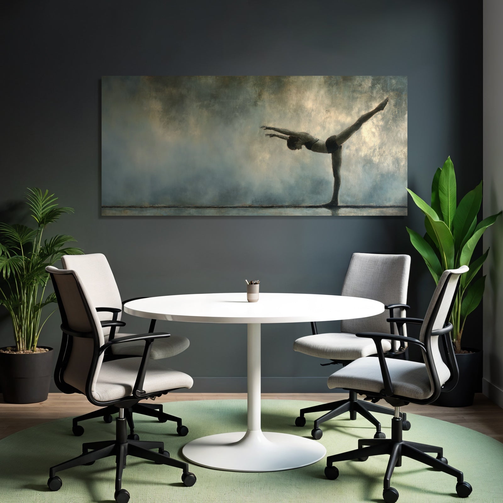 Setze stilvolle Akzente mit Kunst im Look von Yoga und Meditation. Das Werk „Yoga Meditation Tanzende Figur Mit Sanftem Hintergrund EleganzUnd Bewegung“ entfaltet im edlen FameFrame™ seine volle Wirkung.