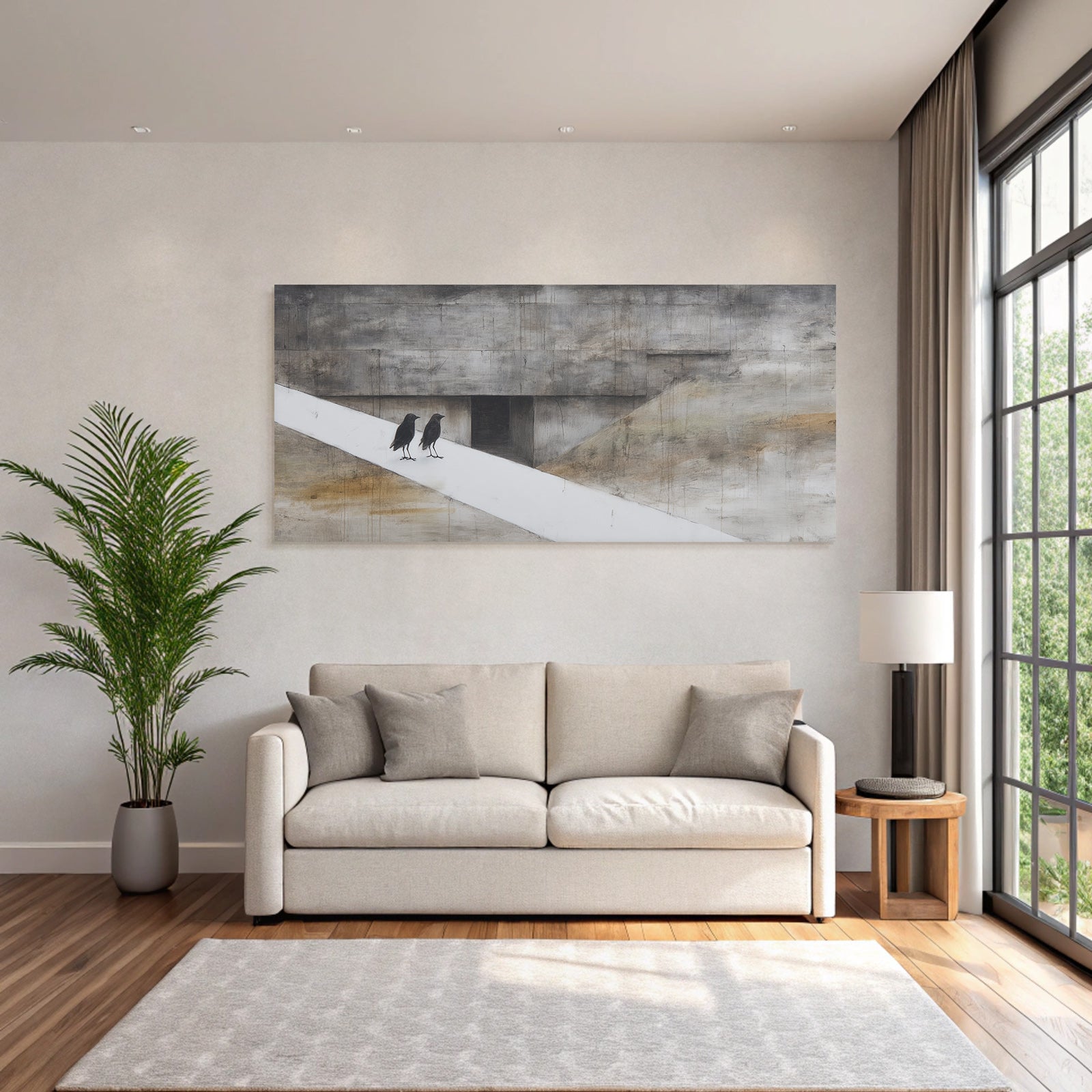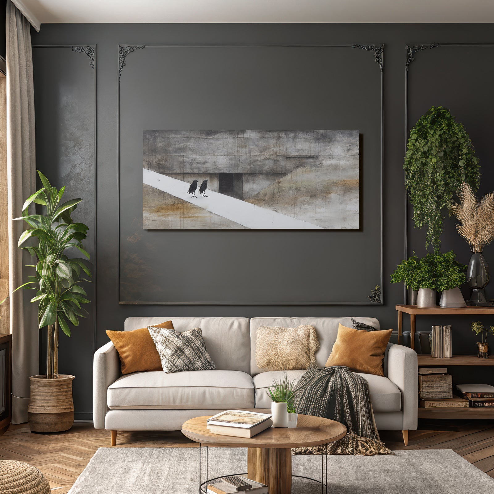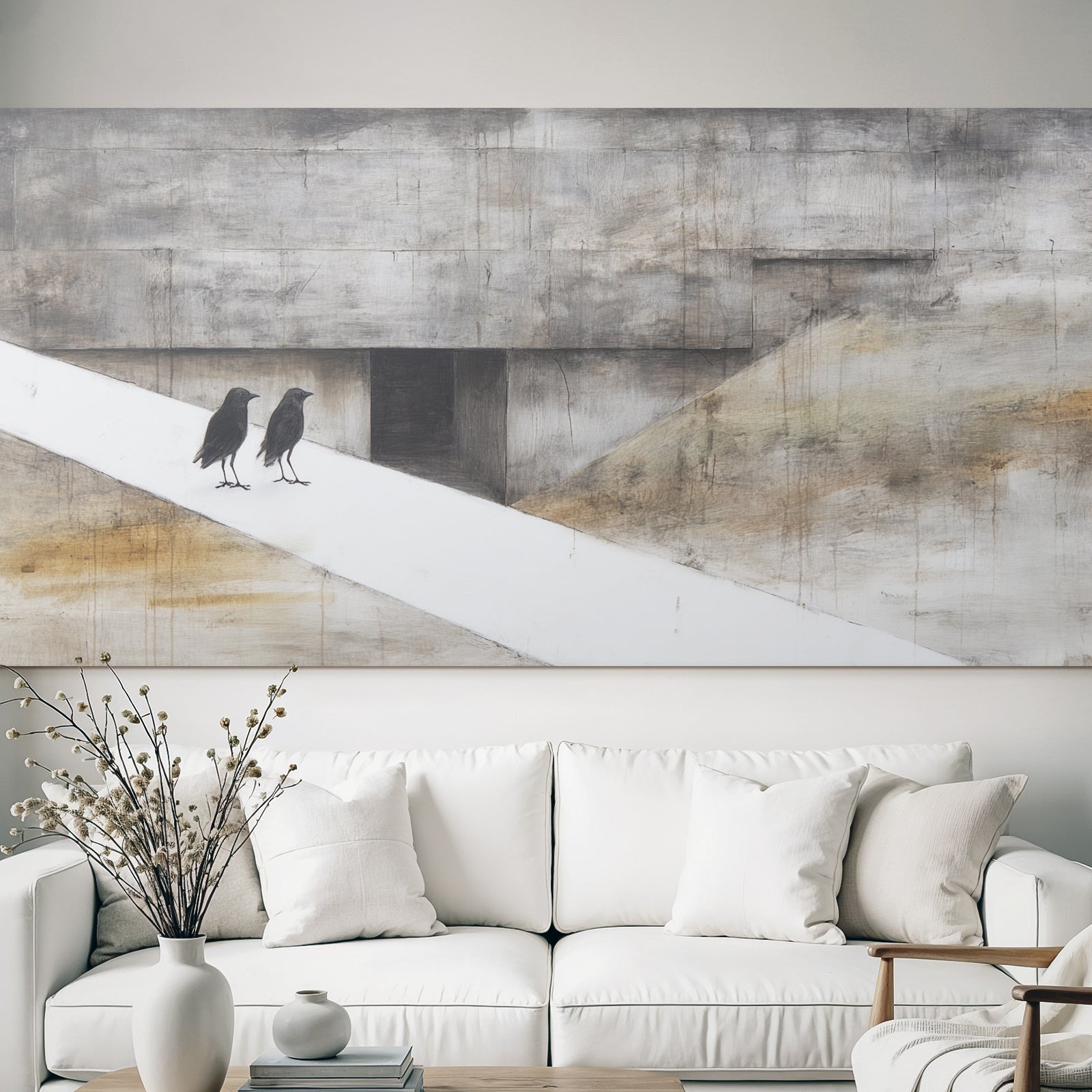 Lassen Sie „Yoga Meditation Zwei Schwarze Vögel Auf Einem Weissen Pfad Graür Hintergrund Minimalistische Kunst“ für sich sprechen. Dieses Werk im Yoga und Meditation-Design wird durch die Präsentation im FameFrame™ zu einem echten Galerie-Stück für Ihr Zuhause.