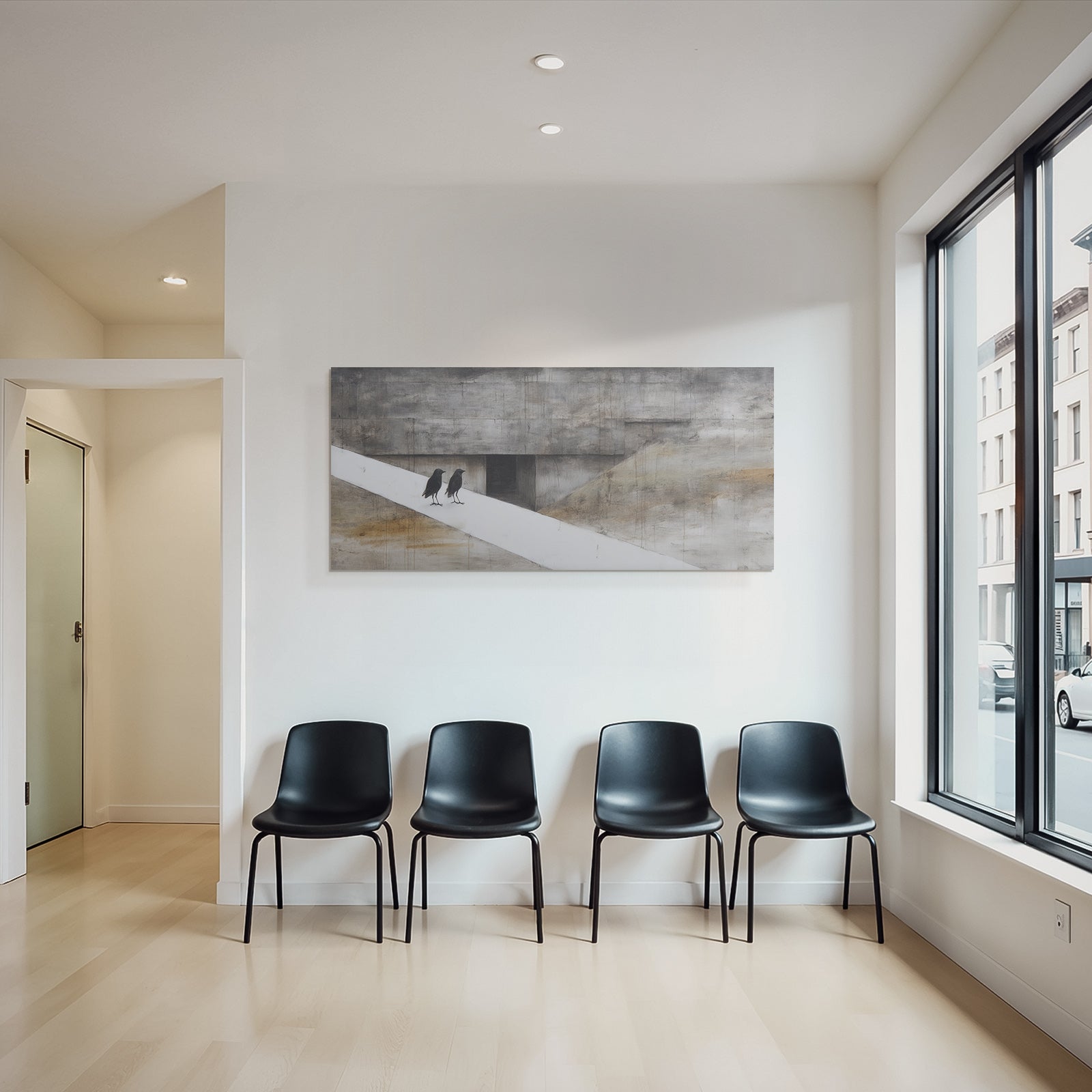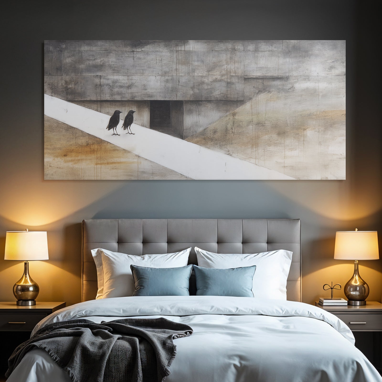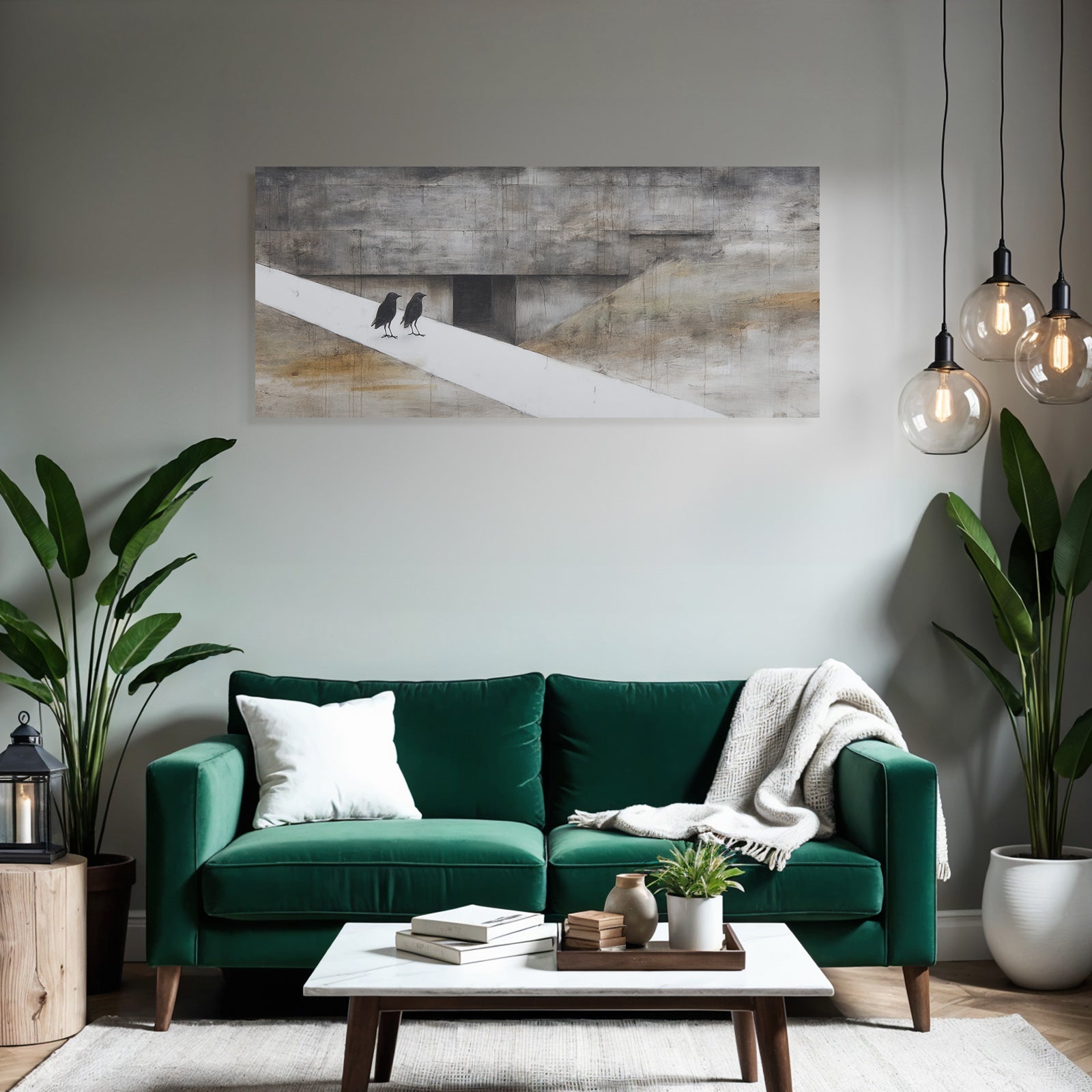 Lassen Sie „Yoga Meditation Zwei Schwarze Vögel Auf Einem Weissen Pfad Graür Hintergrund Minimalistische Kunst“ für sich sprechen. Dieses Werk im Yoga und Meditation-Design wird durch die Präsentation im FameFrame™ zu einem echten Galerie-Stück für Ihr Zuhause.