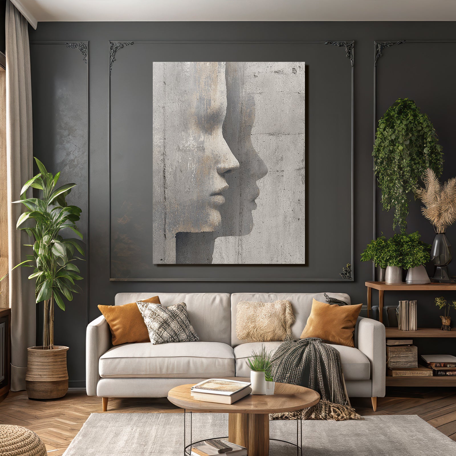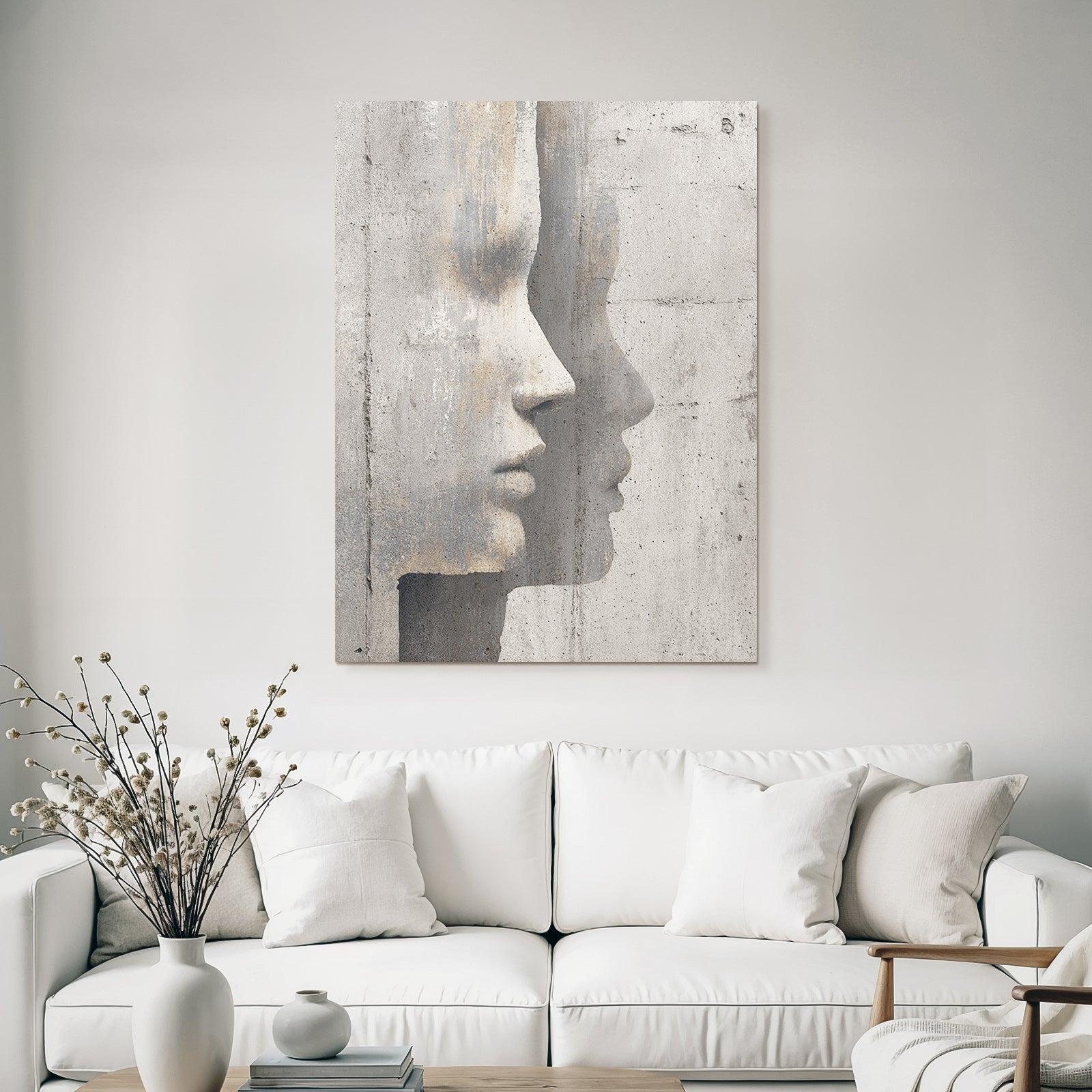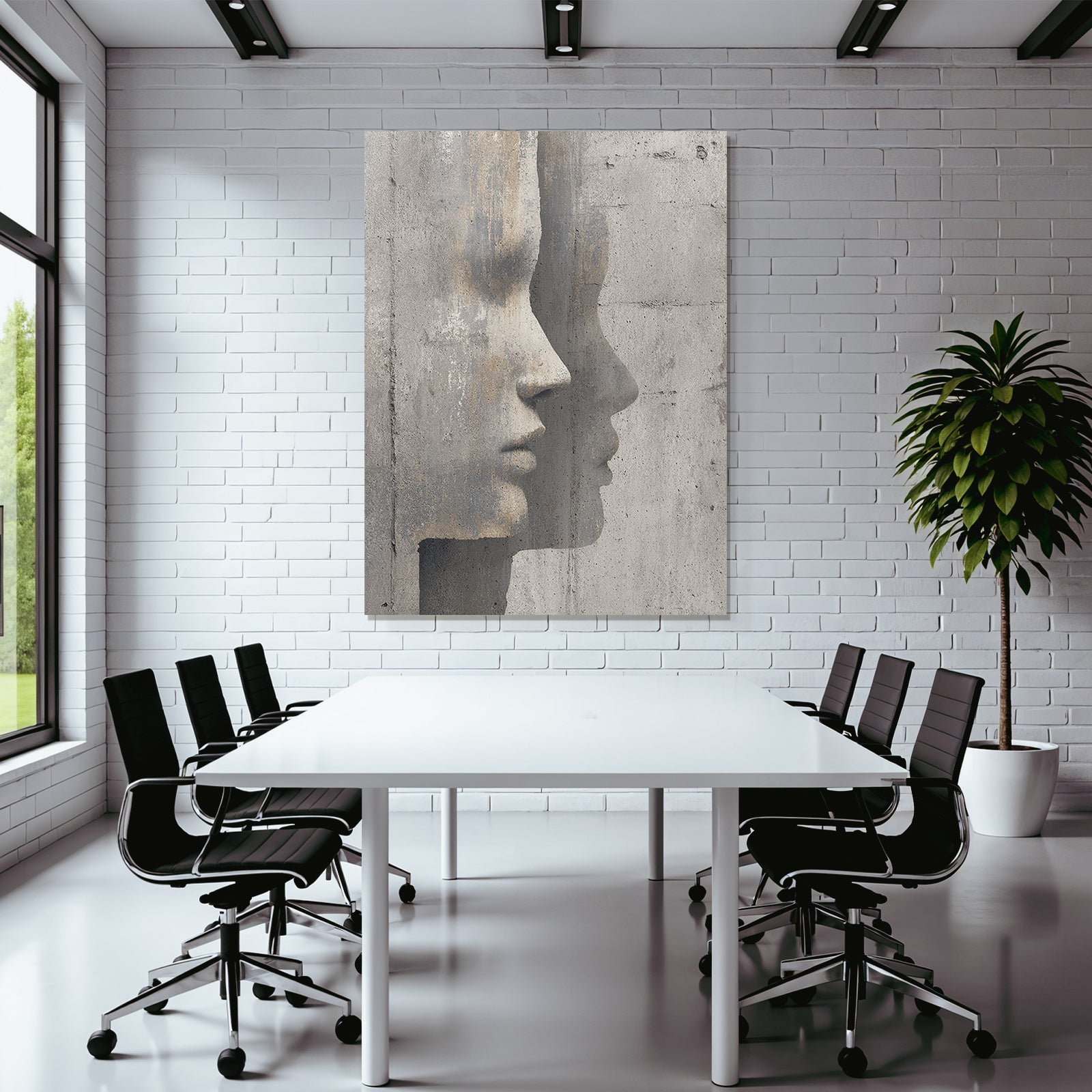Ob Flur, Wohnraum oder Wartebereich – das Motiv „„ Zwei Gesichter Verschmelzung Beton Textur““ im Stil Industrial wirkt durch den hochwertigen FameFrame besonders modern.